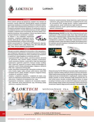 Loktech O FIRMIE Firma Loktech zajmuje się dystrybucją urządzeń oraz narzędzi do produkcji i serwisu elektroniki. Wysoką jakość naszych produktów gwarantuje współpraca ze światowymi liderami w dziedzinie elektroniki, a także nasze doświadczenie zdobywane na rynku od wielu lat. Prowadzimy sprzedaż hurtową i detaliczną. W naszej pracy wierzymy, że podstawą sukcesu w branży elektronicznej są nie tylko najlepsze narzędzia i urządzenia oraz inne produkty, ale również wiedza i kompetencje biznesowe, które posiadamy i którymi się chętnie dzielimy z naszymi klientami na szkoleniach i audytach. To właśnie u nas znajdziesz niezawodne narzędzia i urządzenia najlepszych producentów, takich jak Ash Vision, której Loktech jest przedstawicielem w Polsce (mikroskopy wideo) oraz ponadto firm: Piergiacomi, DPV-elektronik, Ideal-tek, Wiha, C.K, Olamef, Vision, Jalas, Abeba, Sievi, 3M, CAB, WELLER, JBC, Plato, których jesteśmy dystrybutorem. lutownice i sprzęt serwisowy: stacje lutownicze, rączki lutownicze i akcesoria, groty, stacje rozlutownicze i urządzenia Hot Air, ramy do mocowania PCB, wyciągi dymów i oparów, podgrzewacze i płyty grzewcze, dysze rozlutownicze, tygle lutownicze materiały lutownicze: topniki, spoiwa lutownicze, pasty lutownicze, tasiemki rozlutownicze NOWOŚCI Wideomikroskopy Full HD firmy Ash Vision przeznaczone są do prac inspekcyjnych w kilku wariantach (table, Vesa). Dają możliwość operatorowi pracy w wygodnej pozycji z zachowaniem ergonomii i przekazują obraz w jakości full HD (1080p). Oferują niesamowitą jakość obrazu i powiększenie w połączeniu z doskonałym odwzorowaniem kolorów, pozwalając dostrzec nawet najmniejsze szczegóły. Wyróżniają się szerokim zakresem dynamiki ekspozycji, redukcją szumów cyfrowych i automatycznym balansem bieli. OFERTA loktech.elektronikab2b.pl 206 Oferujemy produkty najlepszych producentów w kilku specjalistycznych kategoriach wyposażenia i zaopatrzenia produkcji. Podstawę stanowią produkty antystatyczne, które uzupełniane są narzędziami i urządzeniami wspomagającymi produkcję elektroniki: wyposażenie ESD: obuwie, odzież, uziemienia osobiste, akcesoria do uziemienia, maty, mierniki i testery, jonizatory, oznakowania, środki utrzymania czystości, a także taśmy i kleje oraz dyspensery opakowania i pojemniki: pojemniki z tworzyw, kuwety i szuflady, tacki i pojemniki, pojemniki na szpule, wkłady pochłaniające do opakowań, pianki i wkłady zabezpieczające, magazyny i akcesoria PCB, folie i opakowania foliowe ESD meble i stanowiska montażowe ESD: stanowiska montażowe i akcesoria, krzesła, regały i szafy, uchwyty i półki ścienne, wózki ESD narzędzia ręczne: pęsety, wkrętaki, szczypce, ściągacze izolacji, narzędzia do zaciskania, lusterka maszyny i urządzenia: separatory i urządzenia do cięcia, urządzenia do krępowania komponentów, liczarki do komponentów, odkurzacze, urządzenia do podawania śrub, wagi wyposażenie montażowe: urządzenia do mocowania, dyspensery i dozowniki, lampy stanowiskowe, lupy, mikroskopy, pipety próżniowe, preparaty chemiczne Wideomikroskop Full HD VESA jest uniwersalny dzięki możliwości konfiguracji urządzenia według własnych potrzeb za pomocą akcesoriów. Dzięki swojej budowie pozwala na obserwację dużego obszaru, idealnie nadaje się do prac konserwatorskich, inspekcyjnych, naprawczych itp. System pozwala na pomiar elementów dzięki wbudowanej sieci XY oraz funkcji kursora, ponadto umożliwia oglądanie obrazu na więcej niż jednym monitorze, przez co znakomicie nadaje się do przeprowadzania różnego rodzaju szkoleń oraz prezentacji a także podwyższenia skuteczności inspekcji i diagnozowania uszkodzeń. Ma oświetlenie LED. Loktech, ul. Wronia 23/25, 87-800 Włocławek tel. 54 413 10 10, faks 54 413 10 10, [email protected], www.loktech.com.pl I N F O R M AT O R R Y N KO W Y E L E K T R O N I K I 2016
