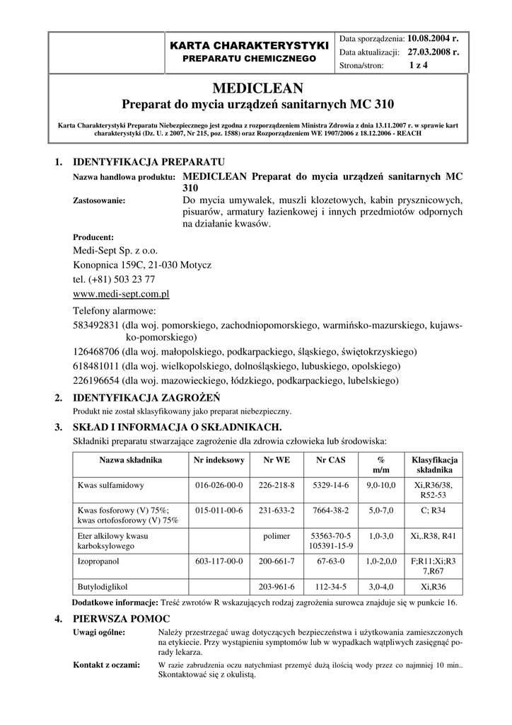 KARTA CHARAKTERYSTYKI PREPARATU CHEMICZNEGO Data sporządzenia: 10.08.2004 r. Data aktualizacji: 27.03.2008 r. Strona/stron: 1z4 MEDICLEAN Preparat do mycia urządzeń sanitarnych MC 310 Karta Charakterystyki Preparatu Niebezpiecznego jest zgodna z rozporządzeniem Ministra Zdrowia z dnia 13.11.2007 r. w sprawie kart charakterystyki (Dz. U. z 2007, Nr 215, poz. 1588) oraz Rozporządzeniem WE 1907/2006 z 18.12.2006 - REACH 1. IDENTYFIKACJA PREPARATU Nazwa handlowa produktu: MEDICLEAN Preparat do mycia urządzeń sanitarnych MC 310 Zastosowanie: Do mycia umywalek, muszli klozetowych, kabin prysznicowych, pisuarów, armatury łazienkowej i innych przedmiotów odpornych na działanie kwasów. Producent: Medi-Sept Sp. z o.o. Konopnica 159C, 21-030 Motycz tel. (+81) 503 23 77 www.medi-sept.com.pl Telefony alarmowe: 583492831 (dla woj. pomorskiego, zachodniopomorskiego, warmińsko-mazurskiego, kujawsko-pomorskiego) 126468706 (dla woj. małopolskiego, podkarpackiego, śląskiego, świętokrzyskiego) 618481011 (dla woj. wielkopolskiego, dolnośląskiego, lubuskiego, opolskiego) 226196654 (dla woj. mazowieckiego, łódzkiego, podkarpackiego, lubelskiego) 2. IDENTYFIKACJA ZAGROŻEŃ Produkt nie został sklasyfikowany jako preparat niebezpieczny. 3. SKŁAD I INFORMACJA O SKŁADNIKACH. Składniki preparatu stwarzające zagrożenie dla zdrowia człowieka lub środowiska: Nazwa składnika Nr indeksowy Nr WE Nr CAS % m/m Klasyfikacja składnika Kwas sulfamidowy 016-026-00-0 226-218-8 5329-14-6 9,0-10,0 Xi,R36/38, R52-53 Kwas fosforowy (V) 75%; kwas ortofosforowy (V) 75% 015-011-00-6 231-633-2 7664-38-2 5,0-7,0 C; R34 polimer 53563-70-5 105391-15-9 1,0-3,0 Xi,.R38, R41 200-661-7 67-63-0 1,0-2,0,0 F;R11;Xi;R3 7,R67 203-961-6 112-34-5 3,0-4,0 Xi,R36 Eter alkilowy kwasu karboksylowego Izopropanol 603-117-00-0 Butylodiglikol Dodatkowe informacje: Treść zwrotów R wskazujących rodzaj zagrożenia surowca znajduje się w punkcie 16. 4. PIERWSZA POMOC Uwagi ogólne: Należy przestrzegać uwag dotyczących bezpieczeństwa i użytkowania zamieszczonych na etykiecie. Przy wystąpieniu symptomów lub w wypadkach wątpliwych zasięgnąć porady lekarza. Kontakt z oczami: W razie zabrudzenia oczu natychmiast przemyć dużą ilością wody przez co najmniej 10 min.. Skontaktować się z okulistą. KARTA CHARAKTERYSTYKI PREPARATU CHEMICZNEGO Data sporządzenia: 10.08.2004 r. Data aktualizacji: 27.03.2008 r. Strona/stron: 2z4 MEDICLEAN Preparat do mycia urządzeń sanitarnych MC 310 Karta Charakterystyki Preparatu Niebezpiecznego jest zgodna z rozporządzeniem Ministra Zdrowia z dnia 13.11.2007 r. w sprawie kart charakterystyki (Dz. U. z 2007, Nr 215, poz. 1588) oraz Rozporządzeniem WE 1907/2006 z 18.12.2006 - REACH Kontakt ze skórą: W razie kontaktu ze skórą przemyć wodą z mydłem, a następnie zastosować krem ochronny. Zdjąć zanieczyszczone ubranie. W przypadku wystąpienia zmian na skórze (zaczerwienienie, swędzenie) skonsultować się z lekarzem. Zatrucie inhalacyjne: Świeże powietrze i w razie potrzeby konsultacja z lekarzem. Połknięcie: W razie spożycia nie wywoływać wymiotów. Natychmiast skonsultować się z lekarzem. Pokazać opakowanie, etykietę lub kartę charakterystyki. 5. POSTĘPOWANIE W PRZYPADKU POŻARU Zagrożenie pożarowe: Środki gaśnicze: 6. produkt niepalny. w przypadku pożaru stosować podręczny sprzęt gaśniczy. POSTĘPOWANIE W PRZYPADKU NIEZAMIERZONEGO UWOLNIENIA DO ŚRODOWISKA W przypadku dużego wycieku posypać rozlany produkt materiałem chłonnym (piasek, trociny), zebrać do odpowiednio oznakowanego, zamykanego pojemnika i przekazać do utylizacji. Powierzchnie spłukac wodą. Neutralizować przy pomocy materiałów wiążących kwasy (np. mączka wapienna). 7. POSTĘPOWANIE Z PREPARATEM I JEGO MAGAZYNOWANIE Postępowanie z preparatem – środki ostrożności: Przechowywanie: 8. Zachować ostrożność i staranność w dozowaniu preparatu. Nie należy spożywać posiłków, pić napojów oraz palić papierosów podczas pracy z preparatem. Myć ręce po kontakcie z preparatem i w razie potrzeby zastosować krem do rąk. Produkt przechowywać w szczelnie zamkniętych i oznakowanych pojemnikach. W bezpiecznej odległości od substancji alkalicznych. Nie przechowywać w pobliżu środków spożywczych. KONTROLA NARAŻENIA I ŚRODKI OCHRONY INDYWIDUALNEJ Parametry kontrolne: Dla składników preparatu nie ustalono wartości najwyższych dopuszczalnych stężeń czynników szkodliwych w środowisku pracy. Środki ochrony indywidualnej: Układ oddechowy: Nie są wymagane Ręce: Rękawice ochronne Oczy: Okulary ochronne Najwyższe dopuszczalne stężenia: Nr indeksowy NDS(mg/m3) NDSCh (mg/m3) 603-117-00-0 900 1200 015-011-00-6 1 2 (wg Rozporządzenia MPiPS z dn. 29 listopada 2002; Dz. U. Nr 217, poz.1833) 9. WŁAŚCIWOŚCI FIZYCZNE I CHEMICZNE Postać: Barwa: Zapach: pH: Temperatura wrzenia: Temperatura topnienia: Prężność par: ciecz ciemno różowy świeży, koloński koncentratu – 1,0 ok.98 C0 brak danych brak danych KARTA CHARAKTERYSTYKI PREPARATU CHEMICZNEGO Data sporządzenia: 10.08.2004 r. Data aktualizacji: 27.03.2008 r. Strona/stron: 3z4 MEDICLEAN Preparat do mycia urządzeń sanitarnych MC 310 Karta Charakterystyki Preparatu Niebezpiecznego jest zgodna z rozporządzeniem Ministra Zdrowia z dnia 13.11.2007 r. w sprawie kart charakterystyki (Dz. U. z 2007, Nr 215, poz. 1588) oraz Rozporządzeniem WE 1907/2006 z 18.12.2006 - REACH Gęstość: Rozpuszczalność w wodzie: 10. 1,07g/m3 pełna STABILNOŚĆ I REAKTYWNOŚĆ Materiały powodujące niebezpieczne reakcje: Niebezpieczne produkty rozpadu: 11. Alkalia, metale, podchloryn. Nie są znane przy stosowanie zgodnie z przeznaczeniem. INFORMACJA TOKSYKOLOGICZNA Skutki działania preparatu na: Skórę: Długotrwałe narażenie może powodować zaczerwienienie i łuszczenie się naskórka u osób uczulonych na preparaty chemiczne i kwasy. Oczy: Może wystąpić podrażnienie, zaczerwienienie, łzawienie w razie be