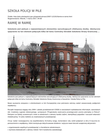SZKOŁA POLICJI W PILE Źródło: http://pila.szkolapolicji.gov.pl/spp/aktualnosci/2007-1/2220,Ramie-w-ramie.html Wygenerowano: Wtorek, 7 marca 2017, 04:58 RAMIĘ W RAMIĘ Szkolenie jest jednym z najważniejszych elementów warunkujących efektywną służbę. Identyczne spojrzenie na ten element połączyło kilka lat temu Centralny Ośrodek Szkolenia Straży Granicznej ... Szkolenie jest jednym z najważniejszych elementów warunkujących efektywną służbę. Identyczne spojrzenie na ten element połączyło kilka lat temu Centralny Ośrodek Szkolenia Straży Granicznej w Koszalinie i Szkołę Policji w Pile. Nowe wyzwania związane z członkostwem w Unii Europejskiej oraz pokrewne zakresy zadań zaowocowały podjęciem współpracy. Początki kooperacji sięgają roku 2004 i udziału przedstawicieli COSSG w warsztatach wykładowców informatyki, warsztatach dot. kradzieży sygnału telewizyjnego, sympozjum ?Pragmatyka zwalczania przestępczości prania pieniędzy w Polsce?. Policjanci ze Szkoły uczestniczyli z kolei w szkoleniach z zakresu handlu ludźmi, identyfikacji pojazdów i naruszeń własności intelektualnej. To tylko niektóre ze zrealizowanych przedsięwzięć. Chcąc nadać rozwijającemu się współdziałaniu formalną rangę, komendanci obu szkół podpisali w dniu 9 stycznia br. porozumienie o współpracy, które konstytuuje dotychczasowe działania i wytycza nowe kierunki wzajemnej aktywności: ● organizowanie wspólnych przedsięwzięć o charakterze szkoleniowym; ● wymiana doświadczeń z zakresu metod i form kształcenia zawodowego; ● rozwój i doskonalenie kompetencji zawodowych kadry kierowniczej i dydaktycznej; ● współdziałanie przy pozyskiwaniu funduszy unijnych na realizację zadań statutowych. (10.01.07) Ocena: 0/5 (0) Tweetnij