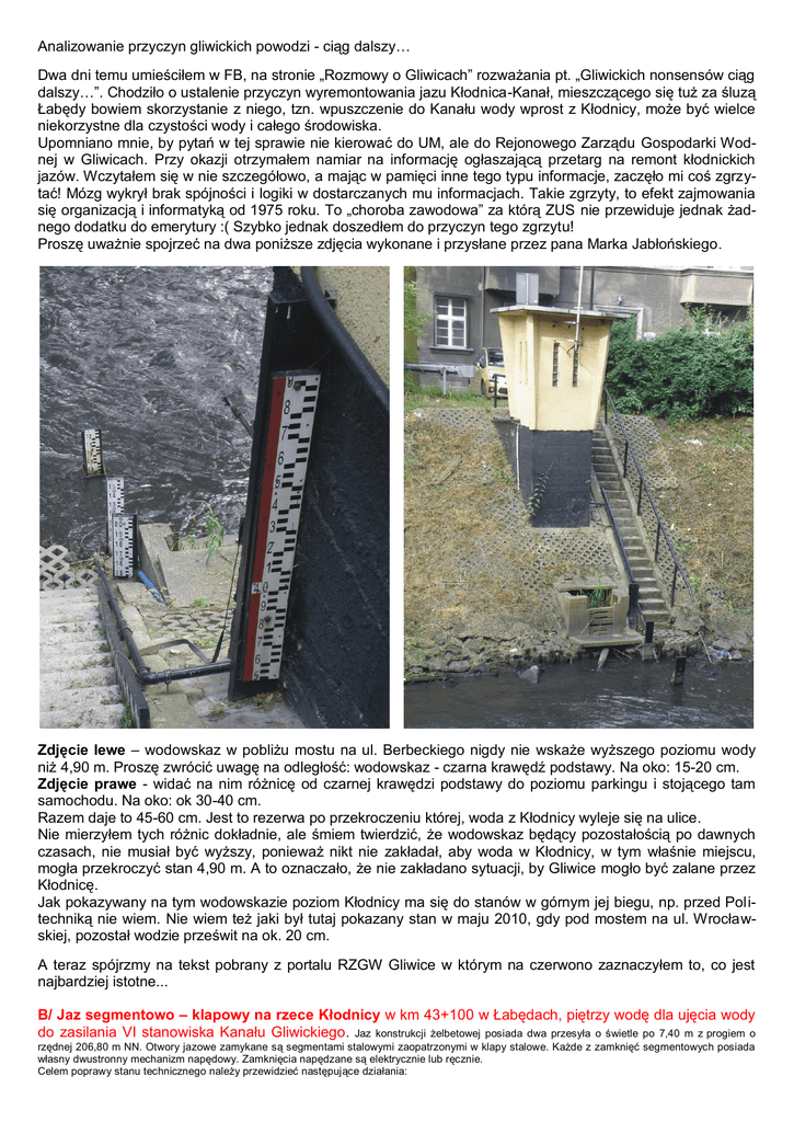 Analizowanie przyczyn gliwickich powodzi - ciąg dalszy… Dwa dni temu umieściłem w FB, na stronie „Rozmowy o Gliwicach” rozważania pt. „Gliwickich nonsensów ciąg dalszy…”. Chodziło o ustalenie przyczyn wyremontowania jazu Kłodnica-Kanał, mieszczącego się tuż za śluzą Łabędy bowiem skorzystanie z niego, tzn. wpuszczenie do Kanału wody wprost z Kłodnicy, może być wielce niekorzystne dla czystości wody i całego środowiska. Upomniano mnie, by pytań w tej sprawie nie kierować do UM, ale do Rejonowego Zarządu Gospodarki Wodnej w Gliwicach. Przy okazji otrzymałem namiar na informację ogłaszającą przetarg na remont kłodnickich jazów. Wczytałem się w nie szczegółowo, a mając w pamięci inne tego typu informacje, zaczęło mi coś zgrzytać! Mózg wykrył brak spójności i logiki w dostarczanych mu informacjach. Takie zgrzyty, to efekt zajmowania się organizacją i informatyką od 1975 roku. To „choroba zawodowa” za którą ZUS nie przewiduje jednak żadnego dodatku do emerytury :( Szybko jednak doszedłem do przyczyn tego zgrzytu! Proszę uważnie spojrzeć na dwa poniższe zdjęcia wykonane i przysłane przez pana Marka Jabłońskiego . Zdjęcie lewe – wodowskaz w pobliżu mostu na ul. Berbeckiego nigdy nie wskaże wyższego poziomu wody niż 4,90 m. Proszę zwrócić uwagę na odległość: wodowskaz - czarna krawędź podstawy. Na oko: 15-20 cm. Zdjęcie prawe - widać na nim różnicę od czarnej krawędzi podstawy do poziomu parkingu i stojącego tam samochodu. Na oko: ok 30-40 cm. Razem daje to 45-60 cm. Jest to rezerwa po przekroczeniu której, woda z Kłodnicy wyleje się na ulice. Nie mierzyłem tych różnic dokładnie, ale śmiem twierdzić, że wodowskaz będący pozostałością po dawnych czasach, nie musiał być wyższy, ponieważ nikt nie zakładał, aby woda w Kłodnicy, w tym właśnie miejscu, mogła przekroczyć stan 4,90 m. A to oznaczało, że nie zakładano sytuacji, by Gliwice mogło być zalane przez Kłodnicę. Jak pokazywany na tym wodowskazie poziom Kłodnicy ma się do stanów w górnym jej biegu, np. przed Politechniką nie wiem. Nie wiem też jaki był tutaj pokazany stan w maju 2010, gdy pod mostem na ul. Wrocławskiej, pozostał wodzie prześwit na ok. 20 cm. A teraz spójrzmy na tekst pobrany z portalu RZGW Gliwice w którym na czerwono zaznaczyłem to, co jest najbardziej istotne... B/ Jaz segmentowo – klapowy na rzece Kłodnicy w km 43+100 w Łabędach, piętrzy wodę dla ujęcia wody do zasilania VI stanowiska Kanału Gliwickiego . Jaz konstrukcji żelbetowej posiada dwa przesyła o świetle po 7,40 m z progiem o rzędnej 206,80 m NN. Otwory jazowe zamykane są segmentami stalowymi zaopatrzonymi w klapy stalowe. Każde z zamknięć segmentowych posiada własny dwustronny mechanizm napędowy. Zamknięcia napędzane są elektrycznie lub ręcznie. Celem poprawy stanu technicznego należy przewidzieć następujące działania: 1. 2. 3. 4. 5. 6. 7. przewidzieć naprawę betonów obu przyczółków i filara środkowego, wykonać analizę, inwentaryzację stanu technicznego obu klap i segmentów oraz mechanizmów wyciągowych w celu określenia ewentu alnej konieczności ich wymiany bądź tylko zabezpieczenia antykorozyjnego, wymienić uszczelnienia klap i segmentów, przewidzieć remont budynków sterowni (pokrycie dachu, ocieplenie budynku, stolarki okienno drzwiowej, instalacji elektrycznej wraz z ogrzewaniem sterowni), przewidzieć remont napędów jazu, przewidzieć naprawę betonów płyty mostu nad jazem, przewidzieć wykonanie zamknięć remontowych, 8. przewidzieć wykonanie monitoringu jazu na śluzę Łabędy. Czy wszystko jasne? Czytelnikom podpowiem jaki nonsens tkwi w takich właśnie sformułowaniach… Otóż jasno z nich wynika, że jaz na ul. Portowej nie służy do regulacji poziomu wody w Kłodnicy - w ogóle ale tylko do piętrzenia wody zasilającej Kanał Gliwicki, bo tak postanowili kiedyś „racjonalizatorzy z PRL-u”. Znaczy to też, że jaz nie zostanie opuszczony w chwili zagrożenia powodziowego miasta. Chyba że... chyba, że do RZGW zadzwoni ktoś “bardzo ważny” i wyda taki rozkaz! Od małego pamiętam takie telefoniczne interwencje. Najbardziej skuteczne były te, w wykonaniu sekretarza PZPR Portu Gliwice.. Z powyższego tekstu wynika, że monitoringiem jazu na wodowskaz przy Berbeckiego - RZGW w ogóle nie jest zainteresowany. Sądzę, że monitoringu Kłodnicy w górnych jej biegach, RZGW też nie wykonuje. Skąd więc RZGW dowie się, że poziom Kłodnicy w mieście jest już tak groźny, że najwyższa pora spuścić nadmiar jej wody do jeziora Dzierżno Duże? Ale też... skąd RZGW dowie się, że ujście potoku Ostropka do Kłodnicy już jest zalane i Ostropka zaczęła zalewanie Szpitala, Teatru i najbliższej okolicy? Brak monitoringu w newralgicznych miejscach Gliwic, może skończyć się źle dla miasta! A Kłodnica nam tego nie odpuści! Ale ciekawe... czy decydenci RZGW wiedzą o istniejących jeszcze na lewym brzegu Kłodnicy polderach osadowych, które kiedyś były głównym źródłem zasilania Portu w wodę z Kłodnicy? W wodę odstaną i pozbawioną osadów węglowych? Chyba nie wiedzą, bo terenów tak strategicznych dla Portu, nie pozwolono by bezsensownie grodzić! Kto je ogrodził? Dzierżawca czy nabywca? Kto wydał decyzję? UM czy RZGW? A może UM i RZGW w ogóle nie współpracują ze sobą? To wszystko oznacza, że UM nie dopracował się, a co gorsza - nie odkrył - spójnego systemu ochrony Gliwic przed zagrożeniem powodziowym. Systemu kiedyś opracowanego, wdrożonego i sprawdzającego się przez długie lata... Ale... ale tylko do chwili gdy nastały wszechwładne rządy “racjonalizatorów rodem z PRL”! Skutkiem tych błędnych decyzji były ogromne, zupełnie zbędne koszty, związane z odmulaniem basenów portowych oraz... ogromne koszty poniesione przez mieszkańców Gliwic i UM - koszty wynikłe z wystąpień Kłodnicy na ulice