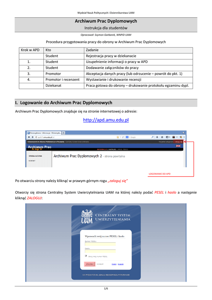 Wydział Nauk Politycznych i Dziennikarstwa UAM Archiwum Prac Dyplomowych Instrukcja dla studentów Opracował: Szymon Garbarek, WNPiD UAM Procedura przygotowania pracy do obrony w Archiwum Prac Dyplomowych Krok w APD Kto Zadanie 1. Student Student Rejestracja pracy w dziekanacie Uzupełnienie informacji o pracy w APD 2. Student Dodawanie załączników do pracy 3. 4. Promotor Promotor i recenzent Akceptacja danych pracy (lub odrzucenie – powrót do pkt. 1) Wystawianie i drukowanie recenzji Dziekanat Praca gotowa do obrony – drukowanie protokołu egzaminu dypl. I. Logowanie do Archiwum Prac Dyplomowych Archiwum Prac Dyplomowych znajduje się na stronie internetowej o adresie: http://apd.amu.edu.pl LOGOWANIE DO APD Po otwarciu strony należy kliknąd w prawym górnym rogu „zaloguj się” Otworzy się strona Centralny System Uwierzytelniania UAM na której należy podad PESEL i hasło a następnie kliknąd ZALOGUJ: 1/6 II. Lista prac i zadao Po zalogowaniu do APD pojawi się strona „Moje prace i zadania”. W każdym momencie można wrócid do tej strony klikając na pasku menu odnośnik MOJE PRACE. PRZEJŚCIE DO STRONY „MOJE PRACE I ZADANIA” PRZEJŚCIE DO UZUPEŁNIANIA INFORMACJI O PRACY PRZEJŚCIE DO INFORMACJI O PRACY W lewej kolumnie strony znajduje się lista prac, których autorem jest zalogowany student. Praca pojawia się w tym miejscu w momencie jej zarejestrowania przez studenta w dziekanacie. W prawej kolumnie znajdują się zadania do wykonania, czyli lista prac, do których student ma uzupełnid informacje. 2/6 III. Uzupełnianie informacji o pracy Aby przejśd do wprowadzania informacji o pracy należy kliknąd tytuł pracy znajdujący się przy zadaniu „Uzupełnij informacje”. Pojawi się strona edycji informacji o pracy. W pierwszej kolejności należy wybrad język, w którym napisana jest praca. W zależności od dokonanego wyboru poniżej pojawią się odpowiednie pola do uzupełnienia: Tytuł pracy w języku polskim i angielskim. Jeżeli praca napisana jest w jednym z tych języków to tytułu pracy w tym języku nie można edytowad – oryginalny tytuł pracy wpisuje dziekanat podczas rejestracji pracy. Streszczenie w języku oryginalnym, polskim i angielskim Słowa kluczowe w języku oryginalnym, polskim i angielskim Po uzupełnieniu informacji należy zapisad dane klikając przycisk „Zapisz dane pracy”. PRZEJŚCIE DO DODAWANIA ZAŁĄCZNIKÓW ZAPISYWANIE WPROWADZONYCH ZMIAN WYBÓR JĘZYKA PRACY 3/6 IV. Dodawanie załączników Po uzupełnieniu informacji o pracy należy dodad załącznik z treścią pracy. W tym celu należy kliknąd „Przejdź do dodawania załączników”. Aby przejśd do strony dodawania załączników należy kliknąd „Dodaj załączniki”. PRZEJŚCIE DO STRONY DODAWANIA ZAŁĄCZNIKÓW Pojawi się strona dodawania załączników. Aby dodad plik zawierający pracę należy kliknąd „Przeglądaj …” i wskazad zapisany na dysku plik w formacie pdf (UWAGA! Nazwa pliku nie może zawierad znaków diakrytycznych). Można również dodad krótki opis dotyczący załącznika. Dodawanie załącznika należy potwierdzid przyciskiem „Dodaj załącznik do zestawu”. POWRÓT DO STRONY Z OPISEM PRACY WYBIERANIE PLIKU DO ZAŁĄCZENIA DODAWANIE ZAŁĄCZNIKA 4/6 Każdy dodany załącznik pojawi się na liście załączników. Załącznik można usunąd z listy klikając „Usuo”. USUWANIE ZAŁĄCZNIKA Po dodaniu wszystkich załączników należy kliknąd „wród do pracy”, aby powrócid do strony z opisem pracy. Aby ponownie przejśd do dodawania załączników należy kliknąd „Zarządzaj załącznikami do pracy”. Można także powrócid do edycji informacji o pracy (tytuł, streszczenie, słowa kluczowe) klikając „Wród do edycji danych”. POWRÓT DO EDYCJI INFORMACJI O PRACY PRZEKAZYWANIE PRACY DO ZATWIERDZENIA PRZEZ OPIEKUNA POWRÓT DO DODAWANIA/ /USUWANIA ZAŁĄCZNIKÓW OTWIERANIE RECENZJI 5/6 V. Przekazanie pracy do akceptacji przez promotora Po uzupełnieniu informacji o pracy i dodaniu załączników zawierających pracę należy przekazad pracę do zatwierdzenia przez promotora. W tym celu należy kliknąd „Przekaż do zatwierdzenia przez opiekuna”. Tej operacji nie będzie można cofnąd dlatego należy ją potwierdzid: System automatycznie poinformuje mailowo promotora o przekazaniu pracy do akceptacji. Weryfikacja pracy przez promotora Następnie promotor weryfikuje wprowadzone przez studenta informacje o pracy i załączone pliki: Jeśli wprowadzone dane zostaną zaakceptowane przez promotora to przekazuje on pracę do wpisywania recenzji. Jeśli wprowadzone przez studenta dane są błędne promotor cofa informacje o pracy do ponownej edycji przez studenta. W takim przypadku student ponownie otrzymuje możliwośd edycji informacji o pracy i dodawania załączników. Student jest automatycznie informowany mailowo o akceptacji lub cofnięciu pracy do ponownej edycji. Recenzje Po zaakceptowaniu pracy przez promotora do systemu wpisywane są recenzje. Wypełnione i zaakceptowane recenzje można otworzyd klikając ikonkę recenzji obok nazwiska recenzenta. Recenzja jest dostępna kiedy ikonka ma kolor zielony. 6/6