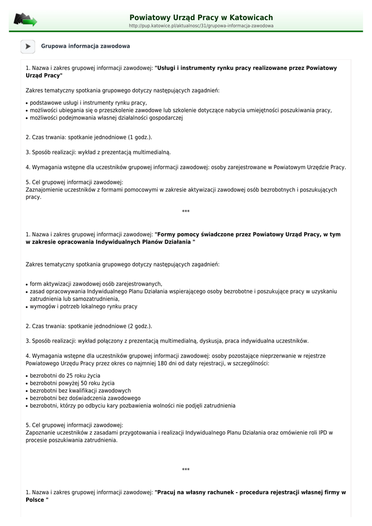 Powiatowy Urząd Pracy w Katowicach http://pup.katowice.pl/aktualnosc/31/grupowa-informacja-zawodowa Grupowa informacja zawodowa 1. Nazwa i zakres grupowej informacji zawodowej: "Usługi i instrumenty rynku pracy realizowane przez Powiatowy Urząd Pracy" Zakres tematyczny spotkania grupowego dotyczy następujących zagadnień: ● ● ● podstawowe usługi i instrumenty rynku pracy, możliwości ubiegania się o przeszkolenie zawodowe lub szkolenie dotyczące nabycia umiejętności poszukiwania pracy, możliwości podejmowania własnej działalności gospodarczej 2. Czas trwania: spotkanie jednodniowe (1 godz.). 3. Sposób realizacji: wykład z prezentacją multimedialną. 4. Wymagania wstępne dla uczestników grupowej informacji zawodowej: osoby zarejestrowane w Powiatowym Urzędzie Pracy. 5. Cel grupowej informacji zawodowej: Zaznajomienie uczestników z formami pomocowymi w zakresie aktywizacji zawodowej osób bezrobotnych i poszukujących pracy. *** 1. Nazwa i zakres grupowej informacji zawodowej: "Formy pomocy świadczone przez Powiatowy Urząd Pracy, w tym w zakresie opracowania Indywidualnych Planów Działania " Zakres tematyczny spotkania grupowego dotyczy następujących zagadnień: ● ● ● form aktywizacji zawodowej osób zarejestrowanych, zasad opracowywania Indywidualnego Planu Działania wspierającego osoby bezrobotne i poszukujące pracy w uzyskaniu zatrudnienia lub samozatrudnienia, wymogów i potrzeb lokalnego rynku pracy 2. Czas trwania: spotkanie jednodniowe (2 godz.). 3. Sposób realizacji: wykład połączony z prezentacją multimedialną, dyskusja, praca indywidualna uczestników. 4. Wymagania wstępne dla uczestników grupowej informacji zawodowej: osoby pozostające nieprzerwanie w rejestrze Powiatowego Urzędu Pracy przez okres co najmniej 180 dni od daty rejestracji, w szczególności: ● ● ● ● ● bezrobotni do 25 roku życia bezrobotni powyżej 50 roku życia bezrobotni bez kwalifikacji zawodowych bezrobotni bez doświadczenia zawodowego bezrobotni, którzy po odbyciu kary pozbawienia wolności nie podjęli zatrudnienia 5. Cel grupowej informacji zawodowej: Zapoznanie uczestników z zasadami przygotowania i realizacji Indywidualnego Planu Działania oraz omówienie roli IPD w procesie poszukiwania zatrudnienia. *** 1. Nazwa i zakres grupowej informacji zawodowej: "Pracuj na własny rachunek - procedura rejestracji własnej firmy w Polsce " Zakres tematyczny spotkania grupowego dotyczy następujących zagadnień: ● ● procedura rejestracji firmy (Centralna Ewidencja i Informacja o Działalności Gospodarczej, US, ZUS, GUS), obowiązki przyszłego przedsiębiorcy wynikające z podpisania umowy o dofinansowanie działalności gospodarczej ze środków publicznych, 2. Czas trwania: spotkanie jednodniowe (2 godz.). 3. Sposób realizacji: wykład z prezentacją multimedialną. 4. Wymagania wstępne dla uczestników grupowej informacji zawodowej: osoby bezrobotne, które złożyły wniosek o przyznanie środków na uruchomienie działalności gospodarczej 5. Cel grupowej informacji zawodowej: Przygotowanie uczestników spotkania do rejestracji własnej firmy.