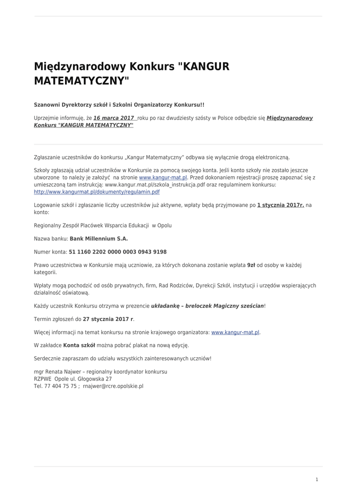 Międzynarodowy Konkurs "KANGUR MATEMATYCZNY" Szanowni Dyrektorzy szkół i Szkolni Organizatorzy Konkursu!! Uprzejmie informuję, że 16 marca 2017 roku po raz dwudziesty szósty w Polsce odbędzie się Międzynarodowy Konkurs "KANGUR MATEMATYCZNY" Zgłaszanie uczestników do konkursu „Kangur Matematyczny” odbywa się wyłącznie drogą elektroniczną. Szkoły zgłaszają udział uczestników w Konkursie za pomocą swojego konta. Jeśli konto szkoły nie zostało jeszcze utworzone to należy je założyć na stronie www.kangur-mat.pl. Przed dokonaniem rejestracji proszę zapoznać się z umieszczoną tam instrukcją: www.kangur.mat.pl/szkola_instrukcja.pdf oraz regulaminem konkursu: http://www.kangurmat.pl/dokumenty/regulamin.pdf Logowanie szkół i zgłaszanie liczby uczestników już aktywne, wpłaty będą przyjmowane po 1 stycznia 2017r. na konto: Regionalny Zespół Placówek Wsparcia Edukacji w Opolu Nazwa banku: Bank Millennium S.A. Numer konta: 51 1160 2202 0000 0003 0943 9198 Prawo uczestnictwa w Konkursie mają uczniowie, za których dokonana zostanie wpłata 9zł od osoby w każdej kategorii. Wpłaty mogą pochodzić od osób prywatnych, firm, Rad Rodziców, Dyrekcji Szkół, instytucji i urzędów wspierających działalność oświatową. Każdy uczestnik Konkursu otrzyma w prezencie układankę – breloczek Magiczny sześcian! Termin zgłoszeń do 27 stycznia 2017 r. Więcej informacji na temat konkursu na stronie krajowego organizatora: www.kangur-mat.pl. W zakładce Konta szkół można pobrać plakat na nową edycję. Serdecznie zapraszam do udziału wszystkich zainteresowanych uczniów! mgr Renata Najwer – regionalny koordynator konkursu RZPWE Opole ul. Głogowska 27 Tel. 77 404 75 75 ; [email protected] 1