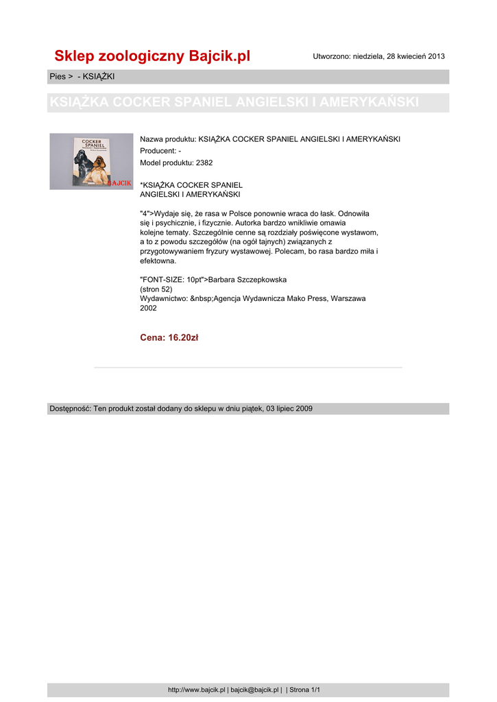 Sklep zoologiczny Bajcik.pl Utworzono: niedziela, 28 kwiecień 2013 Pies > - KSIĄŻKI KSIĄŻKA COCKER SPANIEL ANGIELSKI I AMERYKAŃSKI Nazwa produktu: KSIĄŻKA COCKER SPANIEL ANGIELSKI I AMERYKAŃSKI Producent: Model produktu: 2382 *KSIĄŻKA COCKER SPANIEL ANGIELSKI I AMERYKAŃSKI "4">Wydaje się, że rasa w Polsce ponownie wraca do łask. Odnowiła się i psychicznie, i fizycznie. Autorka bardzo wnikliwie omawia kolejne tematy. Szczególnie cenne są rozdziały poświęcone wystawom, a to z powodu szczegółów (na ogół tajnych) związanych z przygotowywaniem fryzury wystawowej. Polecam, bo rasa bardzo miła i efektowna. "FONT-SIZE: 10pt">Barbara Szczepkowska (stron 52) Wydawnictwo: Agencja Wydawnicza Mako Press, Warszawa 2002 Cena: 16.20zł Dostępność: Ten produkt został dodany do sklepu w dniu piątek, 03 lipiec 2009 http://www.bajcik.pl | [email protected] | | Strona 1/1
