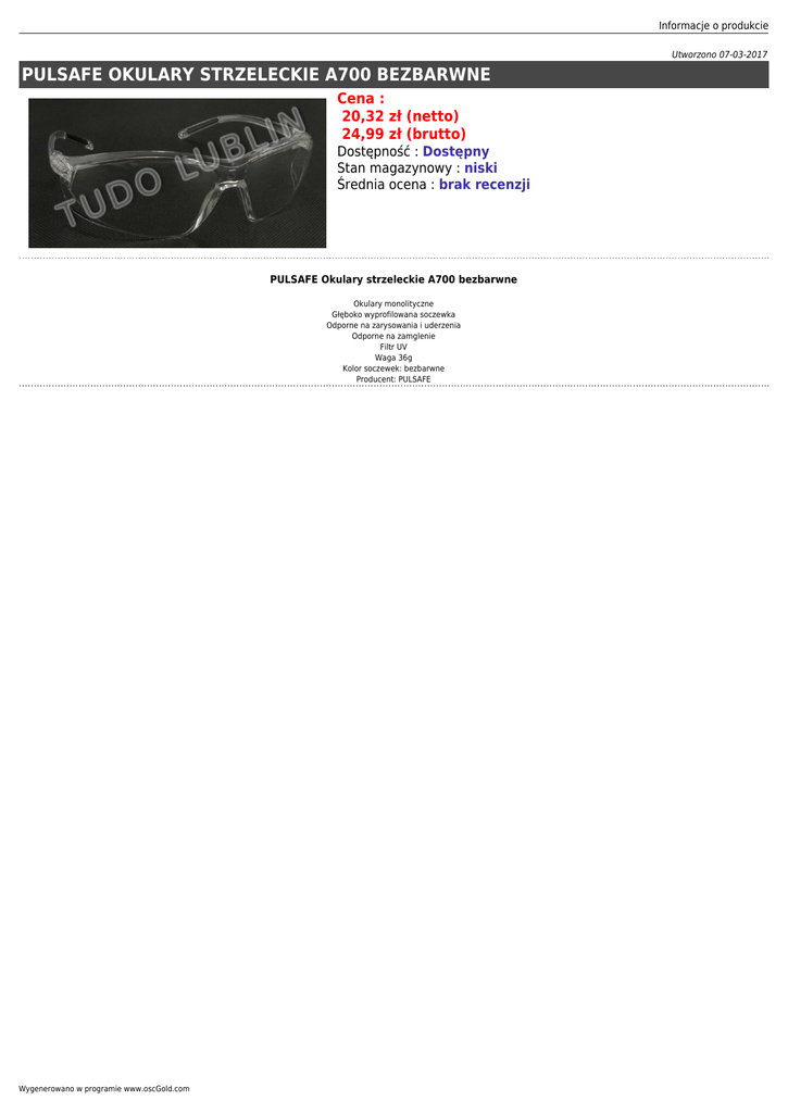 Informacje o produkcie Utworzono 07-03-2017 PULSAFE OKULARY STRZELECKIE A700 BEZBARWNE Cena : 20,32 zł (netto) 24,99 zł (brutto) Dostępność : Dostępny Stan magazynowy : niski Średnia ocena : brak recenzji PULSAFE Okulary strzeleckie A700 bezbarwne Okulary monolityczne Głęboko wyprofilowana soczewka Odporne na zarysowania i uderzenia Odporne na zamglenie Filtr UV Waga 36g Kolor soczewek: bezbarwne Producent: PULSAFE Wygenerowano w programie www.oscGold.com