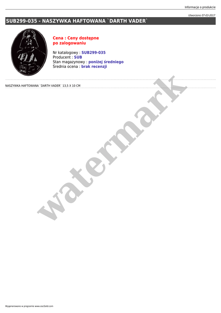Informacje o produkcie Utworzono 07-03-2017 SUB299-035 - NASZYWKA HAFTOWANA `DARTH VADER` Cena : Ceny dostępne po zalogowaniu Nr katalogowy : SUB299-035 Producent : SUB Stan magazynowy : poniżej średniego Średnia ocena : brak recenzji w at er m ar k NASZYWKA HAFTOWANA `DARTH VADER` 13,5 X 10 CM Wygenerowano w programie www.oscGold.com