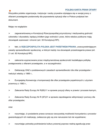 POLSKA KARTA PRAW OFIARY Wszystkie polskie organizacje, instytucje i osoby prywatne stykające się w swojej pracy z ofiarami przestępstw postanowiły dla poprawienia sytuacji ofiar w Polsce podpisać ten dokument. Mając na względzie: zagwarantowaną w Konstytucji Rzeczpospolitej przyrodzoną i niezbywalną godność człowieka i obywatela, będącą źródłem jego wolności i praw, które władze publiczne mają obowiązek szanować i chronić (art. 30 Konstytucji RP); fakt, iż RZECZPOSPOLITA POLSKA JEST PAŃSTWEM PRAWA, urzeczywistniającym zasady sprawiedliwości społecznej, w którym każdy ma obowiązek przestrzegania prawa (art. 2 i art. 83 Konstytucji RP); zalecenia wypracowane przez międzynarodową społeczność kształtujące politykę postępowania z ofiarami przestępstw, a w szczególności: Deklarację ONZ o podstawowych zasadach sprawiedliwości dla ofiar przestępstw i nadużyć władzy z 1985 r., Europejską Konwencję o kompensacji dla ofiar przestępstw popełnionych z użyciem przemocy z 1983 r., Zalecenia Rady Europy Nr R(85)11 w sprawie pozycji ofiary w prawie i procesie karnym, Zalecenia Rady Europy Nr R (87)21 w sprawie zapobiegania wiktymizacji i pomocy dla ofiar przestępstw; oraz rozumiejąc, iż posiadanie prawa oznacza rzeczywistą możliwość korzystania z procedur gwarantujących ich realizację, zwłaszcza gdy są one naruszane lub nie wypełniane; rozumiejąc potrzebę podniesienia kultury prawnej poprzez realną egzekucję praw obowiązujących; kierując się dobrem ofiar przestępstw oraz chęcią pomocy i naprawienia doznanej przez nie krzywdy, postanawiamy spisać i upowszechnić Polską Kartę Praw Ofiary. I. Definicja i zakres uprawnień 1. Ofiarą w rozumieniu Karty jest osoba fizyczna, której dobro prawem chronione zostało bezpośrednio naruszone lub zagrożone przez przestępstwo, a także jej najbliżsi (art. 115 § 11 Kodeksu karnego [k.k.], Rezolucja 40/34 Zgromadzenia Ogólnego ONZ z 29 XI 1985 r., Deklaracja podstawowych zasad sprawiedliwości dla ofiar przestępstw i nadużyć władzy , pkt. A [ONZ 85], art. 47 Konstytucji RP, art. 49 i art. 51 § 2 Kodeksu postępowania karnego [k.p.k.]). 2. Ofiara ma prawo do: 1) pomocy, 2) godności, szacunku i współczucia, 3) wolności od wtórnej wiktymizacji, 4) dostępu do wymiaru sprawiedliwości, 5) mediacji i pojednania ze sprawcą, 6) do restytucji i kompensacji (ONZ 85, art. 2 Konstytucji RP, art. 2 § 1 [k.p.k.]). 3. Ofiara niezależnie od tego, czy ujawniony został sprawca przestępstwa i czy ma miejsce postępowanie karne (kiedy ofiara uzyskuje status pokrzywdzonego), bądź cywilne (kiedy ofiara uzyskuje status poszkodowanego) oraz niezależnie od więzi rodzinnej łączącej sprawcę i ofiarę winna uzyskać potrzebną jej pomoc prawną, materialną, medyczną, psychologiczną i socjalną (art. 2; art. 31 pkt. 1,2; art. 32 Konstytucji RP, art. 2 § 1 pkt 3 Kodeksu postępowania karnego [k.p.k.], art. 49 § 1 k.p.k.). II. Prawo do godności, szacunku i współczucia 4. Ofiara ma prawo do traktowania jej z godnością, szacunkiem i współczuciem. Do szczególnego przestrzegania tego prawa zobowiązani są przedstawiciele wymiaru sprawiedliwości, służby zdrowia i służb socjalnych (art. 47 Konstytucji RP, art. 1 ust. 2 oraz art. 14.3 ustawy o Policji z 1990 r., Deklaracja o Policji, przyjęta w 1979 r. przez Radę Europy oraz Kodeks ONZ postępowania funkcjonariuszy porządku prawnego (Rezolucja nr 34/169 Zgromadzenia Ogólnego ONZ z 17 XII 1979 r.), art. 30 ustawy o zawodzie lekarza w zw. z art. 12 i art. 13 Kodeksu etyki lekarskiej z 1993 r., art. 8 Kodeksu postępowania administracyjnego z 1960 r. [k.p.a.]), 5. Nie można przerzucać odpowiedzialności za przestępstwo ze sprawcy na ofiarę. Nie można usprawiedliwiać przestępstwa tradycją, kulturą, stereotypami minimalizującymi winę sprawcy. III. Prawo do bezpieczeństwa i zakaz ponownego dręczenia ofiary 6. Ofiara ma prawo do bezpieczeństwa i ochrony oraz poszanowania jej życia rodzinnego i prywatnego. Ofiary nie wolno ponownie dręczyć należy dołożyć wszelkich starań, by uniknęła ona powtórnej wiktymizacji. Oznacza to zakaz wkraczania w prywatność ofiary i jej rodziny ze strony wszystkich, którzy stykają się z nią w związku z popełnionym przestępstwem, w szczególności: przedstawicieli organów państwowych, służb medycznych i socjalnych, mediów (art. 8 Konwencji o ochronie praw człowieka i podstawowych wolności z 1950 r. [KE], art. 191 § 3, art. 20 k.p.k.). 7. Ofiara ma prawo do traktowania ze szczególną troską i powagą przez organy wymiaru sprawiedliwości i organy ścigania. Postępowanie w sprawie powinno być prowadzone tak, by uwzględniać interesy i stan ofiary. Jej przesłuchania winny być: ograniczone do minimum, prowadzone w sposób kulturalny, wolne od opóźnień, odwołań i zmuszania ofiary do wielokrotnego przeżywania na nowo tragedii jakiej doświadczyła (art. 30 Konstytucji RP, art. 231 k.k.) 8. Ofiara ma prawo do bezpieczeństwa osobistego, a obowiązkiem Policji i prokuratury jest jej to bezpieczeństwo zapewnić (art. 14.3 i art. 15.1 pkt 3 ustawy o Policji, art. 231 § 1 k.k.). 9. Ofiara może zażądać utajnienia swoich danych osobowych. (art. 184 k.p.k.). 10. Ofiara ma prawo domagać się zastrzeżenia danych dotyczących jej miejsca zamieszkania do wyłącznej wiadomości prokuratora lub sądu (art. 191 § 3 k.p.k.). 11. Ofiara ma prawo do zachowania anonimowości w sprawozdaniach prasowych, telewizyjnych, w Internecie i w innych mediach, dotyczących jej sprawy. (art. 13 pkt. 2 ustawy Prawo prasowe). 12. Właściwe organy państwowe są zobowiązane do przyjęcia każdego zawiadomienia o przestępstwie zgłoszonego przez ofiarę i podjęcia odpowiedniej interwencji. Dotyczy to również sytuacji gdy zagrożenie pochodzi od osoby dla ofiary bliskiej lub gdy ofiarą jest dziecko (art. 9, 10, 12 k.p.k. art. 15.1 pkt. 3 ustawy o Policji, rozporządzenie Ra