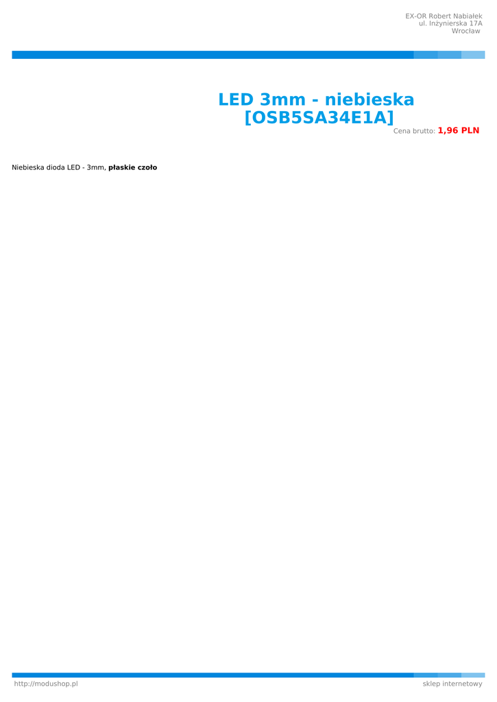 EX-OR Robert Nabiałek ul. Inżynierska 17A Wrocław LED 3mm - niebieska [OSB5SA34E1A] Cena brutto: 1,96 PLN Niebieska dioda LED - 3mm, płaskie czoło http://modushop.pl sklep internetowy