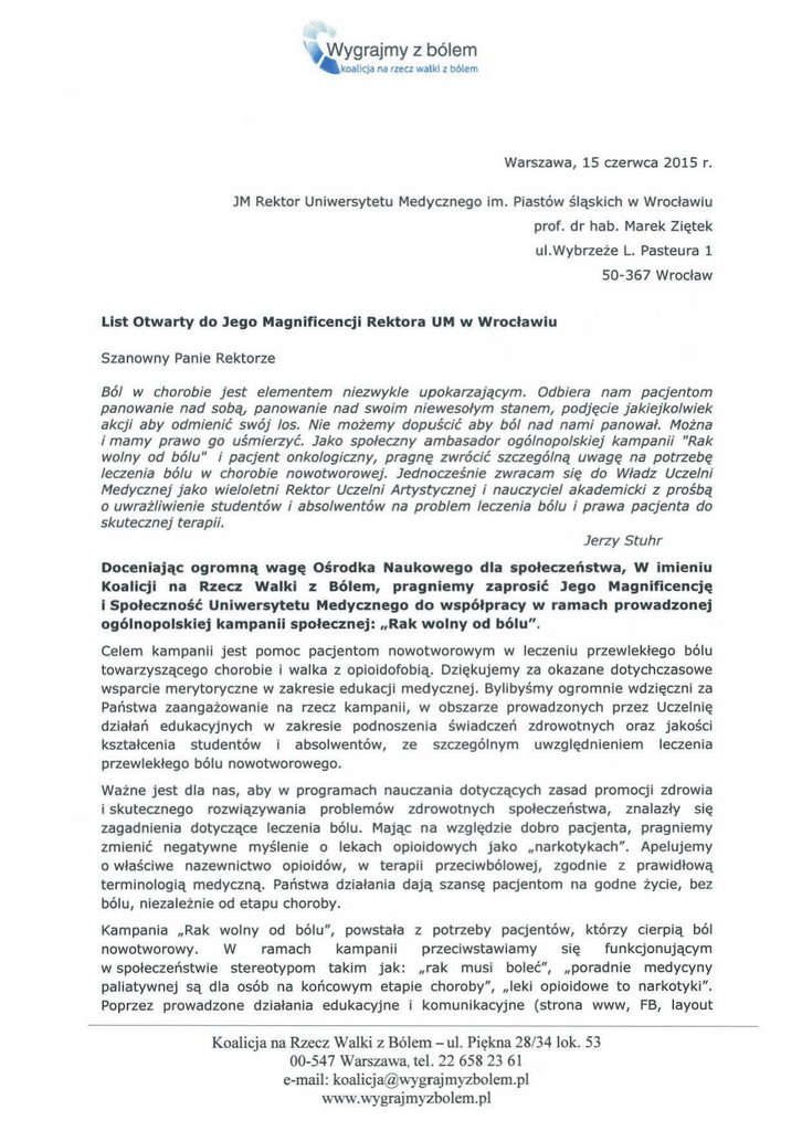 Warszawa, 15 czerwca 2015 r. JM Re ktor Uniwersytetu Medycznego im. Piastów śląsk i ch w W rocławi u prof. dr hab. Marek Ziętek ul. Wybrzeże L. Pasteura 1 50-367 List Otwarty do lego Magnificencji Rektora UM w Wrocław Wrocławiu Sza nowny Panie Rektorze Ból w chorobie jest elementem niezwykle upokarzającym. Odbiera nam pacjentom panowanie nad sobć~J panowanie nad swoim niewesołym stanem, podjęcie jakiejkolwiek akcji aby odmienić swój los. Nie możemy dopuścić aby ból nad nami panował. Można i mamy prawo go uśmierzyć. Jako społeczny ambasador ogólnopolskiej kampanii "Rak wolny od bólu" i pacjent onkologiczny, pragnę zwrócić szczególną uwagę na potrzebę leczenia bólu w chorobie nowotworowej. Jednocześnie zwracam się do Władz Uczelni Medycznej jako wieloletni Rektor Uczelni Artystycznej i nauczyciel akademicki z prośbą o uwrażliwienie studentów i absolwentów na problem leczenia bólu i prawa pacjenta do skutecznej terapii. Jerzy Stuhr Doceniając ogromną wagę Ośrodka Naukowego dla społeczeństwa, W imieniu Koalicji na Rzecz Walki z Bólem, pragniemy zaprosić lego Magnificencję i Społeczność Uniwersytetu Medycznego do współpracy w ramach prowadzonej ogólnopolskiej kampanii społecznej: "Rak wolny od bólu". Celem kampanii jest pomoc pacjentom nowotworowym w leczeniu przewlekłego bólu towarzyszącego chorobie i walka z opioidofobią. Dz i ękujemy za okaza ne dotychczasowe wsparcle merytoryczne w zakresie edukacji medycznej. Bylibyśmy ogromnie wdzięczni za Państwa zaangażowanie na rzecz kampanii, w obszarze prowadzonych przez Uczelnię działań edukacyjnych w za kresie podnoszenia świadczeń zdrowotnych oraz jakości kształcenia studentów i absolwentów, ze szczególnym uwzględn ien iem leczenia przewlekłego bólu nowotworowego. Ważne jest dla nas, aby w programach nauczania dotyczących zasad promocji zdrowia i skutecznego rozw i ązywania problemów zdrowotnych społeczeństwa, znalazły s i ę zagadnienia dotyczące leczenia bólu. Mając na względzie dobro pacjenta, pragn iemy zmienić negatywne myślenie o lekach opioidowych jako "narkotykach". Apelujemy o właściwe nazewnictwo opioidów, w terapii przeciwbólowej, zgodn ie z praw idłową terminologią medyczną. Państwa działania dają szansę pacjentom na godne życie, bez bólu, nieza l eżnie od etapu choroby. Kampania "Rak wolny od bólu", powstała z potrzeby pacjentów, którzy cierpią ból nowotworowy. W ramach kampanii przeciwstawiamy się funkcjonującym w społeczeństwie stereotypom takim jak: "rak musi boleć", "porad nie medycyny paliatywnej są dla osób na końcowym etapie choroby", "leki opioidowe to narkotyki". Poprzez prowadzone działania edukacyjne i komunikacyjne (strona www, FB, layout Koalicja na Rzecz Walki z Bólem- ul. Piękna 28/34 lok. 53 00-547 Warszawa, tel. 22 658 23 61 e-mail: [email protected] www.wygrajmyzbolem.pl \ Wygrajmy z bólem - koalicja na rzecz walki z bólem prasowy, spot radiowy, materiały eksperckie w mediach, bezpłatne konsu ltacje dla pacjentów onkologicznych) chcemy zwiększyć społeczną świadomość problemu i przyczynić się do poprawy jakości leczenia bólu nowotworowego w kraju. Jak wynika z przeprowadzanych ankiet i listów od pacjentów, jakie otrzymujemy na adres kampanii, problemem społecznym jest lęk przed lekami opioidowymi, dotyczący uzależnienia i działań niepożądanych. Opiaidofobia to jeden z powodów, dla których część środowiska medycznego oraz pacjenci unikają skutecznego leczenia bólu nowotworowego. Dążymy do zmiany postrzegania leczenia bólu i postawy cierpiącego pacjenta, który powinien domagać s i ę skutecznej terapii przeciwbólowej. Mówimy o skutkach nieleczonego bólu i dopuszczaniu do niepotrzebnego cierpienia pacjentów. Jako przedstawiciele tej grupy zwracamy s i ę z uprzejmą prośbą o wsparcie kampan ii i merytoryczny głos poparcia w sprawie przeciwdziałan i a opioidofobii, obejmującej zarówno środowisko medyczne, pacjentów i ich rodziny. Kampania uzyskała szerokie poparcie środowisk medycznych. Patronatu udzieliła Sejmowa Komisja Zdrowia. Głęboko wierzymy, że dzięki wsparciu Uniwersytetu Medycznego, informacja o leczeniu bólu nowotworowego, wolna od opiaidofobii dotrze do szerokiego grona odbiorców i zmieni postrzeganie leków opioidowych, przez środowisko medyczne i pacjenckie. Opioidy zostaną traktowane jako bezpieczny i skuteczny środek leczniczy w terapii leczenia bólu w Polsce . W oczekiwaniu na przychylne stanowisko, pozostaję z wyrazami szacunku i poważan i em. stawski Koalicja na Rzecz Walki z Bólem- ul. Pi ękna 28/34lok. 53 00-547 Warszawa, teł. 22 658 23 61 e-mail: [email protected] www. wygrąjmyzbolem. p l
