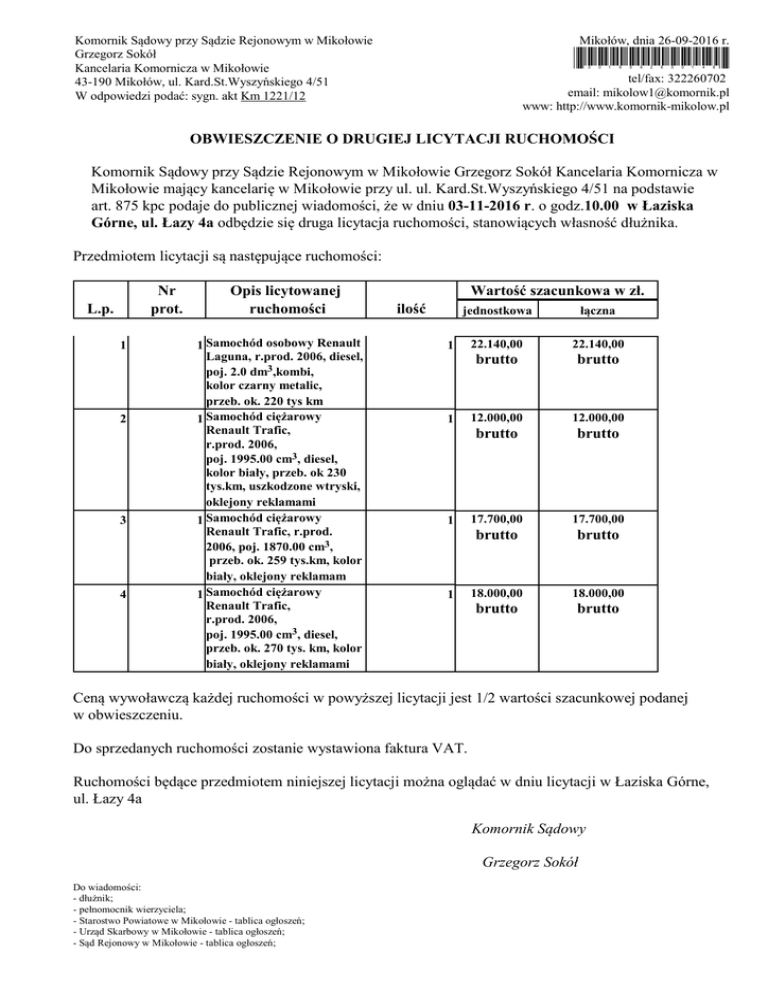Komornik Sądowy przy Sądzie Rejonowym w Mikołowie Grzegorz Sokół Kancelaria Komornicza w Mikołowie 43-190 Mikołów, ul. Kard.St.Wyszyńskiego 4/51 W odpowiedzi podać: sygn. akt Km 1221/12 Mikołów, dnia 26-09-2016 r. *0016092600148* tel/fax: 322260702 email: [email protected] www: http://www.komornik-mikolow.pl OBWIESZCZENIE O DRUGIEJ LICYTACJI RUCHOMOŚCI Komornik Sądowy przy Sądzie Rejonowym w Mikołowie Grzegorz Sokół Kancelaria Komornicza w Mikołowie mający kancelarię w Mikołowie przy ul. ul. Kard.St.Wyszyńskiego 4/51 na podstawie art. 875 kpc podaje do publicznej wiadomości, że w dniu 03-11-2016 r. o godz.10.00 w Łaziska Górne, ul. Łazy 4a odbędzie się druga licytacja ruchomości, stanowiących własność dłużnika. Przedmiotem licytacji są następujące ruchomości: Nr prot. L.p. 1 2 3 4 Opis licytowanej ruchomości 1 Samochód osobowy Renault Laguna, r.prod. 2006, diesel, poj. 2.0 dm3,kombi, kolor czarny metalic, przeb. ok. 220 tys km 1 Samochód ciężarowy Renault Trafic, r.prod. 2006, poj. 1995.00 cm3, diesel, kolor biały, przeb. ok 230 tys.km, uszkodzone wtryski, oklejony reklamami 1 Samochód ciężarowy Renault Trafic, r.prod. 2006, poj. 1870.00 cm3, przeb. ok. 259 tys.km, kolor biały, oklejony reklamam 1 Samochód ciężarowy Renault Trafic, r.prod. 2006, poj. 1995.00 cm3, diesel, przeb. ok. 270 tys. km, kolor biały, oklejony reklamami Wartość szacunkowa w zł. ilość jednostkowa łączna 22.140,00 22.140,00 brutto brutto 12.000,00 12.000,00 brutto brutto 17.700,00 17.700,00 brutto brutto 18.000,00 18.000,00 brutto brutto 1 1 1 1 Ceną wywoławczą każdej ruchomości w powyższej licytacji jest 1/2 wartości szacunkowej podanej w obwieszczeniu. Do sprzedanych ruchomości zostanie wystawiona faktura VAT. Ruchomości będące przedmiotem niniejszej licytacji można oglądać w dniu licytacji w Łaziska Górne, ul. Łazy 4a Komornik Sądowy Grzegorz Sokół Do wiadomości: - dłużnik; - pełnomocnik wierzyciela; - Starostwo Powiatowe w Mikołowie - tablica ogłoszeń; - Urząd Skarbowy w Mikołowie - tablica ogłoszeń; - Sąd Rejonowy w Mikołowie - tablica ogłoszeń;