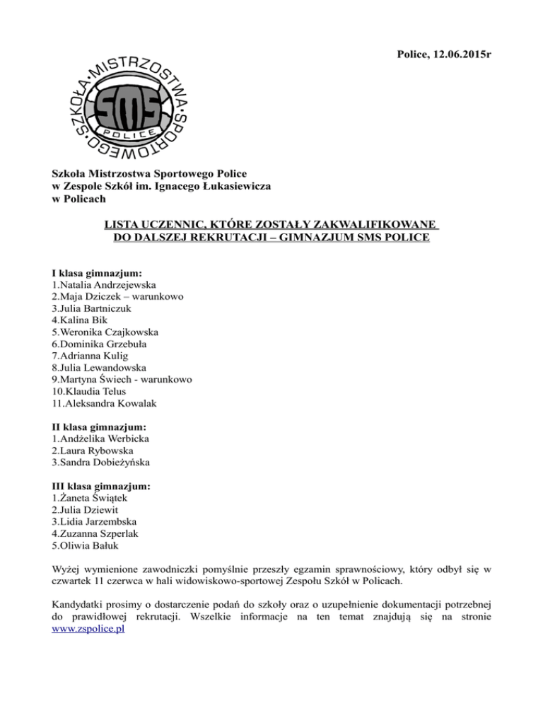 Police, 12.06.2015r Szkoła Mistrzostwa Sportowego Police w Zespole Szkół im. Ignacego Łukasiewicza w Policach LISTA UCZENNIC, KTÓRE ZOSTAŁY ZAKWALIFIKOWANE DO DALSZEJ REKRUTACJI – GIMNAZJUM SMS POLICE I klasa gimnazjum: 1.Natalia Andrzejewska 2.Maja Dziczek – warunkowo 3.Julia Bartniczuk 4.Kalina Bik 5.Weronika Czajkowska 6.Dominika Grzebuła 7.Adrianna Kulig 8.Julia Lewandowska 9.Martyna Świech - warunkowo 10.Klaudia Telus 11.Aleksandra Kowalak II klasa gimnazjum: 1.Andżelika Werbicka 2.Laura Rybowska 3.Sandra Dobieżyńska III klasa gimnazjum: 1.Żaneta Świątek 2.Julia Dziewit 3.Lidia Jarzembska 4.Zuzanna Szperlak 5.Oliwia Bałuk Wyżej wymienione zawodniczki pomyślnie przeszły egzamin sprawnościowy, który odbył się w czwartek 11 czerwca w hali widowiskowo-sportowej Zespołu Szkół w Policach. Kandydatki prosimy o dostarczenie podań do szkoły oraz o uzupełnienie dokumentacji potrzebnej do prawidłowej rekrutacji. Wszelkie informacje na ten temat znajdują się na stronie www.zspolice.pl Jednocześnie informujemy, że wyznaczony został dodatkowy termin egzaminu językowego. Egzamin odbędzie się we wtorek 16 czerwca 2015r. o godz. 14:00. Egzamin obowiązuje uczennice I, II i III klasy gimnazjum. Mateusz Frąckowiak menedżer ds. mediów i marketingu SMS Police *************************** Szkoła Mistrzostwa Sportowego Police w piłce siatkowej dziewcząt w Zespole Szkół w Policach powstała w 2007 roku. Jej celem jest profesjonalne szkolenie zawodniczek grających w piłkę siatkową. Klasy przeznaczone są dla dziewcząt, które ukończyły gimnazjum. SMS wchodzi w skład Zespołu Szkół jako klasy liceum ogólnokształcącego na poziomie umożliwiającym kontynuowanie nauki na studiach. Zajęcia edukacyjne i sportowe są tak zorganizowane, aby zawodniczki mogły łączyć naukę ze sportem w sposób bezkonfliktowy. Program Szkolenia Sportowego SMS „POLICE” zakłada stały dopływ prawidłowo wyszkolonych zawodniczek do reprezentacji narodowej. Zawodniczki SMSu zachowują jednak przynależność klubową.
