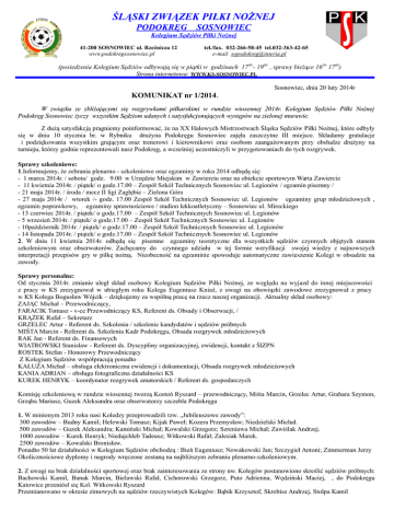 ŚLĄSKI ZWIĄZEK PIŁKI NOŻNEJ PODOKRĘG SOSNOWIEC Kolegium Sędziów Piłki Nożnej 41-200 SOSNOWIEC ul. Rzeźnicza 12 www.podokregsosnowiec.pl tel./fax. 032-266-58-45 tel.032-363-42-65 e-mail [email protected] (posiedzenia Kolegium Sędziów odbywają się w piątki w godzinach 1700 - 1900 , sprawy bieżące 1630- 1700) Strona internetowa: WWW.KS-SOSNOWIEC.PL Sosnowiec, dnia 20 luty 2014r KOMUNIKAT nr 1/2014. W związku ze zbliżającymi się rozgrywkami piłkarskimi w rundzie wiosennej 2014r. Kolegium Sędziów Piłki Nożnej Podokręg Sosnowiec życzy wszystkim Sędziom udanych i satysfakcjonujących występów na zielonej murawie. Z dużą satysfakcją pragniemy poinformować, że na XX Halowych Mistrzostwach Śląska Sędziów Piłki Nożnej, które odbyły się w dniu 10 stycznia br. w Rybniku drużyna Podokręgu Sosnowiec zajęła zaszczytne III miejsce. Składamy gratulacje i podziękowania wszystkim grającym oraz trenerowi i kierownikowi oraz osobom zaangażowanym przy obsłudze drużyny na turnieju, którzy godnie reprezentowali nasz Podokręg, a wcześniej uczestniczyli w przygotowaniach do tych rozgrywek. Sprawy szkoleniowe: 1.Informujemy, że zebrania plenarno - szkoleniowe oraz egzaminy w roku 2014 odbędą się: - 1 marca 2014r. / sobota/ godz. 9.00 w Urzędzie Miejskim w Zawierciu oraz na obiekcie sportowym Warta Zawiercie - 11 kwietnia 2014r. / piątek/ o godz.17.00 – Zespół Szkół Technicznych Sosnowiec ul. Legionów / egzamin pisemny / - 21 maja 2014r. / środa / mecz II ligi Zagłębie – Zielona Góra - 27 maja 2014r / wtorek /- godz. 17.00 Zespół Szkół Technicznych Sosnowiec ul. Legionów egzaminy grup młodzieżowych , egzamin poprawkowy, egzaminy sprawnościowe / stadion lekkoatletyczny – Sosnowiec ul. Mireckiego - 13 czerwiec 2014r. / piątek/ o godz.17.00 – Zespół Szkół Technicznych Sosnowiec ul. Legionów - 5 wrzesień 2014r. / piątek/ o godz.17.00 – Zespół Szkół Technicznych Sosnowiec ul. Legionów - 10październik 2014r. / piątek/ o godz.17.00 – Zespół Szkół Technicznych Sosnowiec ul. Legionów - 14 listopada 2014r. / piątek/ o godz.17.00 – Zespół Szkół Technicznych Sosnowiec ul. Legionów 2. W dniu 11 kwietnia 2014r. odbędą się pisemne egzaminy teoretyczne dla wszystkich sędziów czynnych objętych stanem szkoleniowym oraz obserwatorów. Zachęcamy do czynnego udziału w tej formie weryfikacji swojej wiedzy z najnowszych interpretacji przepisów gry w piłkę nożną. Nieobecność na egzaminie spowoduje automatyczne zawieszenie Kolegi w obsadzie na zawody. Sprawy personalne: Od stycznia 2014r. zmianie uległ skład osobowy Kolegium Sędziów Piłki Nożnej, ze względu na wyjazd do innej miejscowości z pracy w KS zrezygnował w ubiegłym roku Kolega Eugeniusz Kniaź, z uwagi na obowiązki zawodowe zrezygnował z pracy w KS Kolega Bogusław Wójcik – dziękujemy za wspólną pracę na rzecz naszej organizacji. Aktualny skład osobowy: ZAJĄC Michał – Przewodniczący, FARACIK Tomasz - v-ce Przewodniczący KS, Referent ds. Obsady i Obserwacji, / KRĄŻEK Rafał – Sekretarz GRZELEC Artur - Referent ds. Szkolenia / szkolenie kandydatów i sędziów próbnych MIŚTA Marcin - Referent ds. Szkolenia Kadr Podokręgu, Obsada rozgrywek młodzieżowych RAK Jan - Referent ds. Finansowych WIATROWSKI Stanisław - Referent ds. Dyscypliny organizacyjnej, ewidencji, kontakt z ŚlZPN ROSTEK Stefan - Honorowy Przewodniczący Z Kolegium Sędziów współpracują ponadto KAŁUŻA Michał – obsługa elektroniczna ewidencji i dokumentacji, Obsada rozgrywek młodzieżowych KANIA ADRIAN – obsługa fotograficzna działalności KS KUREK HENRYK – koordynator rozgrywek amatorskich / Referent ds. gospodarczych Komisję szkoleniową w rundzie wiosennej tworzą Kostoń Ryszard – przewodniczący, Miśta Marcin, Grzelec Artur, Grabara Szymon, Grząba Mariusz, Guzek Aleksandra oraz obserwatorzy szczebla Podokręgu 1. W minionym 2013 roku nasi Koledzy przeprowadzili tzw. „Jubileuszowe zawody”: 300 zawodów – Budny Kamil; Helewski Tomasz; Kijak Paweł; Kozera Przemysław; Niedzielski Michał. 500 zawodów – Guzek Aleksandra; Kamiński Michał; Kowalski Grzegorz; Szreniawa Michał; Zawiślak Andrzej. 1000 zawodów – Kurek Henryk; Niedajchleb Tadeusz; Witkowski Rafał; Zalesiak Marek. 2500 zawodów – Kowalski Bronisław. Ponadto 50 lat działalności w Kolegium Sędziów obchodzą : Bień Eugeniusz; Nowakowski Jan; Szczygieł Antoni; Zimmerman Jerzy Okolicznościowe dyplomy i nagrody wręczone zostaną na najbliższym zebraniu plenarno-szkoleniowym. 2. Z uwagi na brak działalności sportowej oraz brak zainteresowania ze strony nw. Kolegów postanowiono skreślić sędziów próbnych: Bachowski Kamil, Banak Marcin, Bielawski Rafał, Cichorowski Grzegorz, Puto Adrienna, Wędziński Maciej, , do Podokręgu Katowice przeniósł się Kol. Witkowski Ryszard Przemianowano w okresie zimowych na sędziów rzeczywistych Kolegów: Bąbik Krzysztof, Skrobisz Andrzej, Stolpa Kamil 3. Postanowiono o skreśleniu Kolegów – sędziów rzeczywistych, którzy nie uregulują składki Koleżeńskiego Funduszu Pośmiertnego za rok 2014- wykaz sędziów zamieszczony zostanie na stronie Kolegium Sędziów / zgodnie z Regulaminem KFP Kolegium Sędziów nie ma obowiązku wcześniejszego wysyłania tzw. ”monitów” do zainteresowanych osób/. Przypominamy adres naszej strony internetowej WWW.KS-SOSNOWIEC.PL, na tej stronie można znaleźć aktualne informacje z życia Kolegium Sędziów Na własna prośbę zrezygnowała z działalności koleżanka Lemańska/ Bernaś Renata, Kolega Zawiliński Kamil 4. W ostatnim czasie zmarli nasi Koledzy – Cieluch Stanisław, Litwiński Czesław – Cześć ich pamięci. 5. Kolegium Sedziów Podokreg Sosnowiec na dzień 31 grudzień 2013r, liczyło 161 sedziów rzeczywistych, oraz 27 sędziów próbnych, Wnioski licencyjne przed sezonem 2013/14 złożyło 145 sedziów, opłaciło licencje 113 sędziów, z u