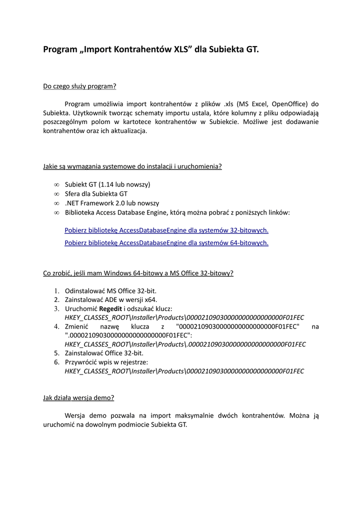 Program „Import Kontrahentów XLS” dla Subiekta GT. Do czego służy program? Program umożliwia import kontrahentów z plików .xls (MS Excel, OpenOffice) do Subiekta. Użytkownik tworząc schematy importu ustala, które kolumny z pliku odpowiadają poszczególnym polom w kartotece kontrahentów w Subiekcie. Możliwe jest dodawanie kontrahentów oraz ich aktualizacja. Jakie są wymagania systemowe do instalacji i uruchomienia? • • • • Subiekt GT (1.14 lub nowszy) Sfera dla Subiekta GT .NET Framework 2.0 lub nowszy Biblioteka Access Database Engine, którą można pobrać z poniższych linków: Pobierz bibliotekę AccessDatabaseEngine dla systemów 32-bitowych. Pobierz bibliotekę AccessDatabaseEngine dla systemów 64-bitowych. Co zrobić, jeśli mam Windows 64-bitowy a MS Office 32-bitowy? 1. Odinstalować MS Office 32-bit. 2. Zainstalować ADE w wersji x64. 3. Uruchomić Regedit i odszukać klucz: HKEY_CLASSES_ROOT\Installer\Products\00002109030000000000000000F01FEC 4. Zmienić nazwę klucza z "00002109030000000000000000F01FEC" na ".00002109030000000000000000F01FEC": HKEY_CLASSES_ROOT\Installer\Products\.00002109030000000000000000F01FEC 5. Zainstalować Office 32-bit. 6. Przywrócić wpis w rejestrze: HKEY_CLASSES_ROOT\Installer\Products\00002109030000000000000000F01FEC Jak działa wersja demo? Wersja demo pozwala na import maksymalnie dwóch kontrahentów. Można ją uruchomić na dowolnym podmiocie Subiekta GT. Instrukcja instalacji Należy uruchomić plik setup.exe i zainstalować program. Po pierwszym uruchomieniu pokaże się okno: Należy nacisnąć OK, następnie kliknąć menu Ustawienia – Konfiguracja połączenia: Następnie trzeba wpisać: Serwer: nazwę serwera SQL i instancji (np. „(local)\INSERTGT”) Baza danych: nazwę bazy danych (można ją zobaczyć w Programie serwisowym) Login i hasło: login i hasło do serwera SQL (nie mylić z loginem i hasłem do Subiekta, zazwyczaj login jest „sa”, a hasło jest puste lub ‘#InsERT#’) W zakładce Konfiguracja sfery należy podać nazwę użytkownika Subiekta na którego będzie logował się program (np. Kowalski Jan) i hasło użytkownika, jeżeli zostało ustawione. Zaleca się utworzenie w Subiekcie osobnego użytkownika na potrzeby programu. Po wpisaniu parametrów program należy uruchomić ponownie. W przypadku problemów z połączeniem z serwerem SQL 2005 i późniejszymi należy sprawdzić konfigurację serwera przy pomocy SQL Server Configuration Manager: Instrukcja obsługi Poniżej znajduje się zrzut ekranu z przykładowego pliku .xls. Pierwszy wiersz zawiera nazwy kolumn, które należy przyporządkować odpowiednim polom w Subiekcie. Kolejne wiersze zawierają informacje na temat kontrahentów do importu. Podstawowym warunkiem importu do Subiekta kontrahentów z pliku .xls jest utworzenie schematu importu. Aby tego dokonać należy wybrać przycisk Schematy w górnym menu, a następnie pozycję Dodaj nowy schemat. Pojawi się okno schematu. Schemat składa się z następujących pól: • Nazwa schematu – unikalna dla każdego schematu. • Plik szablonu • Wiersz z nagłówkami – numer wiersza w pliku szablonu, który zawiera nagłówki kolumn. Domyślnie za wiersz z nagłówkami przyjmowany jest pierwszy wiersz. • Katalog ze zdjęciami – ścieżka do katalogu, w którym znajdują się zdjęcia importowanych kontrahentów. Jeżeli w komórkach znajdują się pełne ścieżki do zdjęć, wtedy pole powinno być puste. • Rodzaj importu – dostępne są: o Dodawanie – import wszystkich kontrahentów do Subiekta. o Aktualizacja – nowi kontrahenci nie są dodawani. Program wykona jedynie aktualizację kontrahentów, którzy znajdują się już w Subiekcie (mają ten sam symbol). • Powiązania – użytkownik przyporządkowuje kolumnom pola w Subiekcie. Obowiązkowo należy podać kolumnę z nazwą i symbolem kontrahentów. UWAGA: Program odczytuje TYLKO kolumny z pliku .xls, których nazwa zaczyna się od litery. Jeżeli wszystko jest w porządku, po naciśnięciu przycisku OK. na liście schematów powinien pojawić się nowy schemat. Możliwa jest edycja schematu, jego usuwanie oraz duplikowanie. Aby przystąpić do importu należy otworzyć plik z kontrahentami klikając przycisk Otwórz plik. Po wskazaniu pliku wyświetli się okno ze schematami, które mają strukturę wczytywanego pliku (kolumny w pliku i w schemacie pokrywają się). Jeżeli nagłówki kolumn we wczytywanym pliku znajdują się w innym wierszu niż pierwsza należy wpisać numer wiersza i kliknąć w przycisk Wyświetl schematy. Jeżeli program wykrył pasujące schematy użytkownik wybiera jeden z nich i klika przycisk OK. W przypadku wiersza z nagłówkami innego niż pierwszy użytkownik zostanie poproszony o podanie numeru ostatniego wiersza, w którym znajdują się dane kontrahentów w pliku. W głównym oknie programu pojawią się powiązania, według których zostaną zaimportowani kontrahenci. Jeżeli wszystko jest w porządku należy nacisnąć przycisk Import do Subiekta. Owocnego użytkowania życzą autorzy.