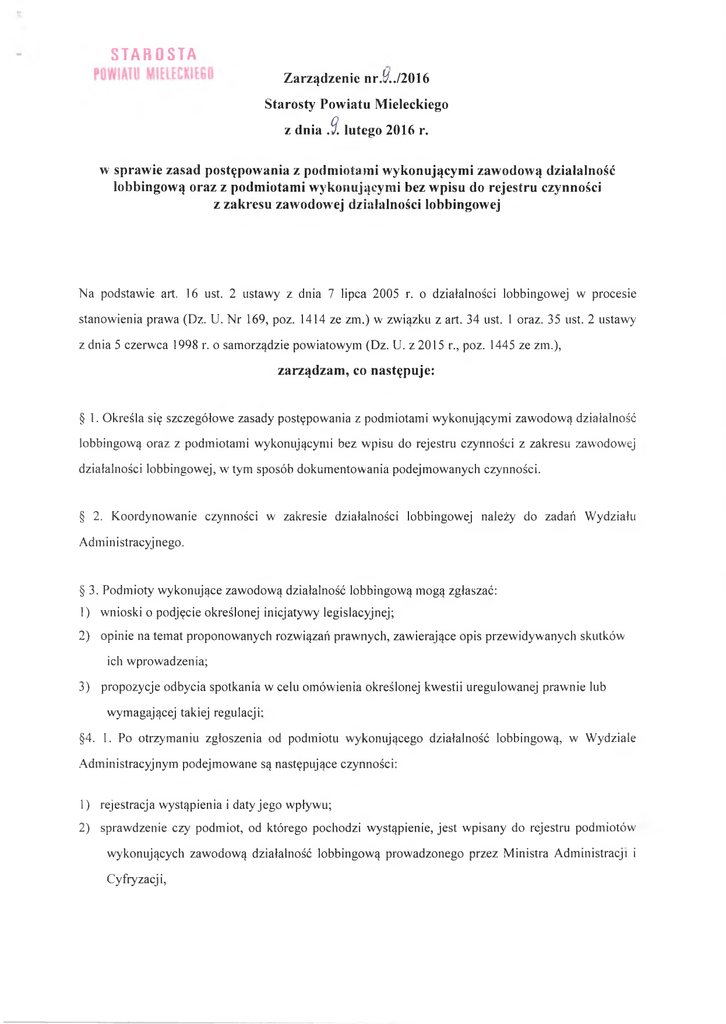 STAROSTA Zarządzenie nrJ/../2016 Starosty Powiatu Mieleckiego z dnia S . lutego 2016 r. w sprawie zasad postępowania z podmiotami wykonującymi zawodową działalność lobbingową oraz z podmiotami wykoFiująeymi bez wpisu do rejestru czynności z zakresu zawodowej działalności lobbingowej Na podstawie art. 16 ust. 2 ustawy z dnia 7 lipca 2005 r. o działalności lobbingowej w procesie stanowienia prawa (Dz. U. Nr 169, poz. 1414 ze zm.) w związku z art. 34 ust. 1 oraz. 35 ust. 2 ustawy z dnia 5 czerwca 1998 r. o samorządzie powiatowym (Dz. U. z 2015 r., poz. 1445 ze zm.), zarządzam, co następuje: § 1. Określa się szczegółowe zasady postępowania z podmiotami wykonującymi zawodową działalność lobbingową oraz z podmiotami wykonującymi bez wpisu do rejestru czynności z zakresu zawodowej działalności lobbingowej, w tym sposób dokumentowania podejmowanych czynności. § 2. Koordynowanie czynności w zakresie działalności lobbingowej należy do zadań Wydziału Administracyjnego. § 3. Podmioty wykonujące zawodową działalność lobbingową mogą zgłaszać: 1) wnioski o podjęcie określonej inicjatywy legislacyjnej; 2) opinie na temat proponowanych rozwiązań prawnych, zawierające opis przewidywanych skutków ich wprowadzenia; 3) propozycje odbycia spotkania w celu omówienia określonej kwestii uregulowanej prawnie lub wymagającej takiej regulacji; §4. 1. Po otrzymaniu zgłoszenia od podmiotu wykonującego działalność lobbingową, w Wydziale Administracyjnym podejmowane są następujące czynności: 1) rejestracja wystąpienia i daty jego wpływu; 2) sprawdzenie czy podmiot, od którego pochodzi wystąpienie, jest wpisany do rejestru podmiotów wykonujących zawodową działalność lobbingową prowadzonego przez Ministra Administracji i Cyfryzacj i, 3) w przypadku stwierdzenia, że czynności wchodzące w zakres zawodowej działalności lobbingowej są wykonywane przez podmiot niewpisany do rejestru poinformowanie o tym ministra właściwego do spraw administracji publicznej; 4) dokonanie weryfikacji wystąpienia z punktu widzenia właściwości Zarządu Powiatu lub Rady Powiatu Mieleckiego i w przypadku stwierdzenia jej braku niezwłoczne przekazanie go do organu właściwego i jednoczesne zawiadomienie o tym wnoszącego podanie; 5) przekazanie sprawy do załatwienia właściwemu merytorycznie pracownikowi Starostwa lub kierownikowi jednostki organizacyjnej; 6) opublikowanie w Biuletynie Informacji Publicznej informacji o wystąpieniu, ze wskazaniem podmiotu, od którego ono pochodzi oraz treści wystąpienia i nazwy podmiotu, na rzecz którego jest ono realizowane z wyjątkiem adresów osób fizycznych. § 5 . 1. Pracownik Starostwa albo kierownik jednostki udziela na piśmie odpowiedzi o sposobie załatwienia sprawy przedstawionej w zgłoszeniu albo wyznacza termin spotkania w celu omówienia zagadnień zawartych w tym zgłoszeniu. 2. Przebieg spotkania, o którym mowa w ust. 1, dokumentuje się w formie protokołu, który winien zawierać: 1) określenie miejsca i terminu spotkania; 2) dane identyfikujące podmiot zajmujący się zawodową działalnością lobbingową i osoby go reprezentujące; 3) dane osób biorących udział w spotkaniu; 4) przedmiot spotkania i jego przebieg; 5) sposób rozstrzygnięcia zaproponowany przez podmiot zajmujący się zawodową działalnością lobbingową oraz merytorycznie właściwego pracownika Starostwa albo kierownika jednostki; 6) podpisy uczestników spotkania. 3. Pracownik Starostwa albo kierownik jednostki przekazuje egzemplarz odpowiedzi do wiadomości Wydziału Administracyjnego. §6.1. Wydział Administracyjny prowadzi rejestr spraw załatwianych na podstawie wystąpień podmiotów wykonujących zawodową działalność lobbingową. 2. W rejestrze zamieszcza się: 1) dane podmiotu, od którego pochodzi wystąpienie; 2) informację o wpisie w rejestrze podmiotów wykonujących zawodową działalność lobbingową, o ile podmiot jest wpisany do tego rejestru; 3) datę wpływu wystąpienia do Starostwa Powiatowego w Mielcu; 4) określenie przedmiotu wystąpienia, w tym postulowanych w nim rozwiązań; 5) wskazanie podmiotów, na rzecz których zawodowa działalność lobbingowa jest wykonywana; 6) opis sposobu załatwienia sprawy, ze wskazaniem jednostki właściwej. 3. W aktach ewidencyjnych gromadzi się dokumenty, o których mowa w art. 15 ustawy. § 7. Wydział Administracyjny przygotowuje projekt informacji, o której mowa w art. 18 ustawy, w terminie do dnia 25 lutego każdego roku, przedkłada do podpisu Staroście Mieleckiemu oraz publikuje w Biuletynie Informacji Publicznej. § 8. Nadzór nad wykonaniem zarządzenia powierza się Sekretarzowi Powiatu Mieleckiego. § 9. Zarządzenie wchodzi w życie z dniem podjęcia. R z -749