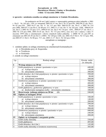 Zarządzenie nr 6/06 Burmistrza Miasta i Gminy w Drezdenku z dnia 12 stycznia 2006 roku w sprawie : ustalenia cennika za usługi cmentarne w Gminie Drezdenko. Na podstawie art.30 ust.2 pkt3 ustawy o samorządzie gminnym tekst jednolity z 2001 r Dz.U. Nr 142 poz. 1591 ze zmianami 2002.03.31 zm. Dz.U Nr 23 poz220, 2002.06.22 zm. Dz.U. Nr 62 poz.558 , 2002.10.27 zm. Dz. U. Nr 113 poz 984, 2003.01.01 zm. Dz.U. z 2002 Nr 214 poz.1806, 2003.07.11.zm Dz.U. Nr 80 poz 717, 2003.11.17 zm. Dz. U. Nr 162 poz. 1568, 2004.01.01 zm. Dz.U z 2002 Nr 153 poz 1271, 2004.07.01 zm. Dz.U Nr 116 poz. 1203, 2004.07.27 zm. Dz.U. z 2002 Nr 214 poz.1806, 2005.10.10 zm. Dz.U. Nr 172 poz.1441), oraz art.2 ust.1 ustawy z dnia 31 stycznia 1959 roku o cmentarzach i chowu zmarłych (tekst jednolity z 2000r Nr 23, poz.295 ze zmianami zm 2001.03.30 zm Dz.U z 2000 r Nr 120 poz.1268, zm. 2002.10.27 Dz.U. Nr 113 poz. 984, zm 2003.07.11 Dz.U. Nr 80 poz. 717, zm. 2003.11.17 Dz.U. Nr 162 poz.1568) zarządzam co następuje : §1 1. ustalam opłaty za usługę cmentarną na cmentarzach komunalnych : a) w Drezdenku przy ul. Kopernika b) w Trzebiczu c) w Gościmiu 2. cennik za usługi cmentarne : Lp. I 1 2 3 4 II III 1 2 3 IV 1 2 3 4 Rodzaj usługi Wykup miejsca na 20 lat Grób pojedynczy w pionie i poziomie w tym : a) wykup miejsca b) utrzymanie cmentarza Grób dziecka ( do 6 lat) pojedynczy w pionie i poziomie w tym : a) wykup miejsca b) utrzymanie cmentarza Grobowiec pojedynczy w pionie i poziomie w tym : a) wykup miejsca b) utrzymanie cmentarza Grób głębinowy, grobowiec głębinowy w tym : a) dochowanie następnej osoby - utrzymanie cmentarza Rezerwacja jednego miejsca na 20 lat (1) Opłata za następne 20 lat Grób pojedynczy w pionie i poziomie w tym : a) wykup miejsca b) utrzymanie cmentarza Grób dziecka ( do 6 lat) pojedynczy w pionie i poziomie w tym : a) wykup miejsca b) utrzymanie cmentarza Grobowiec pojedynczy w pionie i poziomie w tym : a) wykup miejsca b) utrzymanie cmentarza Opłaty za wykopanie i zasypanie grobu Grób osoby dorosłej Grób głębinowy Grób dziecka ( do 6 lat ) Grób osoby dorosłej w kwaterze rezerwowej Kwota netto (w złotych) 440,00 140,00 300,00 390,00 90,00 300,00 780,00 480,00 300,00 100,00 100,00 240,00 340,00 140,00 200,00 290,00 90,00 200,00 440,00 240,00 200,00 330,00 495,00 143,00 385,00 5 Za wykopanie i zasypanie grobu ( dodatkowo w dni wolne od pracy , po godzinie piętnastej ) a) grób osoby dorosłej b) grób głębinowy c) grób dziecka (do 6 lat) d) grób osoby dorosłej w kwaterze rezerwowej 6 Włożenie trumny do grobowca i zakrycie grobowca V Ekshumacja (2) 1 Osoby dorosłej 2 Dziecko do 6 lat VI Opłaty za uzyskanie zezwolenia na roboty (3) 1 Ustawienie nagrobka : a) grób pojedynczy b) grób rodzinny c) grób dziecka do 6 lat d) grobowiec 2 Budowa grobowca 3 Budowa krypty pod urnę 4 Rozebranie nagrobka do pogrzebu 5 Złożenie nagrobka po pogrzebie VII Opłata zryczałtowana Za wjazd dla Firm Pogrzebowych (4) VIII Inne opłaty 1. Zużycie wody na 20 lat 2. Przechowywanie zwłok w kaplicy (doba) 3. wystawienie zwłok w kaplicy 4. wjazd na cmentarz 5. Nadzór nad innymi podmiotami wykonującymi usługi pogrzebowe 6. Obsługa ceremonii pogrzebowej 7.Obsługa ceremonii pogrzebowej (dodatkowo w dni wolne od pracy i po godzinie piętnastej) 165,00 248,00 72,00 193,00 150,00 660,00 286,00 30,00 50,00 20,00 70,00 100,00 75,00 20,00 20,00 100,00 80,00 42,00 70,00 48,00 180,00 220,00 110,00 (1) przed pochówkiem należy wnieść opłatę na 20 lat. Opłata dotyczy rezerwacji miejsca pochówku – bezterminowo i jest bezzwrotna. (2) Cena obejmuje wydobycie zwłok, szczątków i przełożenie do trumny do dalszego transportu. (3) Cena obejmuje : wjazdy, nadzór, korzystanie z wody itp. (4) Opłata za jeden pogrzeb. Wszystkie wjazdy związane z przygotowaniami do ceremonii pogrzebowej. §2 Traci moc Zarządzenie Nr 10/04 Burmistrza Miasta i Gminy Drezdenko z dnia 26 lutego 2004 roku w sprawie opłat za usługi cmentarne w Gminie Drezdenko. §3 Zarządzenie wchodzi w życie po upływie 14 dni od dnia ogłoszenia w Dzienniku Urzędowym Województwa Lubuskiego