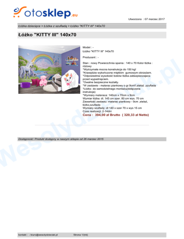 Utworzono : 07 marzec 2017 Łóżka dziecięce > Łóżka z szufladą > Łóżko "KITTY III" 140x70 Łóżko "KITTY III" 140x70 Model : Łóżko "KITTY III" 140x70 l .p Producent : Stan : nowy Powierzchnia spania : 140 x 70 Kolor łóżka : różowy *Wytrzymała mocna konstrukcja do 150 kg! *Krawędzie wykończone miękkim gumowym obrzeżem. *Odpowiednia wysokość boków łóżka zabezpieczajaca przed wypadnięciem. *Owalne bezpieczne kształty. *W zestawie - materac piankowy o gr.9cm!!,stelaż ,szuflada *Łóżko do samodzielnego montażu(dołączona instrukcja) *Wymiary materaca: 140cm x 70cm x 9cm Wymiar łóżka: dł. 145 cm szer. 80 cm wys. 70 cm Zawartość zestawu: materac piankowy - 9cm ,stelaż, łóżko,szuflada Wymiary szuflady: dł 140 x szer 70 x wys 15 cm Czas realizacji: 2-14dni k ia c e i z d y l o Cena : 394,00 zł Brutto ( 320,33 zł Netto) s e Dostępność: Produkt dostępny w naszym sklepie od 26 marzec 2015 W kontakt : - [email protected] Strona 1/{nb}