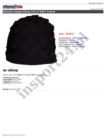 Informacje o produkcie Utworzono 07-03-2017 Damska czapka Viking 210 13 0927 Czarna Cena : 59,00 zł sp or t2 4. p l Nr katalogowy : 210 13 0927 09 Producent : Viking Dostępność : Dostępny Stan magazynowy : wysoki Średnia ocena : brak recenzji Damska czapka firmy Viking model 210 13 0927 kolor Czarny ● ● ● ● Podszewka polarowa Kod modelu: 210 13 0927 Kod koloru: 09 Czarna Kolekcja: Zima 2013/ 2014 in Kolekcja: Zima 2013/ 2014 Wygenerowano w programie www.oscGold.com