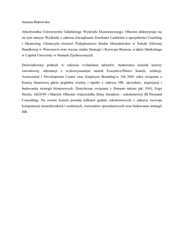 Justyna Bukowska Absolwentka Uniwersytetu Gdańskiego Wydziału Ekonomicznego. Obecnie doktoryzuje się na tym samym Wydziale z zakresu Zarządzania Zasobami Ludzkimi o specjalności Coaching i Mentoring. Ukończyła również Podyplomowe Studia Menedżerskie w Szkole Głównej Handlowej w Warszawie oraz roczne studia Strategii i Rozwoju Biznesu, a także Marketingu w Capital University w Stanach Zjednoczonych. Doświadczony praktyk w zakresie wyłaniania talentów, budowania ścieżek kariery zawodowej, rekrutacji z wykorzystaniem metod Executive/Direct Search, selekcji, Assessment i Development Centre oraz Employer Branding’u. Od 2001 roku związana z branżą finansową gdzie pogłębia wiedzę i tajniki z zakresu HR, sprzedaży, negocjacji i budowania strategii biznesowych. Dotychczas związana z firmami takimi jak: ING, Ergo Hestia, AEGON i Mariott. Obecnie właścicielka firmy doradczo - szkoleniowej JB Personal Consulting. Na swoim koncie posiada kilkaset godzin szkoleniowych z zakresu rozwoju kompetencji menedżerskich i osobistych, warsztatów sprzedażowych oraz budowania strategii HR.