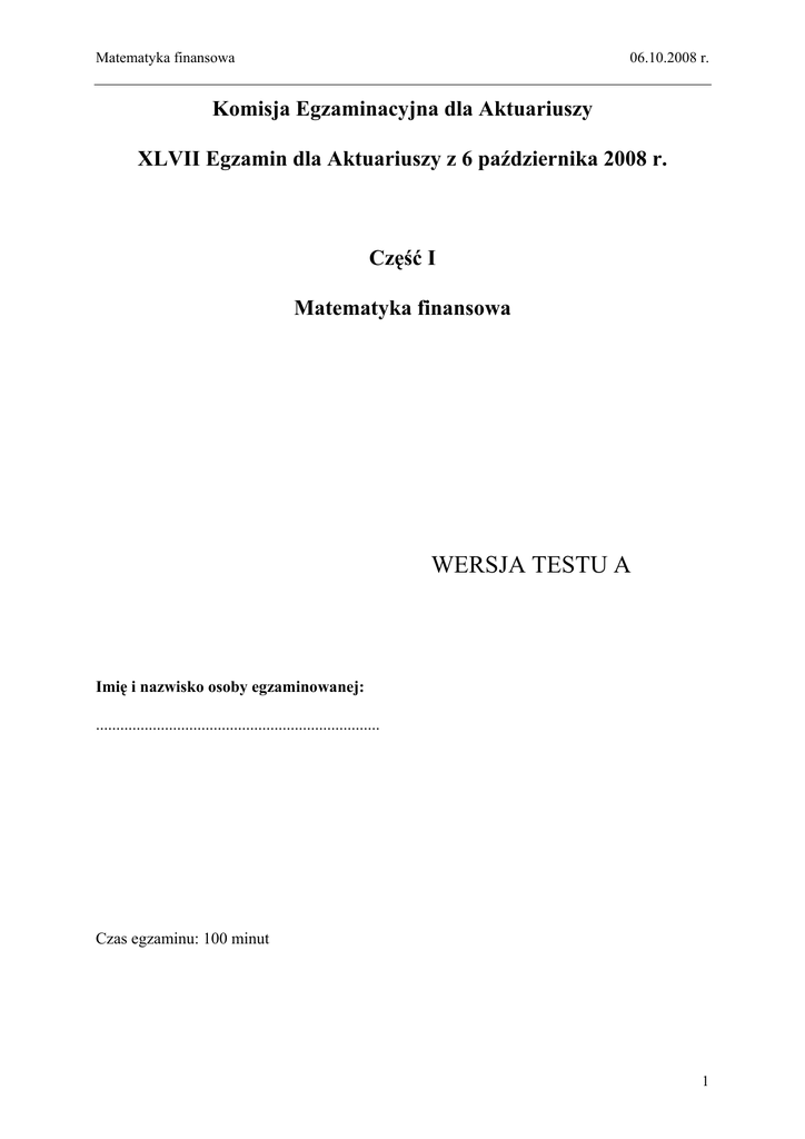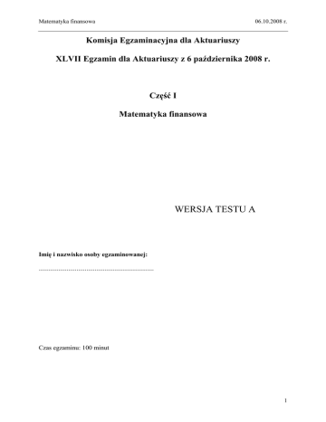 Matematyka finansowa 06.10.2008 r. Komisja Egzaminacyjna dla Aktuariuszy XLVII Egzamin dla Aktuariuszy z 6 października 2008 r. Część I Matematyka finansowa WERSJA TESTU A Imię i nazwisko osoby egzaminowanej: ...................................................................... Czas egzaminu: 100 minut 1 Matematyka finansowa 06.10.2008 r. 1. Kredytobiorca otrzyma od banku kredyt w 6 transzach, płatnych na początku roku w odstępach 3 letnich. Wysokość pierwszej transzy wyniesie 100 000, a kaŜda kolejna transza będzie mniejsza od poprzedniej o ustaloną liczbę R. KaŜda transza kredytu spłacana jest, począwszy od momentu jej otrzymania, w postaci renty o równych płatnościach na koniec kolejnych lat. W przypadku kaŜdej z powyŜszych rent ostatnia rata jest płatna na koniec roku, który kończy 25 letni okres czasu, który zaczął się w momencie otrzymania pierwszej transzy kredytu. Wyznacz wartość R (podaj najbliŜszą wartość), jeŜeli wiadomo, Ŝe całkowite zadłuŜenie kredytobiorcy po 20 latach od otrzymania pierwszej transzy kredytu (po zapłaceniu rat wymaganych w tym terminie) wynosi 200 000, a roczna stopa procentowa jest równa 5%. A) 5 000 B) 6 000 C) 7 000 D) 8 000 E) 9 000 2 Matematyka finansowa 06.10.2008 r. 2. Spółkom A i B zaproponowano następujące roczne stopy oprocentowania kredytu w wysokości 1 mln PLN: Spółka Oprocentowanie stałe Oprocentowanie zmienne A 19.00% WIBOR + 0.15% B 21.25% WIBOR + 0.9% Pierwotnie spółka A otrzymała kredyt z oprocentowaniem stałym, a B z oprocentowaniem zmiennym. Jednak spółka A potrzebuje kredytu o stopie zmiennej, podczas gdy spółka B o stopie stałej. Zaprojektowano procentowy kontrakt SWAP (kontrakt zamiany strumieni płatności) z udziałem instytucji finansowej, w ramach którego instytucja ta zyskała na transakcjach 0.5% rocznie, zaś dla obu spółek kontrakt jest jednakowo atrakcyjny. Ile wyniesie stała stopa procentowa płacona przez spółkę B w wyniku całościowego rozliczenia? A) 18.90% B) 19.00% C) 20.35 % D) 20.75% E) 21.25% 3 Matematyka finansowa 06.10.2008 r. 3. Zasady działania funduszu oszczędnościowo-rozliczeniowego są następujące: – pierwsza wpłata dokonana na początku pierwszego roku działalności funduszu wynosi 50 000, – na początku kaŜdego roku, począwszy od drugiego roku działalności, dokonywana jest wpłata do funduszu w wysokości 2 000, – na końcu kaŜdego roku (równieŜ pierwszego) dokonywana jest wypłata w wysokości 25% aktualnego stanu funduszu, – stopa procentowa funduszu wynosi 6%. Wyznacz łączną kwotę wypłaconą z funduszu w okresie od początku 9 roku do końca 25 roku działalności funduszu (podaj najbliŜszą wartość). A) 51 580 B) 51 780 C) 52 080 D) 52 380 E) 52 580 4 Matematyka finansowa 06.10.2008 r. 4. Portfel aktywów zakładu ubezpieczeń na Ŝycie składa się z trzech instrumentów: instrument A z udziałem 30%, instrument B z udziałem 30%, instrument C z udziałem 40%. Strategia inwestycyjna zakłada utrzymanie tej alokacji w horyzoncie najbliŜszych 2 lat. Dla potrzeb wyceny portfela zakłada się 4 scenariusze rozwoju rynku finansowego. Rozpatrując horyzont 2 lat załoŜenia te przedstawiają się następująco: Symulacja 1 2 3 4 Instrument Instrument A Instrument B Instrument C Instrument A Instrument B Instrument C Instrument A Instrument B Instrument C Instrument A Instrument B Instrument C Stopy zwrotu R(0, 1) R(1, 2) 5.0 7.0 6.0 4.0 10.0 12.0 12.0 10.0 23.0 17.0 1.5 2.0 13.0 8.0 18.0 14.0 10.0 2.0 3.0 1.0 12.0 8.0 2.0 5.0 R(s,t) jest stopą zwrotu z danego instrumentu w przedziale czasu od s do t. Zakładamy, Ŝe kaŜda z czterech symulacji ma takie samo prawdopodobieństwo realizacji. Wolna od ryzyka roczna stopa dyskontowa jest stała w czasie i wynosi 5% w kaŜdej symulacji. Zakład ubezpieczeń dzieli się zyskami z ubezpieczonymi przekazując część nadwyŜki zrealizowanego zwrotu ponad techniczną stopę procentową. Wypłata świadczeń z tytułu udziału w zyskach na koniec roku t obliczana jest według wzoru: PS t = MRt * 80% * max[R(t − 1, t ) − i, 0] i – techniczna stopa procentowa równa 3%, R(t – 1, t) – stopa zwrotu z portfela aktywów zrealizowana w roku t (w okresie od t – 1 do t), MRt – rezerwa na koniec roku t. Rozpatrujemy polisę dla której wartość rezerwy na koniec pierwszego roku będzie wynosić MR1 = 1 000 PLN, a na koniec drugiego roku MR2 = 1 200 PLN. Podaj obecną (na moment t = 0) oczekiwaną wartość świadczeń z tytułu udziału w zyskach wypłaconych w horyzoncie 2 lat (kapitalizacja dyskretna): A) 37.22 B) 47.62 C) 84.84 D) 91.04 E) 164.16 5 Matematyka finansowa 06.10.2008 r. 5. Firma ubezpieczeniowa posiada zobowiązania wynikające z portfela rent pewnych. Renty te są płatne w wysokości 1 mln PLN na koniec kaŜdego roku przez najbliŜszych 15 lat oraz w wysokości 2 mln PLN przez kolejnych 15 lat. Firma ulokowała całość swoich rezerw na pokrycie powyŜszych zobowiązań w 20 letniej obligacji z 8% kuponem rocznym. Oblicz róŜnicę pomiędzy duration pasywów i aktywów, zakładając, iŜ stopa procentowa wynosi 5% (podaj najbliŜszą wartość). A) 1.5 B) 2.0 C) 2.5 D) 3.0 E) 3.5 6 Matematyka finansowa 06.10.2008 r. 6. Inwestor stosuje strategię „motyla” (Butterfly spread) zbudowaną w oparciu o europejskie opcje kupna o okresie do wykonania 1 rok. Profil wypłaty (w zaleŜności od ceny instrumentu bazowego w momencie wykonania ST) przedstawiony jest na rysunku: Profil wypłaty 25.00 20.00 15.00 10.00 5.00 0.00 -5.00 -10.00 -15.00 90 100 110 120 130 140 150 160 S_T Obecne (na moment t = 0) kwotowania europejskich opcji sprzedaŜy wystawionych na instrument bazowy o obecnej cenie S0 = 120 i okresie wykonania 1 rok, w zaleŜności od ceny wykonania X przedstawione są w tabeli: Cena wykonania X Cena opcji sprzedaŜy w t = 0 100 1.3 120 6.7 150 25.5 Zmienność σ (volatility) instrumentu bazowego jest równa 20%, wolna od ryzyka stopa procento