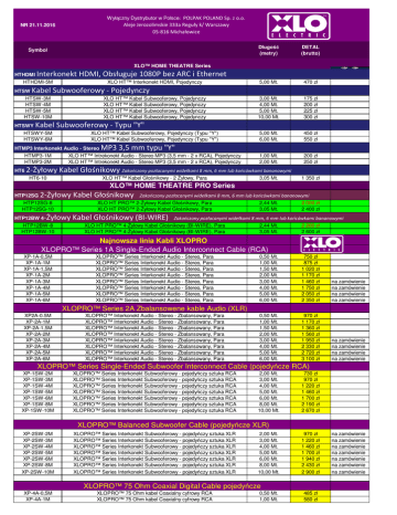 Wyłączny Dystrybutor w Polsce: POLPAK POLAND Sp. z o.o. Aleje Jerozolimskie 333a Reguły k/ Warszawy 05-816 Michałowice NR 21.11.2016 Symbol Długość (metry) DETAL (brutto) 5,00 Mt. 470 zł 3,00 Mt. 4,00 Mt. 5,00 Mt. 10,00 Mt. 175 zł 200 zł 225 zł 300 zł 5,00 Mt. 6,00 Mt. 450 zł 550 zł 1,00 Mt. 2,00 Mt. 200 zł 250 zł XLO™ HOME THEATRE Series HTHDMI Interkonekt HDMI, Obsługuje 1080P bez ARC i Ethernet HTHDMI-5M HTSW XLO HT™ Interkonekt HDMI, Pojedynczy Kabel Subwooferowy - Pojedynczy HTSW-3M HTSW-4M HTSW-5M HTSW-10M HTSWY XLO HT™ Kabel Subwooferowy, Pojedynczy XLO HT™ Kabel Subwooferowy, Pojedynczy XLO HT™ Kabel Subwooferowy, Pojedynczy XLO HT™ Kabel Subwooferowy, Pojedynczy Kabel Subwooferowy - Typu "Y" HTSWY-5M HTSWY-6M XLO HT™ Kabel Subwooferowy, Pojedynczy (Typu "Y") XLO HT™ Kabel Subwooferowy, Pojedynczy (Typu "Y") HTMP3 Interkonekt Audio - Stereo HTMP3-1M HTMP3-2M HT6 MP3 3,5 mm typu "Y" XLO HT™ Intrekonekt Audio - Stereo MP3 (3,5 mm - 2 x RCA), Pojedynczy XLO HT™ Intrekonekt Audio - Stereo MP3 (3,5 mm - 2 x RCA), Pojedynczy 2-Żyłowy Kabel Głośnikowy Zakończony pozłacanymi widełkami 8 mm, 6 mm lub końcówkami bananowymi HT6-10 XLO HT™ Kabel Głośnikowy - 2 Żyłowy, Para 3,05 Mt. 1 350 zł XLO™ HOME THEATRE PRO Series HTP12SG 2-Żyłowy Kabel Głośnikowy HTP12SG-8 HTP12SG-10 Zakończony pozłacanymi widełkami 8 mm, 6 mm lub końcówkami bananowymi XLO HT PRO™ 2-Żyłowy Kabel Głośnikowy, Para XLO HT PRO™ 2-Żyłowy Kabel Głośnikowy, Para -Żyłowy Kabel Głośnikowy (BI-WIRE) HTP12BW 4 HTP12BW-8 HTP12BW-10 2,44 Mt. 3,05 Mt. 2 000 zł 2 400 zł Zakończony pozłacanymi widełkami 8 mm, 6 mm lub końcówkami bananowymi XLO HT PRO™ 4-Żyłowy Kabel Głośnikowy (BI-WIRE), Para XLO HT PRO™ 4-Żyłowy Kabel Głośnikowy (BI-WIRE), Para 2,44 Mt. 3,05 Mt. 2 200 zł 2 600 zł Najnowsza linia Kabli XLOPRO XLOPRO™ Series 1A Single-Ended Audio Interconnect Cable (RCA) XP-1A-0,5M XP-1A-1M XP-1A-1,5M XP-1A-2M XP-1A-3M XP-1A-4M XP-1A-5M XP-1A-6M XLOPRO™ Series Interkonekt Audio - Stereo, Para XLOPRO™ Series Interkonekt Audio - Stereo, Para XLOPRO™ Series Interkonekt Audio - Stereo, Para XLOPRO™ Series Interkonekt Audio - Stereo, Para XLOPRO™ Series Interkonekt Audio - Stereo, Para XLOPRO™ Series Interkonekt Audio - Stereo, Para XLOPRO™ Series Interkonekt Audio - Stereo, Para XLOPRO™ Series Interkonekt Audio - Stereo, Para 0,50 Mt. 1,00 Mt. 1,50 Mt. 2,00 Mt. 3,00 Mt. 4,00 Mt. 5,00 Mt. 6,00 Mt. 750 zł 875 zł 1 020 zł 1 170 zł 1 460 zł 1 750 zł 2 050 zł 2 350 zł na zamówienie na zamówienie na zamówienie na zamówienie 0,50 Mt. 1,00 Mt. 1,50 Mt. 2,00 Mt. 3,00 Mt. 4,00 Mt. 5,00 Mt. 6,00 Mt. 970 zł 1 170 zł 1 360 zł 1 560 zł 1 950 zł 2 330 zł 2 720 zł 3 100 zł na zamówienie na zamówienie na zamówienie na zamówienie XLOPRO™ Series 2A Zbalansowene kable Audio (XLR) XP2A-0.5M XP-2A-1M XP-2A-1,5M XP-2A-2M XP-2A-3M XP-2A-4M XP-2A-5M XP-2A-6M XLOPRO™ Interkonekt Audio - Stereo - Zbalansowany, Para XLOPRO™ Interkonekt Audio - Stereo - Zbalansowany, Para XLOPRO™ Interkonekt Audio - Stereo - Zbalansowany, Para XLOPRO™ Interkonekt Audio - Stereo - Zbalansowany, Para XLOPRO™ Interkonekt Audio - Stereo - Zbalansowany, Para XLOPRO™ Interkonekt Audio - Stereo - Zbalansowany, Para XLOPRO™ Interkonekt Audio - Stereo - Zbalansowany, Para XLOPRO™ Interkonekt Audio - Stereo - Zbalansowany, Para XLOPRO™ Series Single-Ended Subwoofer Interconnect Cable (pojedyńcze RCA) XP-1SW-2M XP-1SW-3M XP-1SW-4M XP-1SW-5M XP-1SW-6M XP-1SW-8M XP-1SW-10M XLOPRO™ Series Interkonekt Subwooferowy - pojedyńczy sztuka RCA XLOPRO™ Series Interkonekt Subwooferowy - pojedyńczy sztuka RCA XLOPRO™ Series Interkonekt Subwooferowy - pojedyńczy sztuka RCA XLOPRO™ Series Interkonekt Subwooferowy - pojedyńczy sztuka RCA XLOPRO™ Series Interkonekt Subwooferowy - pojedyńczy sztuka RCA XLOPRO™ Series Interkonekt Subwooferowy - pojedyńczy sztuka RCA XLOPRO™ Series Interkonekt Subwooferowy - pojedyńczy sztuka RCA 2,00 Mt. 3,00 Mt. 4,00 Mt. 5,00 Mt. 6,00 Mt. 8,00 Mt. 10,00 Mt. 730 zł 970 zł 1 220 zł 1 460 zł 1 700 zł 2 190 zł 2 670 zł XLOPRO™ Balanced Subwoofer Cable (pojedyńcze XLR) XP-2SW-2M XP-2SW-3M XP-2SW-4M XP-2SW-5M XP-2SW-6M XP-2SW-8M XP-2SW-10M XLOPRO™ Series Interkonekt Subwooferowy - pojedyńczy sztuka XLR XLOPRO™ Series Interkonekt Subwooferowy - pojedyńczy sztuka XLR XLOPRO™ Series Interkonekt Subwooferowy - pojedyńczy sztuka XLR XLOPRO™ Series Interkonekt Subwooferowy - pojedyńczy sztuka XLR XLOPRO™ Series Interkonekt Subwooferowy - pojedyńczy sztuka XLR XLOPRO™ Series Interkonekt Subwooferowy - pojedyńczy sztuka XLR XLOPRO™ Series Interkonekt Subwooferowy - pojedyńczy sztuka XLR 2,00 Mt. 3,00 Mt. 4,00 Mt. 5,00 Mt. 6,00 Mt. 8,00 Mt. 10,00 Mt. 970 zł 1 220 zł 1 460 zł 1 700 zł 1 940 zł 2 430 zł 2 900 zł XLOPRO™ 75 Ohm Coaxial Digital Cable pojedyńcze XP-4A-0,5M XP-4A-1M XLOPRO™ 75 Ohm kabel Coaxialny cyfrowy RCA XLOPRO™ 75 Ohm kabel Coaxialny cyfrowy RCA 0,50 Mt. 1,00 Mt. 485 zł 580 zł na zamówienie na zamówienie na zamówienie na zamówienie na zamówienie na zamówienie na zamówienie XP-4A-1,5M XP-4A-2M XP-4A-3M XP-4A-4M XLOPRO™ 75 Ohm kabel Coaxialny cyfrowy RCA XLOPRO™ 75 Ohm kabel Coaxialny cyfrowy RCA XLOPRO™ 75 Ohm kabel Coaxialny cyfrowy RCA XLOPRO™ 75 Ohm kabel Coaxialny cyfrowy RCA XP-HD-1M XP-HD-2M XP-HD-3M XP-HD-4M XP-HD-5M XP-HD-6M XLOPRO™ HDMI 1080P/120Hz/3DVideo;4K/30 dla elektroniki z HDMI 2,0 XLOPRO™ HDMI 1080P/120Hz/3DVideo;4K/30 dla elektroniki z HDMI 2,0 XLOPRO™ HDMI 1080P/120Hz/3DVideo;4K/30 dla elektroniki z HDMI 2,0 XLOPRO™ HDMI 1080P/120Hz/3DVideo;4K/30 dla elektroniki z HDMI 2,0 XLOPRO™ HDMI 1080P/120Hz/3DVideo;4K/30 dla elektroniki z HDMI 2,0 XLOPRO™ HDMI 1080P/120Hz/3DVideo;4K/30 dla elektroniki z HDMI 2,0 1,50 Mt. 2,00 Mt. 3,00 Mt. 4,00 Mt. 680 zł 780 zł 970 zł 1 170 zł na zamówienie na zamówienie na zam
