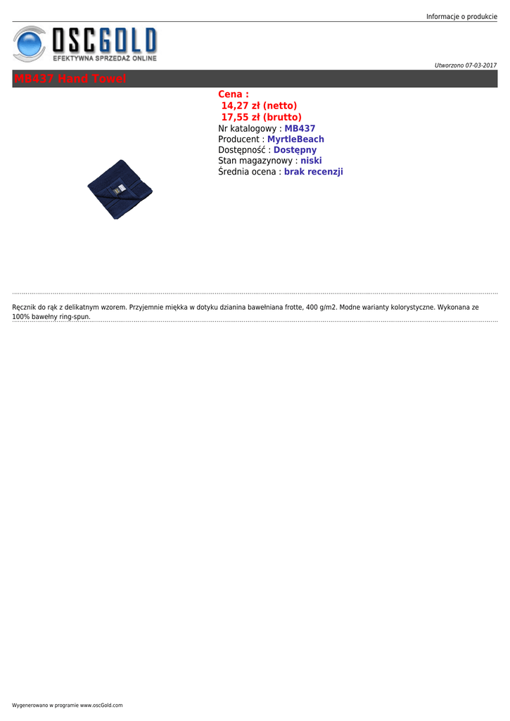 Informacje o produkcie Utworzono 07-03-2017 MB437 Hand Towel Cena : 14,27 zł (netto) 17,55 zł (brutto) Nr katalogowy : MB437 Producent : MyrtleBeach Dostępność : Dostępny Stan magazynowy : niski Średnia ocena : brak recenzji Ręcznik do rąk z delikatnym wzorem. Przyjemnie miękka w dotyku dzianina bawełniana frotte, 400 g/m2. Modne warianty kolorystyczne. Wykonana ze 100% bawełny ring-spun. Wygenerowano w programie www.oscGold.com