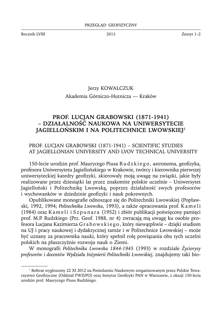 PRZEGLĄD GEOFIZYCZNY Rocznik LVIII 2013 Zeszyt 1–2 Jerzy KOWALCZUK Akademia Górniczo-Hutnicza — Kraków PROF. LUCJAN GRABOWSKI (1871-1941) – DZIAŁALNOŚĆ NAUKOWA NA UNIWERSYTECIE JAGIELLOŃSKIM I NA POLITECHNICE LWOWSKIEJ1 PROF. LUCJAN GRABOWSKI (1871-1941) – SCIENTIFIC STUDIES AT JAGIELLONIAN UNIVERSITY AND LVOV TECHNICAL UNIVERSITY 150-lecie urodzin prof. Maurycego Piusa R u d z k i e g o , astronoma, geofizyka, profesora Uniwersytetu Jagiellońskiego w Krakowie, twórcy i kierownika pierwszej uniwersyteckiej katedry geofizyki, skierowały moją uwagę na związki, jakie były realizowane przez dziesiątki lat przez znakomite polskie uczelnie – Uniwersytet Jagielloński i Politechnikę Lwowską, poprzez działalność swych profesorów i wychowanków w dziedzinie geofizyki i nauk pokrewnych. Opublikowane monografie odnoszące się do Politechniki Lwowskiej (Popławski, 1992, 1994; Politechnika Lwowska, 1993), a także opracowania prof. K a m e l i (1984) oraz K a m e l i i S z p u n a r a (1952) i zbiór publikacji poświęcony pamięci prof. M.P. Rudzkiego (Prz. Geof. 1988, nr 4) zwracają mą uwagę ku osobie profesora Lucjana Kazimierza G r a b o w s k i e g o , który niewątpliwie – dzięki studiom na UJ i pracy naukowej i dydaktycznej tamże i w Politechnice Lwowskiej – może być uznany za pracownika nauki, który spełnił rolę powiązania obu tych uczelni polskich na płaszczyźnie rozwoju nauk o Ziemi. W monografii Politechnika Lwowska 1844-1945 (1993) w rozdziale Życiorysy profesorów i docentów Wydziału Inżynierii Politechniki Lwowskiej, znajdujemy taki bioReferat wygłoszony 22 XI 2012 na Posiedzeniu Naukowym zorganizowanym przez Polskie Towarzystwo Geofizyczne (Oddział FWZiPO) oraz Instytut Geofizyki PAN w Warszawie, z okazji 150-lecia urodzin prof. Maurycego Piusa Rudzkiego. 1 82 J. Kowalczuk gram prof. Lucjana K. Grabowskiego: „GRABOWSKI Lucjan Kazimierz (18711941) astronom. Urodził się 19.V.1871 w Tarnowie, gdzie 1889 ukończył gimnazjum, po czym studiował astronomię, matematykę i fizykę na UJ. 1892-I895 asystent Obserwatorium Astronomicznego UJ. (...) 1902-1907 adiunkt Obserwatorium Astronomicznego UJ. (...) Od 1909 prof. nadzwyczajny II Katedry Miernictwa i kierownik Obserwatorium Astronomiczno-Meteorologicznego ze stacją sejsmograficzną c.k. Szkoły Politechnicznej we Lwowie. Od 1912 profesor zwyczajny astronomii sferycznej i geodezji wyższej tamże. 1914/15, 1916/17 dziekan Wydziału Inżynierii Wodnej (...). Ogłosił 55 prac z dziedziny astronomii, geodezji i grawimetrii (...). Zmarł 24.X.I941 we Lwowie.” Z. P o p ł a w s k i (1992, 1994) w swych monografiach przybliża nam również postać profesora L.K. Grabowskiego, cytując kilkanaście razy osobę profesora, przedstawia jego osiągnięcia w zakresie nauki, działalności dydaktycznej i organizacyjnej. C. Kamela (1981) omawiając lwowską szkołę geodezyjną, tak pisze o dr. L. K. Grabowskim: „Po śmierci prof. S. Widta w 1909 roku, Katedrę Miernictwa (na Politechnice Lwowskiej – zwanej w czasie zaboru austriackiego c.k. Szkołą Politechniczną) objął, jako profesor nadzwyczajny, dr Lucjan K. Grabowski. Po wyjeździe w następnym roku prof. dra Wacława Laški do Pragi, Katedrę Astronomii i Geodezji Wyższej wraz z Obserwatorium Astronomicznym, Stacją Sejsmiczną i Stacją Meteorologiczną objął prof. dr Lucjan Grabowski, mianowany w 1912 roku profesorem zwyczajnym.” Z chwilą odzyskania niepodległości w 1918 r. Szkoła Politechniczna zmieniła nazwę na Politechnika Lwowska, a wybitną rolę w kształceniu inżynierów miernictwa na tej uczelni miał prof. dr L. K. Grabowski, astronom, geodeta, geofizyk w jednej osobie, który wykładał astronomię i geodezję wyższą. A oto jak C. Kamela charakteryzuje osobę L.K. Grabowskiego: „Lucjan K. Grabowski urodził się 19 maja 1871 roku w Tarnowie. Tam uczęszczał do gimnazjum, które ukończył w 1889 roku. Następnie wstąpił na Wydział Filozoficzny UJ w Krakowie, studiując matematykę, fizykę, geofizykę i astronomię. W okresie od 1 X 1892 do 30 IX 1895 roku pełnił funkcję asystenta w Obserwatorium Astronomicznym UJ. Po ukończeniu studiów w Krakowie wyjechał dla pogłębienia wiedzy za granicę. Najpierw przebywał w Bonn, a następnie w Monachium, gdzie w 1899 roku uzyskał stopień doktora za pracę w dziedzinie astronomii. W tym samym roku powrócił da Krakowa i podjął poprzednie obowiązki w Obserwatorium Astronomicznym. W 1900 roku uzyskał stypendium Akademii Umiejętności w Krakowie i udał się do Obserwatorium Astronomicznego w Pułkowie koło ówczesnego Petersburga, w celu dalszego pogłębiania wiedzy, zwłaszcza w zakresie astronomii praktycznej. W 1902 roku powrócił do Krakowskiego Obserwatorium i objął stanowisko adiunkta. Obserwatorium to znajdowało się wówczas pod kierownictwem wybit- Prof. Lucjan Grabowski (1871-1941)... nego i zasłużonego dla nauki badacza, prof. M.P. Rudzkiego. L Grabowski był człowiekiem głębokiej kultury, znał kilka języków na równi z językiem ojczystym (...). Był miłośnikiem muzyki. Sam grywał na fortepianie, odtwarzając szczególnie chętnie utwory Chopina. Posiadał głęboką znajomość języka polskiego. Znał łacinę, grekę oraz język francuski, rosyjski, niemiecki i angielski. Posługiwał się językiem włoskim, hiszpańskim i językami skandynawskimi. Rozprawy naukowe studiował w języku oryginału. Jak widać, Lucjan Grabowski uzyskał bardzo głębokie i wielostronne przygotowanie badawcze, nic więc dziwnego, że został zaproszony do objęcia stanowiska profesora Politechniki Lwowskiej (...). Prof. L. Grabowski prowadził nie tylko działalność naukową i pedagogiczną, miał 83 Rys. 1. Lucjan Kazimierz Grabowski (1871-1941) Fig. 1. Lucjan Kazimierz Grabowski (18711941) Rys. 2. Gmach główny Politechniki Lwowskiej, ul. L. Sapiehy nr 12, Lwów Fig. 2. The main building of the Polytechnic Lvov (Lvov Tech