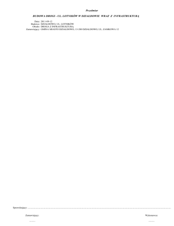 Przedmiar BUDOWA DROGI - UL. LOTNIKÓW W DZIAŁDOWIE WRAZ Z INFRASTRUKTURĄ Data: Budowa: Obiekt: Zamawiający: 2011-09-12 DZIAŁDOWO, UL. LOTNIKÓW DROGA Z INFRASTRUKTURĄ GMINA MIASTO DZIAŁDOWO, 13-200 DZIAŁDOWO, UL. ZAMKOWA 12 Sprawdzający: ...................................................................................................................................................................................................................................................... Zamawiający: Wykonawca: .......... .......... Działdowo Lotników 2 Zuzia (C) DataComp 1994-2005(lic. 3606) strona nr: 2 Przedmiar Podstawa nakładu, opis pozycji, wyliczenie ilości robót Ilość Krot. Jedn. 1 PRACE ROZBIÓRKOWE 1 KNR 231/813/3 Rozebranie krawężników, betonowych 15x30·cm na podsypce cementowo-piaskowej 5,00+23,00 = 28,0 28,0 ~28,000 m 1,47 0,84 2,31 ~2,310 m3 ~3,570 m3 3,57 m3 3,57 12,0 m3 ~7,140 ton 2 KNR 231/812/3 Rozebranie ław pod krawężniki, ławy z betonu 0,15*0,35*28,00 0,15*0,20*28,00 = = 3 KNR 404/1103/1 Wywiezienie gruzu z terenu rozbiórki przy mechanicznym załadowaniu i wyładowaniu, załadowanie koparko-ładowarką samochodów samowyładowczych, przy obsłudze 3 samochodów na zmianę R= 0,955 M= 1,000 S= 1,000 krawężniki z demontażu 28,00*0,15*0,30 = 1,26 ławy z rozbiórki 2,31 = 2,31 3,57 4 KNR 404/1103/4 Wywiezienie gruzu z terenu rozbiórki przy mechanicznym załadowaniu i wyładowaniu, transport samochodem samowyładowczym na odległość 1 km R= 0,955 M= 1,000 S= 1,000 5 KNR 404/1103/5 Wywiezienie gruzu z terenu rozbiórki przy mechanicznym załadowaniu i wyładowaniu, nakłądy uzupełniające na każdy dalszy rozpoczęty 1·km ponad 1·km transportu R= 0,955 M= 1,000 S= 1,000 6 KALK WŁASNA Koszt utylizacji - krawężniki, ławy z rozbiórki 3,57*2,00 = 7,14 7,14 7 KNR 202/1803/2 Ogrodzenia z siatki na słupkach stalowych obsadzonych w cokole, wys. 1,50 m - ANALOGIA - DEMONTAŻ 8 KNR 401/212/2 Roboty rozbiórkowe, elementy betonowe niezbrojone, grubości ponad 15·cm - FUNDAMENT POD OGRODZENIE 0,30*0,40*32,50 = 3,9 3,9 9 KNR 404/1103/1 Wywiezienie gruzu z terenu rozbiórki przy mechanicznym załadowaniu i wyładowaniu, załadowanie koparko-ładowarką samochodów samowyładowczych, przy obsłudze 3 samochodów na zmianę R= 0,955 M= 1,000 S= 1,000 10 KNR 404/1103/4 Wywiezienie gruzu z terenu rozbiórki przy mechanicznym załadowaniu i wyładowaniu, transport samochodem samowyładowczym na odległość 1 km R= 0,955 M= 1,000 S= 1,000 11 KNR 404/1103/5 Wywiezienie gruzu z terenu rozbiórki przy mechanicznym załadowaniu i wyładowaniu, nakłądy uzupełniające na każdy dalszy rozpoczęty 1·km ponad 1·km transportu R= 0,955 M= 1,000 S= 1,000 12 KALK WŁASNA Koszt utylizacji - fundament pod ogrodzenie 3,90*2,00 = 7,8 7,8 13 KNRW 202/1808/2 Wrota z furtką z siatki w ramach stalowych na gotowych słupkach, szerokość 3.0+1.0·m, wysokość 1.6·m - ANALOGIA ROZEBRANIE FURTKI NA SŁUPKACH 14 KNR 202/1804/2 Ogrodzenia z siatki na słupach żelbetowych prefabrykowanych, wysokość 1,5·m, słupki 16x12x255·cm w gruncie ANALOGIA - DEMONTAŻ 15 KNR 510/9917/1 Zeszyt 6 1993r. Demontaż ręczny słupów drewnianych nieoszczudlonych, słup pojedynczy do 10·m z ustojem 16 KNR 231/807/1 Rozebranie nawierzchni z kostki betonowej 17 KNR 231/1406/5 Regulacja pionowa studzienek dla urządzeń podziemnych, studzienki telefoniczne 18 KNR 231/1406/3 Regulacja pionowa studzienek dla urządzeń podziemnych, włazy kanałowe - ISTNIEJĄCE 19 KNR 231/1406/3 Regulacja pionowa studzienek dla urządzeń podziemnych, włazy kanałowe - PROJEKTOWANE KD 20 KNR 231/1406/3 Regulacja pionowa studzienek dla urządzeń podziemnych, włazy kanałowe - PROJEKTOWANE KS 32,50 0,60 m ~3,900 m3 3,90 m3 3,90 m3 3,90 12,0 m3 ~7,800 ton 1,00 0,15 kpl 28,00 0,60 m 1,00 szt 51,00 m2 1,00 szt 4,00 szt 5,00 szt 4,00 szt 0,0015 ha 2 WYCINKA DRZEW 21 KNR 201/109/4 Ręczne ścinanie i karczowanie, krzaki i podszycia gęste 22 KNR 201/110/3 Wywożenie dłużyc, karpiny i gałęzi, transport na odległość do 2·km, gałęzie 3,75 mp BUDOWA DROGI - UL. LOTNIKÓW W DZIAŁDOWIE WRAZ Z INFRASTRUKTURĄ Działdowo Lotników 2 Zuzia (C) DataComp 1994-2005(lic. 3606) strona nr: 3 Podstawa nakładu, opis pozycji, wyliczenie ilości robót 23 KNR 201/111/1 Oczyszczenie terenu z pozostałości po wykarczowaniu, drobne gałęzie, korzenie, kora i wrzos ze spaleniem na miejscu 24 KNR 201/103/2 Ścinanie drzew piłą mechaniczną, Fi·16-25·cm DRZEWKA OWOCOWE Z DZIAŁKI 2041/1 25 KNR 201/102/2 Ręczne karczowanie drzew, Fi·16-25·cm - ANALOGIA - POCIĘCIE DŁUŻYC NA ODCINKI 30 CM 26 KNR 201/110/2 Wywożenie dłużyc, karpiny i gałęzi, transport na odległość do 2·km, karpina Ilość Krot. Jedn. 15,00 m2 2,00 szt 2,00 szt 1,00 mp 936,94 m3 936,94 m3 0,1311 ha 3 ROBOTY ZIEMNE - WYKOPY, NASYPY 27 KNR 201/228/2 Wykopy wykonywane spycharkami, 55·kW (75·KM), grunt kategorii III 28 KNR 201/237/1 Zagęszczanie nasypów walcami, walec ciągniony, grunt sypki kategorii I-III 4 NAWIERZCHNIA BITUMICZNA 29 KNR 201/121/2 Roboty pomiarowe przy powierzchniowych robotach ziemnych, koryta pod nawierzchnie placów postojowych 30 KNR 231/101/1 Koryta wykonywane na całej szerokości jezdni i chodników, mechanicznie, grunt kategorii I-IV, na głębokości 20·cm 31 KNR 231/101/2 Koryta wykonywane na całej szerokości jezdni i chodników, mechanicznie, grunt kategorii I-IV, dodatek za każde dalsze 5·cm głębokości - DODATKOWO 45 CM 32 KNR 201/126/1 Usuniecie warstwy ziemi urodzajnej (humus) przy pomocy spycharek, grubość warstwy do 15·cm - PRZYJĘTO GRUBOŚĆ 30,00 CM 33 KNR 201/126/2 Usuniecie warstwy ziemi urodzajnej (humus) przy pomocy spycharek, dodatek za każde dalsze 5·cm grubościCAŁKOWITA GRUBOŚĆ 30,00 CM - DODATEK ZA 15 CM 34 KNR 201/206/1 Roboty ziemne koparkami podsiębiernymi z transportem urobku samochodami samowyładowczymi do 1·km, koparka 0,40·m3, grunt kategorii I-II-PRZEMIESZCZENIE GRUNT