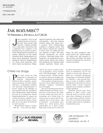 NR 07/10 (5552) 14 - 20 II 2010 VI Niedziela Zwykła ISSN 1506-3089 Tygodnik Michalickiej Parafii Matki Bożej Królowej Aniołów na Bemowie JAK ROZUMIEĆ? VI NIEDZIELA ZWYKŁA, 6,17.20-26 J ezus zeszedł z nimi na dół i zatrzymał się na równinie. Był tam duży poczet Jego uczniów i wielkie mnóstwo ludu z całej Judei i Jerozolimy oraz z wybrzeża Tyru i Sydonu; A On podniósł oczy na swoich uczniów i mówił: Błogosławieni jesteście wy, ubodzy, albowiem do was należy królestwo Boże. Błogosławieni wy, którzy teraz głodujecie, albowiem będziecie nasyceni. Błogosławieni wy, którzy teraz płaczecie, albowiem śmiać się będziecie. Błogo- Chleb na drogę P rzez wieki wyroiło się wiele interpretacji i komentarzy do tetekstów błogosławieństw. Większość idzie w kierunku „właściwego zrozumienia” ich treści. Niejednokrotnie, z wydźwiękiem osłabiającym przesłanie błogosławieństw. Z pozoru wydają się tak radykalne, że czym prędzej trzeba dać czytelnikowi klucz interpretacyjny, dzięki któremu nie musi się on przejmować zbytnio błogosławieństwami, bo znaczą one „trochę” lub nawet „zupełnie” coś innego. Nie trzeba ich usuwać z Ewangelii, ale tez nie należy ich dosłownie czy serio rozumieć. Błogosławieni ubodzy w duchu. - Tak, ale... - Lista ALE jest długa - , sławieni będziecie, gdy ludzie was znienawidzą, i gdy was wyłączą spośród siebie, gdy zelżą was i z powodu Syna Człowieczego podadzą w pogardę wasze imię jako niecne: cieszcie się i radujcie w owym dniu, bo wielka jest wasza nagroda w niebie. Tak samo bowiem przodkowie ich czynili prorokom. Natomiast biada wam, bogaczom, bo odebraliście już pociechę waszą. Biada wam, którzy teraz jesteście syci, albowiem głód cierpieć będziecie. Biada wam, ALE to nie znaczy, że mamy wyzbywać się pieniędzy i rzeczy materialnych. (Uff! Dzieki Bogu! - nie takie to zatem straszne) - Chodzi o duchowe ubóstwo, które jest możliwe przy dużych pieniądzach i posiadłościach. Nie posądzam interpretatorów o złą wolę. Często jednak dzięki takim zabiegom następuje neutralizacja mocy Ewangelii. Jak czytać zatem Kazanie na Górze i Błogosławieństwa? Przede wszystkim jest to słowo Jezusa. Do ciebie. I na dziś. Celem tego słowa jest zakorzenienie się w twoim życiu. Co więcej, nie jest to słowo tylko do zrozumienia. Jest to słowo, które – idąc za Izajaszem – ma przynieść owoc. Zderza się z twoim życiem, chcąc poprowadzić cię w Boży wymiar. Stąd, kiedy czytasz dziś to słowo, nie GODRVURGND 0LFKDHO którzy się teraz śmiejecie, albowiem smucić się i płakać będziecie. Biada wam, gdy wszyscy ludzie chwalić was będą. Tak samo bowiem przodkowie ich czynili fałszywym prorokom. jest takie ważne JAK je rozumieć (bo różne są możliwości), ale CO ono zmienia w twoim życiu. Możesz zaplątać się w mnogość interpretacji, zatrzymując je na poziomie spekulacji. Niektórzy z tego powodu decydują się nawet na podjęcie studiów teologicznych, aby pojąć sens słowa. Kończą studia z jeszcze większym bagażem jeszcze bardzie wysublimowanych spekulacji. Spokojnie pozwól temu słowu wpłynąć na ciebie. Czytaj i pytaj siebie jak masz żyć, aby być wierny temu słowu. Rozejrzyj się pożyciu. To i tamto musisz zmienić. Uczyń to teraz. Bo to jest Boża metoda dialogu i Jego zaproszenie do współpracy nad przemianą życia. Jak przekazać 1% podatku? Instrukcja na str. 4 2 07/2010 40 DNI KOŚCIÓŁ ŻYWY Wędrówka ku świętom paschalnym, którą podejmuje Kościół w okresie wielkopostnym, jest drogą pokuty, ściśle związaną z głęboką refleksją nad własnym życiem... Jan Paweł II Z aledwie miesiąc minął od rozpoczęcia Nowego Roku, a myślami wybiegamy w stronę, która zupełnie nie kojarzy się z kolorami sylwestrowego wieczoru. 17 lutego w Środę Popielcową rozpocznie się w Kościele czas Wielkiego Postu. I od tego momentu będziemy się przygotowywali do świąt Zmartwychwstania Pańskiego. Co zrobić, aby dobrze przygotować się do tych świąt? Kościół od wieków mówi, ze jest jedna recepta bardzo prosta: modlitwa, jałmużna i post. Modlitwa rozpala w nas miłość do Boga, jałmużna otwiera nasze oczy na potrzeby braci, a post pomaga nam pokonywać naszego najbardziej egoistycznego wroga, którym jest nasz egoizm. Nic zatem prostszego, jak modlić się, pościć oraz być dobrym dla bliźnich. Nic prostszego, a jednak... A jednak nawet w okresie Wielkiego Postu trudno nam zdobyć się na dłuższą modlitwę lub gest miłosierdzia. Dlaczego? Zapewne dlatego, że na co dzień zajęci jesteśmy zupełnie inną, chorą ,,ascezą”. Która tak bardzo nas absorbuje, że na prawdziwą pobożność już nie starcza nam sił ani czasu. Czym zajmujemy się na co dzień? To proste: szukamy chleba, pracujemy na chleb, bardzo często lekceważymy przy tym Boga i bliźnich- doświadczamy tych samych pokus, których kiedyś na pustyni doświadczył sam Chrystus, a które dzisiaj nazywamy konsumpcjonizmem, sceptycyzmem religijnym i relatywizmem moralnym. Chrystus pomaga nam walczyć z tymi pokusami. Uczy nas modlitwy, a zarazem uświadamia, że pokusa nigdy nie daje tego, co obiecuje, lecz zniewala, a ponadto narzuca nam fałszywą, wprost nieludzką ,,ascezę”. Człowiek zniewolony nieustannie ,,modli się” do bożków, którymi są jego własne ambicje i problemy, a ponadto nieustannie ,,pości”, gdyż wyrzeka się dobra największego ze wszystkich, jakim jest darmowa łaska obcowania z Panem Bogiem. Nic zatem dziwnego, że nasz zniewolony samym sobą ,,asceta’’ tylko z trudem zdobywa się na gest dobroci względem bliźnich. Kochać kogoś prócz siebie, to dla niego rodzaj jałmużny, na którą zdobywa się tylko z trudem i z rzadka. Modlitwa, jałmużna i po- ANONIMOWI ALKOHOLICY NASZE SPRAWY N a terenie Parafii Matki Bożej Królowej Aniołów spotykają się Anonimowi Alkoholicy ora
