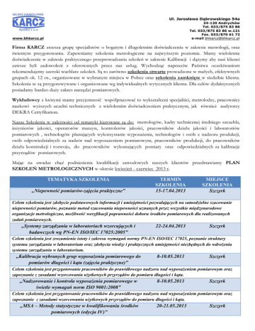 Ul. Jarosława Dąbrowskiego 54a 34-120 Andrychów Tel. 033/875 83 86 Tel. 033/875 83 86 w.121 Fax. 033/870 61 72 e-mail [email protected] www.bhkarcz.pl Firma KARCZ zrzesza grupę specjalistów o bogatym i długoletnim doświadczeniu w zakresie metrologii, oraz świetnym przygotowaniu. Zapewniamy szkolenia metrologiczne na najwyższym poziomie. Mamy wieloletnie doświadczenie w zakresie praktycznego przeprowadzania szkoleń w zakresie Kalibracji i dążymy aby nasi klienci zawsze byli zadowoleni z oferowanych przez nas usług. Wychodząc naprzeciw Państwa oczekiwaniom rekomendujemy szeroki wachlarz szkoleń. Są to zarówno szkolenia otwarte prowadzone w małych, efektywnych grupach ok. 12 os., organizowane w wybranym miejscu w Polsce oraz szkolenia zamknięte w siedzibie klienta. Szkolenia te są przygotowywane i organizowane wg indywidualnych wytycznych klienta. Dla celów dydaktycznych posiadamy bardzo duży zakres narzędzi pomiarowych. Wykładowcy z którymi mamy przyjemność współpracować to wykształceni specjaliści, metrolodzy, pracownicy naukowi wyższych uczelni technicznych z wieloletnim doświadczeniem praktycznym, jak również audytorzy DEKRA Certyfikation. Nasze Szkolenia w zależności od tematyki kierowane są do: metrologów, kadry technicznej średniego szczebla, inżynierów jakości, operatorów maszyn, kontrolerów jakości, pracowników działu jakości i laboratoriów pomiarowych , technologów planujących wykorzystanie wyposażenia, technologów i osób z nadzoru produkcji, osób odpowiedzialnych za nadzór nad wyposażeniem pomiarowym, pracowników produkcji, do pracowników działu konstrukcji i rozwoju, do pracowników wykonujących pomiary oraz odpowiedzialnych za kalibracje przyrządów pomiarowych. Mając na uwadze chęć podniesienia kwalifikacji zawodowych naszych klientów przedstawiamy PLAN SZKOLEŃ METROLOGICZNYCH w okresie kwiecień - czerwiec 2013 r. TEMATYKA SZKOLENIA „Niepewność pomiarów-zajęcia praktyczne” TERMIN SZKOLENIA 15-17.04.2013 MIEJSCE SZKOLENIA Szczyrk Celem szkolenia jest zdobycie podstawowych informacji i umiejętności pozwalających na samodzielne szacowanie niepewności pomiarów, poznanie metod szacowania niepewności uznanych przez wszystkie międzynarodowe organizacje metrologiczne, możliwość weryfikacji poprawności doboru środków pomiarowych dla realizowanych zadań pomiarowych. „Systemy zarządzania w laboratoriach wzorcujących i badawczych wg PN-EN ISO/IEC 17025:2005” 22-24.04.2013 Szczyrk Celem szkolenia jest zrozumienie istoty i zakresu wymagań normy PN-EN ISO/IEC 17025, poznanie struktury systemu zarządzania w laboratorium oraz zdobycia wiedzy i praktycznych umiejętności niezbędnych do wdrożenia systemu zarządzania w laboratorium. „Kalibracja wybranych grup wyposażenia pomiarowego do pomiarów długości i kąta (zajęcia praktyczne)” 8-10.05.2013 Szczyrk Celem szkolenia jest przygotowanie pracowników do prawidłowego nadzoru nad wyposażeniem pomiarowym oraz zapoznanie z zasadami wzorcowania użytkowych przyrządów do pomiaru długości i kąta. „Nadzorowanie i kontrola wyposażenia pomiarowego w świetle wymagań norm ISO 9001:2008” 8-10.05.2013 Szczyrk Celem szkolenia jest przygotowanie pracowników do prawidłowego nadzoru nad wyposażeniem pomiarowym oraz zapoznanie z zasadami wzorcowania użytkowych przyrządów do pomiaru długości i kąta. „MSA – Metody statystyczne w kwalifikowaniu środków pomiarowych (edycja IV)” 20-21.05.2013 Szczyrk Celem szkolenia jest przygotowanie pracowników do planowania i realizacji oceny zdolności środków pomiarowych w myśl wymagań specyfikacji ISO/TS 16949:2002, QS 9000. „MSA & SPC - Metody statystyczne w badaniu zdolności systemów pomiarowych i sterowaniu procesami” Edycja IV 20-22.05.2013 Szczyrk Celem szkolenia jest zapoznanie z metodami statystycznego sterowania procesem a także przygotowanie do planowania i realizowania procedur SPC, jak również przygotowanie pracowników do planowania i realizacji oceny zdolności systemów pomiarowych w myśl wymagań ISO/TS 16949 oraz podręcznika MSA 4 wyd. „Zaawansowane metody wymiarowania i tolerowania oraz oceny zgodności ze specyfikacją wg ISO” 23-24.05.2013 Szczyrk Celem jest przeszkolenie pracowników do pracy w zakresie kompleksowego przygotowania oraz interpretacji dokumentacji technicznej z uwzględnieniem zapisu i odczytywania złożonych wymagań. „Wymiarowanie i tolerowanie wraz z interpretacją rysunku technicznego wg obowiązujących norm ISO model GPS” 27-28.05.2013 Zakopane Celem szkolenia jest przygotowanie pracowników do korzystania z dokumentacji technicznej, polegające na poprawnym interpretowaniu tolerancji wymiarowych i geometrycznych i na możliwości adaptacji dokumentacji w zakresie tolerancji. „GD&T – ASME 14.5-2009 Tolerowanie Geometryczne – praktyka przemysłowa” 3-4.06.2013 Zakopane Celem szkolenia jest przygotowanie pracowników do korzystania z dokumentacji technicznej, polegające na poprawnym interpretowaniu tolerancji wymiarowych i geometrycznych zgodnie z amerykańskim standardem ASME 14.5-2009. „MSA – Metody statystyczne w kwalifikowaniu środków pomiarowych (edycja IV)” 3-4.06.2013 Szczyrk Celem szkolenia jest przygotowanie pracowników do planowania i realizacji oceny zdolności środków pomiarowych w myśl wymagań specyfikacji ISO/TS 16949:2002, QS 9000. „MSA & SPC - Metody statystyczne w badaniu zdolności systemów pomiarowych i sterowaniu procesami” Edycja IV 3-5.06.2013 Szczyrk Celem szkolenia jest zapoznanie z metodami statystycznego sterowania procesem a także przygotowanie do planowania i realizowania procedur SPC, jak również przygotowanie pracowników do planowania i realizacji oceny zdolności systemów pomiarowych w myśl wymagań ISO/TS 16949 oraz podręcznika MSA 4 wyd. „Metrologia w systemach jakości - podejście praktyczne” 20-21.06.2013 Szczyrk Celem szkolenia jest przygotowanie prac