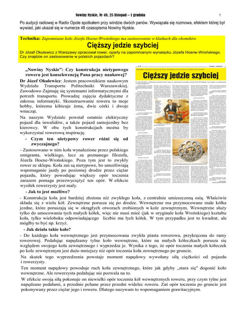 Nowiny Nyskie, Nr 48, 25 listopad – 1 grudnia 1 Po audycji radiowej w Radio Opole spotkałem przy windzie dwóch panów. Wywiązała się rozmowa, efektem której był wywiad, jaki ukazał się w numerze 48 czasopisma Nowiny Nyskie. Technika: Zapomniane koło Józefa Hoene-Wrońskiego ma zastosowanie w klatkach dla chomików Cięższy jedzie szybciej Dr Józef Okulewicz z Warszawy opracował rower, oparły na zapomnianym wynalazku Józefa Hoene-Wrońskiego. Czy znajdzie on zastosowanie w polskich pojazdach? „Nowiny Nyskie”: Czy konstrukcja nietypowego roweru jest konsekwencją Pana pracy naukowej? Dr Józef Okulewicz: Jestem pracownikiem naukowym Wydziału Transportu Politechniki Warszawskiej. Zawodowo Zajmuję się systemami informatycznymi dla potrzeb transportu. Prowadzę zajęcia dydaktyczne z zakresu informatyki. Skonstruowanie roweru to moje hobby, któremu kibicuje żona, dwie córki i dwoje wnucząt. Na naszym Wydziale powstał ostatnio elektryczny pojazd dla inwalidów, a także pojazd samojezdny bez kierowcy. W obu tych konstrukcjach można by wykorzystać rowerową inspirację. - Czym ten nietypowy rower różni się od zwyczajnego? - Zastosowano w nim koła wynalezione przez polskiego emigranta, wielkiego, lecz za poznanego filozofa, Józefa Hoene-Wrońskiego. Poza tym jest to zwykły rower ze sklepu. Koła zaś są nietypowe, bo umożliwiają wspomaganie jazdy po poziomej drodze przez ciężar pojazdu, który powodując większy opór toczenia zarazem pomaga przezwyciężyć ten opór. W efekcie wysiłek rowerzysty jest mały. - Jak to jest możliwe? - Konstrukcja koła jest bardziej złożona niż zwykłego koła, z centralnie umieszczoną osią. Właściwie składa się z wielu kół. Zewnętrzne porusza się po drodze. Wewnętrzne ma przymocowane małe kółka jezdne, które poruszają się w okrągłych otworach zrobionych w kole zewnętrznym. Wewnętrzne służy tylko do umocowania tych małych kółek, więc nie musi mieć (jak w oryginale koła Wrońskiego) kształtu koła, tylko wieloboku odpowiadającego liczbie ma łych kółek. W tym przypadku jest to kwadrat, ale mógłby to być np. krzyż. - Jak działa takie koło? - Do każdego koła wewnętrznego jest przymocowana zwykła piasta rowerowa, przykręcona do ramy rowerowej. Pedałując napędzamy tylne koło wewnętrzne, które na małych kółeczkach porusza się względem swojego koła zewnętrznego i wyprzedza je. Wynika z tego, że opór toczenia małych kółeczek po kole zewnętrznym jest dużo mniejszy niż opór toczenia koła zewnętrznego po gruncie. Na skutek tego wyprzedzenia powstaje moment napędowy wywołany siłą ciężkości od pojazdu i rowerzysty. Ten moment napędowy powoduje ruch koła zewnętrznego, które jak gdyby „stara się" dogonić koło wewnętrzne. Ale rowerzysta pedałując nie pozwala na to. W efekcie swoją siłą pokonuje on niewielki opór toczenia kół wewnętrznych roweru, przy czym tylne jest napędzane pedałami, a przednie pchane przez przedni widelec roweru. Zaś opór toczenia po gruncie jest pokonywany przez ciężar jego i roweru. Dlatego nazywam to wspomaganiem grawitacyjnym. Nowiny Nyskie, Nr 48, 25 listopad – 1 grudnia 2 - Czy zjawisko to nie było dotąd wykorzystywane? - W zastosowaniu do transportu nie, ale do zabawy tak. Np. chomik bawi się biegając w obracającym się kole. Polega to na tym, że biegnąc wysuwa środek ciężkości swojego ciała przed środek ciężkości koła. Pojawia się wtedy grawitacyjny moment obrotowy, który obraca koło i chomik znowu jest na dole koła. I tak bez końca. Obracając nawet ciężkie koło chomik się nie męczy, bo on tylko biegnie po niemal płaskim terenie. W kole Hoene-Wrońskiego mamy do czynienia z wieloma takimi kołami (w przypadku tego roweru są cztery takie koła). - Czy takie koło może mieć zastosowanie do ogólnego użytku? Jeśli tak, to co za tym przemawia? - Nietrudno przewidzieć jak szerokie może mieć to zastosowanie. Wszystkie pojazdy można będzie na nowo przeprojektować. Pojazdy typu rower będą stanowić jedynie marginalne zastosowanie tych kół. Wszędzie tam, gdzie wozi się ładunki, zastosowanie kół Hoene-Wrońskiego spowoduje, że potrzebna siła napędowa będzie mniejsza, bo ma służyć tylko do poruszania pustego pojazdu. Nakładany ładunek pomagałby napędzać pojazd. - Dlaczego więc tak wartościowy wynalazek został niedoceniony? - Dziś można tylko snuć przypuszczenia. Przede wszystkim powstał trochę za późno. Hoene Wroński miał już prawie 60 lat. Może nawet był zmęczony nieudanymi próbami rozpropagowania swojej filozofii, która jego zdaniem była ratunkiem dla ludzkości, a w szczególności dla Polski. Do tego dochodził ciągły brak pieniędzy. Miał nadzieje, że jak zbuduje pojazd konkurencyjny wobec rozwijającego się transportu kolejowego, to podreperuje swoje finanse. Tymczasem, aby można było jeździć pojazdami napędzanymi silnikiem parowym, który wówczas był za ciężki na zwykłe drogi, trzeba było kłaść szyny. Do końca lat 30-tych w Europie i Ameryce ułożono już 2400 km torów. Długość torów podwajała się co dziesięć lat. Gwałtowny rozwój kolejnictwa wynikał z drastycznego obniżenia stawek przewozowych i zwiększenia dystansu, na jakim można było szybko przewozić duże masy towarów, a potem pasażerów. W takich warunkach jedynym sposobem na zagwarantowanie sobie zwrotu kosztów położonych torów było uzyskanie monopolu na koncesje przewozowe. Zatem pomysł Hoene-Wrońskiego z 1836 roku, by pojazdy jeździły po zwykłych drogach napędzane siłą ludzką lub niewielkim silnikiem, napotkał opór ze strony monopolistów. Nie chcieli i nie mogli oni dopuścić środka transportu, który czynił niepotrzebnymi położone już tory kolejowe. Wroński napisał skargę do króla Francji, a potem, a potem i do cara Rosji, ale nic nie wskórał. Po niemal 20-letnich staraniach zmarł rozgoryczony w 1853