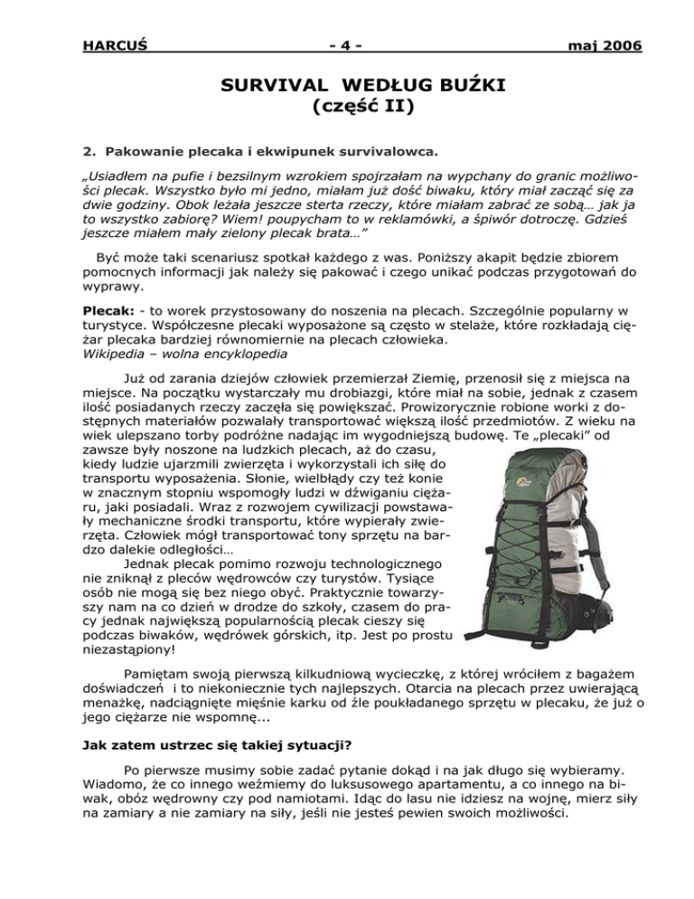 HARCUŚ -4- maj 2006 SURVIVAL WEDŁUG BUŹKI (część II) 2. Pakowanie plecaka i ekwipunek survivalowca. „Usiadłem na pufie i bezsilnym wzrokiem spojrzałam na wypchany do granic moŜliwości plecak. Wszystko było mi jedno, miałam juŜ dość biwaku, który miał zacząć się za dwie godziny. Obok leŜała jeszcze sterta rzeczy, które miałam zabrać ze sobą… jak ja to wszystko zabiorę? Wiem! poupycham to w reklamówki, a śpiwór dotroczę. Gdzieś jeszcze miałem mały zielony plecak brata…” Być moŜe taki scenariusz spotkał kaŜdego z was. PoniŜszy akapit będzie zbiorem pomocnych informacji jak naleŜy się pakować i czego unikać podczas przygotowań do wyprawy. Plecak: - to worek przystosowany do noszenia na plecach. Szczególnie popularny w turystyce. Współczesne plecaki wyposaŜone są często w stelaŜe, które rozkładają cięŜar plecaka bardziej równomiernie na plecach człowieka. Wikipedia – wolna encyklopedia JuŜ od zarania dziejów człowiek przemierzał Ziemię, przenosił się z miejsca na miejsce. Na początku wystarczały mu drobiazgi, które miał na sobie, jednak z czasem ilość posiadanych rzeczy zaczęła się powiększać. Prowizorycznie robione worki z dostępnych materiałów pozwalały transportować większą ilość przedmiotów. Z wieku na wiek ulepszano torby podróŜne nadając im wygodniejszą budowę. Te „plecaki” od zawsze były noszone na ludzkich plecach, aŜ do czasu, kiedy ludzie ujarzmili zwierzęta i wykorzystali ich siłę do transportu wyposaŜenia. Słonie, wielbłądy czy teŜ konie w znacznym stopniu wspomogły ludzi w dźwiganiu cięŜaru, jaki posiadali. Wraz z rozwojem cywilizacji powstawały mechaniczne środki transportu, które wypierały zwierzęta. Człowiek mógł transportować tony sprzętu na bardzo dalekie odległości… Jednak plecak pomimo rozwoju technologicznego nie zniknął z pleców wędrowców czy turystów. Tysiące osób nie mogą się bez niego obyć. Praktycznie towarzyszy nam na co dzień w drodze do szkoły, czasem do pracy jednak największą popularnością plecak cieszy się podczas biwaków, wędrówek górskich, itp. Jest po prostu niezastąpiony! Pamiętam swoją pierwszą kilkudniową wycieczkę, z której wróciłem z bagaŜem doświadczeń i to niekoniecznie tych najlepszych. Otarcia na plecach przez uwierającą menaŜkę, nadciągnięte mięśnie karku od źle poukładanego sprzętu w plecaku, Ŝe juŜ o jego cięŜarze nie wspomnę... Jak zatem ustrzec się takiej sytuacji? Po pierwsze musimy sobie zadać pytanie dokąd i na jak długo się wybieramy. Wiadomo, Ŝe co innego weźmiemy do luksusowego apartamentu, a co innego na biwak, obóz wędrowny czy pod namiotami. Idąc do lasu nie idziesz na wojnę, mierz siły na zamiary a nie zamiary na siły, jeśli nie jesteś pewien swoich moŜliwości. HARCUŚ -4- maj 2006 JeŜeli jedziemy na obóz pod namiotami, duŜy plecak (80-100 litrów) umoŜliwia nam zebranie większej ilości rzeczy w jednym miejscu bez konieczności pakowania się w „zielony plecak” brata czy teŜ reklamówki. Odradzam równieŜ kupowania plecaka większego (po spakowaniu) od osoby, która go ma nosić. DuŜa pojemność plecaka moŜe być teŜ niekorzystna, z uwagi na ‘dopychanie plecaka’ niepotrzebnymi rzeczami. Podczas tygodnia warunki pogodowe mogą ulec znacznej zmianie musimy być przygotowani na kaŜda moŜliwość (warto sprawdzić pogodę na termin wyprawy). Przydatną rzeczą na deszczowe dni jest pokrowiec na plecak, który moŜemy wykonać sami lub uŜyć worka na śmieci. Zwracamy uwagę na komfort noszenia plecaka, tym bardziej, Ŝe zwiększona pojemność plecaka równa się zwiększeniu cięŜaru, jaki dźwigamy. W takiej pojemności plecaków spotyka się równieŜ dolną komorę, która jest oddzielona od głównej. Pomaga w łatwiejszym dostaniu się do rzeczy. Ale co zabrać ze sobą na wyprawę? Jaki ekwipunek będzie potrzebny, a jaki będzie tylko zbędnym balastem? Musisz to spraktykować "na własnej skórze" (i na własnych plecach). Inna będzie zawartość plecaka na jednodniową wycieczkę, a inna na wielodniowy rajd pieszy lub obóz. KaŜdy musi sam sobie skompletować ekwipunek niezbędny do wygodnego podróŜowania i biwakowania. PoniŜej prezentuję kilka dobrych rad: Pamiętaj! Miej zawsze porządek w plecaku. Musisz wiedzieć gdzie co masz! Uwaga! Nigdy nie trzymaj mokrych rzeczy w plecaku - uŜyj do tego siatkowego woreczka, przytroczonego na zewnątrz plecaka lub co najmniej zwykłą foliową reklamówkę. Czy wiesz Ŝe... Zawartość plecaka naleŜy ułoŜyć tak by między przedmiotami nie było pustych luk. Pusty plecak powoduje przesuwanie się rzeczy - co z kolei moŜe zachwiać Twoją równowagę. Pakując się musisz pamiętać o (we właściwej kolejności): 1. Na samym dole powinny znajdować się rzeczy lekkie, miękkie, ale objętościowo duŜe, np.: śpiwór, ręcznik, koc itp. 2. Następnie spakuj zapasową odzieŜ i bieliznę. 3. W środkowej części plecaka jest miejsce na cięŜszy ekwipunek np.: prowiant, konserwy, menaŜkę. To tutaj powinien znajdować się środek cięŜkości plecaka. 4. W górnej części plecaka, w kominie i pod górną klapę spakuj często wyjmowane przedmioty (ubiór przeciwdeszczowy, środki higieny, napoje, słodycze). 5. Do kieszeni bocznych włóŜ potrzebne drobiazgi, np.: okulary, zapałki, kompas, przybory do pisania, dokumenty itp. 6. Karimatę i namiot zamocuj na zewnątrz plecaka do specjalnych uchwytów i taśm bocznych. 7. Na szelkach moŜna doczepić np.: komórkę, kompas czy teŜ latarkę. HARCUŚ -4- maj 2006 NIEZBĘDNIK SURVIVALOWCA Dlaczego część o ‘niezbędniku survivalowca’ zostawiłem na koniec? Ano dlatego, bo o nim najmniej napiszę. Surfując po Internecie natknąłem się na strony kilku tzw. „szkół survivalowych”, a na nich przeróŜne opisy owego niezbędnika. Najpierw powiem co to jest. Niezbędnik to metalowa puszka, do któ