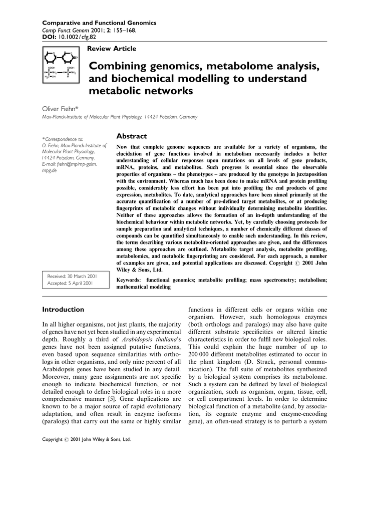 Comparative and Functional Genomics Comp Funct Genom 2001; 2: 155–168. DOI: 10.1002 / cfg.82 Review Article Combining genomics, metabolome analysis, and biochemical modelling to understand metabolic networks Oliver Fiehn* Max-Planck-Institute of Molecular Plant Physiology, 14424 Potsdam, Germany * Correspondence to: O. Fiehn, Max-Planck-Institute of Molecular Plant Physiology, 14424 Potsdam, Germany. E-mail: fiehn@mpimp-golm. mpg.de Received: 30 March 2001 Accepted: 5 April 2001 Abstract Now that complete genome sequences are available for a variety of organisms, the elucidation of gene functions involved in metabolism necessarily includes a better understanding of cellular responses upon mutations on all levels of gene products, mRNA, proteins, and metabolites. Such progress is essential since the observable properties of organisms – the phenotypes – are produced by the genotype in juxtaposition with the environment. Whereas much has been done to make mRNA and protein profiling possible, considerably less effort has been put into profiling the end products of gene expression, metabolites. To date, analytical approaches have been aimed primarily at the accurate quantification of a number of pre-defined target metabolites, or at producing fingerprints of metabolic changes without individually determining metabolite identities. Neither of these approaches allows the formation of an in-depth understanding of the biochemical behaviour within metabolic networks. Yet, by carefully choosing protocols for sample preparation and analytical techniques, a number of chemically different classes of compounds can be quantified simultaneously to enable such understanding. In this review, the terms describing various metabolite-oriented approaches are given, and the differences among these approaches are outlined. Metabolite target analysis, metabolite profiling, metabolomics, and metabolic fingerprinting are considered. For each approach, a number of examples are given, and potential applications are discussed. Copyright # 2001 John Wiley & Sons, Ltd. Keywords: functional genomics; metabolite profiling; mass spectrometry; metabolism; mathematical modeling Introduction In all higher organisms, not just plants, the majority of genes have not yet been studied in any experimental depth. Roughly a third of Arabidopsis thaliana’s genes have not been assigned putative functions, even based upon sequence similarities with orthologs in other organisms, and only nine percent of all Arabidopsis genes have been studied in any detail. Moreover, many gene assignments are not specific enough to indicate biochemical function, or not detailed enough to define biological roles in a more comprehensive manner [5]. Gene duplications are known to be a major source of rapid evolutionary adaptation, and often result in enzyme isoforms (paralogs) that carry out the same or highly similar Copyright # 2001 John Wiley & Sons, Ltd. functions in different cells or organs within one organism. However, such homologous enzymes (both orthologs and paralogs) may also have quite different substrate specificities or altered kinetic characteristics in order to fulfil new biological roles. This could explain the huge number of up to 200 000 different metabolites estimated to occur in the plant kingdom (D. Strack, personal communication). The full suite of metabolites synthesized by a biological system comprises its metabolome. Such a system can be defined by level of biological organization, such as organism, organ, tissue, cell, or cell compartment levels. In order to determine biological function of a metabolite (and, by association, its cognate enzyme and enzyme-encoding gene), an often-used strategy is to perturb a system 156 by systematically introducing genetic alterations and looking for the effect of the perturbation. This can be done by mutating a gene of interest and describing phenotypic effects of this mutation (reverse genetics), or by first identifying an interesting phenotype and then seeking its genetic cause (forward genetics). In both approaches it is essential to describe the phenotype accurately. Several schemes for precisely linking genes to their functions have been suggested, among them metabolic control analysis [15] and the individual analysis of steady-state levels of metabolites [80] in order to comprehensively describe the net result of cellular regulation on the metabolite level. More common, however, are approaches that study cellular responses at the transcript or the protein level (transcriptomics and proteomics, respectively). Current strategies and limitations for the quantitative analysis of cellular responses at all three gene product levels (mRNA, proteins, and metabolites) have been recently summarized in a short review [24], including thoughts on database requirements and informatic tools. Today, transcriptomic approaches seem to give the best coverage of genome level responses. However, due to limitations in analytical precision and high costs, few transcriptomic studies adequately meet rigid statistical requirements. On the other hand, proteomic approaches based on two-dimensional gel electrophoresis are well established in many biological laboratories [78] and are comparatively inexpensive. However, if the full set of proteins separated by 2D gels are to be identified, highly automated systems are needed for cutting spots, digesting proteins, and analysing peptides using mass spectrometry. Therefore, protein identification strategies regularly focus on the most abundant alterations in comparative experiments, such as newly appearing (or completely disappearing) spots, which might lead to erroneous conclusions, since smaller changes in protein abundances can lead to clear alterations in metabolic pathways. Furthermore, low abundance proteins are regularly overlooked [38] as are hydrophobic proteins, which are difficult to resolve using current 2D systems. Quantification of protein abundances 