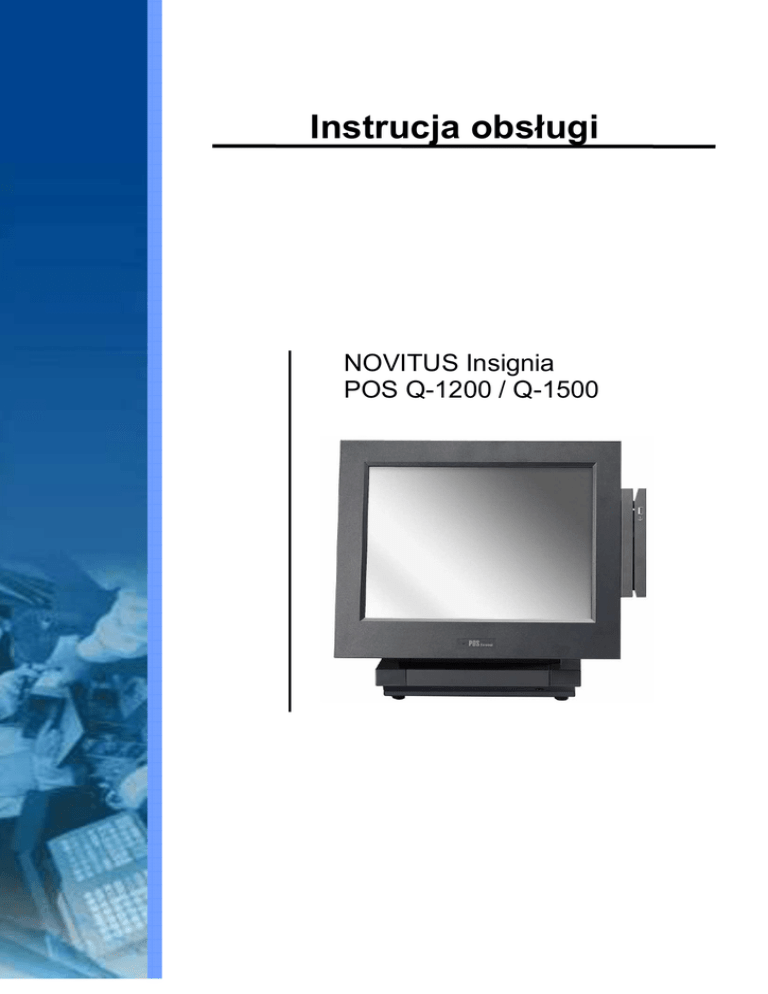 Instrucja obsługi NOVITUS Insignia POS Q-1200 / Q-1500 TRADEMARK Intel®, Pentium® and MMX są zarejestrowanymi znakami towarowymi Intel® Corporation. Microsoft® and Windows® są zarejestrowanymi znakami towarowymi Microsoft Corporation. 2 Bezpieczeństwo Informacje dotyczące bezpieczeństwa uŜytowania 1. W celu wyłącznienia urządzenia naleŜy uŜyć przycisu włącz/wyłącz a następnie wyjąć wtyczę kabla zasilającego ze źródła zasilania. 2. NaleŜy zapoznać się z niniejszą instrucją obsługi oraz zachować ją w bezpiecznym miejscu. 3. NaleŜy zwracać uwagę na wszelie oznaczenia dotyczące bezpiecznego uŜytowania znajdujące się na urządzeniu. 4. Nie naleŜy korzystać z urządzenia w miejscu gdzie będzie ono naraŜone na kontat z cieczami. 5. Urządzenie powinno być zainstalowane na stabilnej podstawie. Upadek urządzenia moŜe spowodować jego uszkodzenie bądź zniszczenie. 6. Urządzenie wyposaŜone jest w odpowiednie otwory wentylacyjne. Podczas instalacji i urzytowania naleŜy zwrócić szczególną uwagę, by otwory wentylacyjne nie zostały zasłonięte. Zasłonięcie otworów wentylacyjnych lub ograniczenie do nich dostępu powietrza moŜe spowodować przegrzanie urządzenia czego skutiem moŜe być jego niewłaściwe funkcjonowanie lub trwałe uszodzenie. Urządzenie nie powinno być instalowane i urzytkowane w pobliŜu źródeł ciepła. 7. Urządzenie moŜe być zasilane wyłącznie z sieci odpowiadającej normom wsazanym na urządzeniu. 8. NaleŜy zwrócić szególną uwagę na połoŜenie przewodu zasilającego. Nie moŜe on znajdować się w miejscu, gdzie nataŜony będzie na wyrwanie z gniazda zasilającego bądź przerwanie. 9. Nie naleŜy umieszczać jaich kolwiek części lub przedmiotów wewnątrz urządzenia. Nie naleŜy spoŜywać napojów w pobliŜu urządzenia. SYMBOL Urządzenie jest zgodne z dyretywą Unii Europejskiej 2004/108/EC dotyczącą ompatybilności eletromagnetycznej oraz dyretywą 2006/95/EC dotyczącą niskiego napięcia. FCC Urządzenie jest zgodne z wymogami rozdziału 15 zasad FCC. UŜytkowanie podlega następującym warunom: (1) Urządzenie nie moŜe powodować Ŝadnego niekorzystnego wpływu. (2) Urządzenie jest podatne na niekorzystny wpływ, nawet mogący powodować jego nieprawidłowe działanie lub uszodzenie. 3 BATERIE LITOWE Istnieje ryzyko wybuchu w przypadu nieprawidłowej instalacji baterii. Bateria moŜe być wymieniona tylo i wyłącznie na identyczną lub o identycznych parametrach jak bateria zainstalowana w urządzeniu przez producenta. Wymianę baterii powinien przeprowadzać wyłącznie przeszolony pracowni serwisu. SYMBOL WEEE (ang. Waste Electrical and Electronic Equipment Directive 2002/96/EC) – dyretywa unijna dotycząca kolecjonowania oraz przetwórstwa urządzeń eletrycznych i eletronicznych oraz ich komponentów. Znak przekreślonego kosza informuje, iŜ po zakończeniu uŜytowania urządzenia nie moŜe ono być wyrzucone razem z innymi odpadami. Urządzenie musi być oddane do instytucji zajmującej się kolekcjonowaniem oraz przetwórstwem tego typu urządzeń. Pamiętaj! Oddanie urządzenia do instytucji zajmującej się kolekcjonowaniem oraz przetwórstwem tego typu urządzeń pomoaga chronić środowiso naturalne. W celu uzysania informacji o najbliŜszym puncie przyjęć zuŜytego sprzętu elektornicznego naleŜy skontaktowac się ze sprzedawcą lub odpowienim wydziałem władz lokalnych. 4 5 Spis treści 1. Zawartość opaowania .............................................................................................................. 7 1.1. Wyposarzenie standardowe ............................................................................................... 7 1.2. Wyposarzenie opcjonalne .................................................................................................. 7 2. Wygląd urządzenia .................................................................................................................... 8 2.1. Widok z przodu .................................................................................................................. 8 2.2. Widok z boku ...................................................................................................................... 8 2.3. Widok z tyłu ....................................................................................................................... 9 2.4. Widok ze spodu ................................................................................................................. 9 2.5. Widok portów I/O .............................................................................................................. 10 3. Instalacja sterowników ........................................................................................................... 11 3.1. Lista sterowniów ............................................................................................................... 11 3.2. Instalacja sterowników chipset'u ...................................................................................... 11 3.3. Instalacja sterowników portów USB .................................................................................13 3.4. Instalacja sterowników Wi-Fi ............................................................................................15 3.5. Instalacja sterowników karty graficznej ............................................................................. 15 3.6. Instalacja sterowników ekranu dotykowego ....................................................................... 17 3.7. Instalacja sterowników audio ........................................................................................... 18 3.8. Instalacja sterowniów sieci LAN10/100Mb ........................................................................20 4. Instalacja urządzeń peryferyjnych .......................................................................................... 21 4.1.