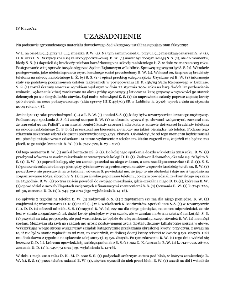 IV K 420/12 UZASADNIENIE Na podstawie zgromadzonego materiału dowodowego Sąd Okręgowy ustalił następujący stan faktyczny: W L. na osiedlu (...), przy ul. (...), mieszka B. W. (1). Na tym samym osiedlu, przy ul. (...) mieszkają oskarżeni S. S. (1), D. K. oraz Ł. S.. Wszyscy znali się ze szkoły podstawowej. B. W. (1) nawet był dobrym kolegą S. S. (1), ale do momentu, kiedy S. S. (1) dopuścił się kradzieży telefonu komórkowego na szkodę małoletniego Ł. Ż. w dniu 20 marca 2003 roku. Postępowanie w tej sprawie toczyło się przed Sądem Rejonowym w Lublinie. Sprawcą tego czynu był S. S. (1). W trakcie postępowania, jako nieletni sprawca czynu karalnego został przesłuchany B. W. (1). Wskazał on, iż sprawcą kradzieży telefonu na szkodę małoletniego Ł. Ż. był S. S. (1) i opisał przebieg całego zajścia. Uzyskane od B. W. (1) informacje stały się podstawą poczynionych ustaleń faktycznych w postępowaniu III K 436/03 Sądu Rejonowego w Lublinie. S. S. (1) został skazany wówczas wyrokiem wydanym w dniu 22 stycznia 2004 roku na karę dwóch lat pozbawienia wolności, wykonanie której zawieszono na okres próby wynoszący 5 lat oraz na karę grzywny w wysokości 50 stawek dziennych po 20 złotych każda stawka. Sąd nadto zobowiązał S. S. (1) do naprawienia szkody poprzez zapłatę kwoty 500 złotych na rzecz pokrzywdzonego (akta sprawy III K 436/03 SR w Lublinie: k. 25-26, wyrok z dnia 22 stycznia 2004 roku k. 98). Jesienią 2007 roku przechodząc ul. (...) w L. B. W. (1) spotkał S. S. (1), który był w towarzystwie nieznanego mężczyzny. Podczas tego spotkania S. S. (1) zaczął szarpać B. W. (1) za ubranie, wyzywał go słowami wulgarnymi, zarzucał mu, że „sprzedał go na Policji”, a on musiał ponieść koszty procesu i adwokata w sprawie dotyczącej kradzieży telefonu na szkodę małoletniego Ż.. S. S. (1) przeszukał mu kieszenie, pytał, czy ma jakieś pieniądze lub telefon. Podczas tego zdarzenia oskarżony zabrał z kieszeni pokrzywdzonego 3 tys. złotych. Oświadczył, że od tego momentu będzie musiał mu płacić pieniądze wraz z odsetkami za tamto wydarzenie z telefonem. Nadto zagroził mu, że jeżeli nie będzie mu płacił, to go zabije (zeznania B. W. (1) k. 714v-720, k. 27 – 27v). Od tego momentu B. W. (1) unikał kontaktu z S. S. (1). Do kolejnego spotkania doszło w kwietniu 2010 roku. B. W. (1) przebywał wówczas w swoim mieszkaniu w towarzystwie kolegi D. D. (1). Zadzwonił domofon, okazało się, że był to S. S. (1). B. W. (1) poprosił kolegę, aby ten został i poczekał na niego w domu, a sam zszedł porozmawiać z S. S. (1). S. S. (1) ponownie zażądał od niego pieniędzy tytułem zwrotu poniesionych kosztów w sprawie kradzieży telefonu. B. W. (1) początkowo nie przystawał na te żądania, wówczas S. powiedział mu, że jego to nie obchodzi i daje mu 2 tygodnie na zorganizowanie 10 tys. złotych. S. S. (1) zapisał sobie jego numer telefonu, po czym powiedział, że skontaktuje się z nim za 2 tygodnie. B. W. (1) po tym zajściu powrócił do swojego mieszkania, gdzie czekał na niego D. D. (1), któremu B. W. (1) opowiedział o swoich kłopotach związanych z finansowymi roszczeniami S. S. (1) (zeznania B. W. (1) k. 714v-720, 26-30, zeznania D. D. (1) k. 749-751 oraz jego wyjaśnienia k. 14-16). Po upływie 2 tygodni na telefon B. W. (1) zadzwonił S. S. (1) z zapytaniem czy ma dla niego pieniądze. B. W. (1) znajdował się wówczas wraz D. D. (1) na ul. (...) w L. w okolicach K. Mariawitów. Spotkali tam S. S. (1) w towarzystwie (...). D. D. (1) odszedł od nich. S. S. (1) zapytał B. W. (1), czy ma dla niego pieniądze, na co ten odpowiedział, że nie jest w stanie zorganizować tak dużej kwoty pieniędzy w tym czasie, ale w zamian może mu załatwić narkotyki. S. S. (1) przystał na taką propozycję, ale pod warunkiem, że będzie do 2 kg amfetaminy, czego również B. W. (1) nie mógł spełnić. Mężczyźni okrążyli go i zaczęli mu grozić pozbawieniem życia. Został uderzony kilkakrotnie pięścią w głowę. Wykrzykując w jego stronę wulgaryzmy zażądali kategorycznie przekazania określonej kwoty, przy czym, z uwagi na to, iż nie był w stanie zapłacić im od razu, to stwierdzili, że doliczą do tej kwoty odsetki w kwocie 5 tys. złotych. Dali mu dodatkowo 2 tygodnie na spłacenie całej sumy tj. 15 tys. złotych. Po tym zdarzeniu B. W. (1) tego dnia widział się jeszcze z D. D. (1), któremu opowiedział przebieg spotkania z S. S. (1) oraz D. K. (zeznania B. W. (1) k. 714v-720, 26-30, zeznania D. D. (1) k. 749-751 oraz jego wyjaśnienia k. 14-16). W dniu 1 maja 2010 roku D. K., M. P. oraz S. S. (1) podjechali srebrnym autem pod blok, w którym zamieszkuje B. W. (1). S. S. (1) przez telefon nakazał B. W. (1), aby ten wyszedł do nich przed blok. B. W. (1) zszedł na dół i wsiadł do samochodu. Udali się na ul. (...). D. K. dał do przeczytania B. W. (1) protokół jego przesłuchania w postępowaniu III K 436/03, na co ten odpowiedział, że nie chce tego czytać, gdyż wie, co w nim się znajduje. B. W. (1) wręczył S. S. (1) 10 tys. złotych. W zamian za przekazanie tych pieniędzy miał otrzymać wspomniany protokół. Jednakże mężczyźni, z uwagi na to, że kwota ta była o 5 tys. za niska, stwierdzili, że oddadzą mu ten dokument, ale dopiero gdy dopłaci brakujące 5 tys. zł (zeznania B. W. (1) k. 714v-720, 26-30, wyjaśnienia B. W. (1) 5-13). W dniu 10 maja 2010 roku B. W. (1) został zatrzymany przez Policję. Zastosowano wobec niego środek zapobiegawczy w postaci tymczasowego aresztowania. W areszcie przebywał do dnia 10 lutego 2011 roku. Po opuszczeniu aresztu nikt z oskarżonych nie kontaktował się z pokrzywdzonym, z uwagi na fakt, iż nie mieli wiedzy o tym, że przebywa on już na wolności. W wakacje 2011 r. miała miejsce sytuacja, gdy Ł. S. wraz z D. K. przejeżdżając samochodem zauważyli B. W. (1) i zwolnili, ale wówczas nic się nie wydar
