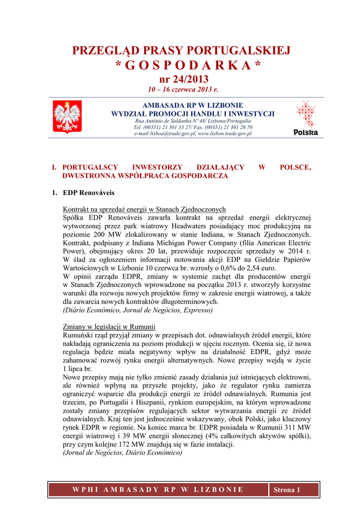 PRZEGLĄD PRASY PORTUGALSKIEJ *GOSPODARKA* nr 24/2013 10 – 16 czerwca 2013 r. AMBASADA RP W LIZBONIE WYDZIAŁ PROMOCJI HANDLU I INWESTYCJI Rua António de Saldanha Nº 48/ Lizbona/Portugalia Tel. (00351) 21 301 33 27/ Fax. (00351) 21 301 28 70 e-mail:[email protected], www.lisbon.trade.gov.pl I. PORTUGALSCY INWESTORZY DZIAŁAJĄCY DWUSTRONNA WSPÓŁPRACA GOSPODARCZA W POLSCE, 1. EDP Renováveis Kontrakt na sprzedaż energii w Stanach Zjednoczonych Spółka EDP Renováveis zawarła kontrakt na sprzedaż energii elektrycznej wytworzonej przez park wiatrowy Headwaters posiadający moc produkcyjną na poziomie 200 MW zlokalizowany w stanie Indiana, w Stanach Zjednoczonych. Kontrakt, podpisany z Indiana Michigan Power Company (filia American Electric Power), obejmujący okres 20 lat, przewiduje rozpoczęcie sprzedaży w 2014 r. W ślad za ogłoszeniem informacji notowania akcji EDP na Giełdzie Papierów Wartościowych w Lizbonie 10 czerwca br. wzrosły o 0,6% do 2,54 euro. W opinii zarządu EDPR, zmiany w systemie zachęt dla producentów energii w Stanach Zjednoczonych wprowadzone na początku 2013 r. stworzyły korzystne warunki dla rozwoju nowych projektów firmy w zakresie energii wiatrowej, a także dla zawarcia nowych kontraktów długoterminowych. (Diário Económico, Jornal de Negócios, Expresso) Zmiany w legislacji w Rumunii Rumuński rząd przyjął zmiany w przepisach dot. odnawialnych źródeł energii, które nakładają ograniczenia na poziom produkcji w ujęciu rocznym. Ocenia się, iż nowa regulacja będzie miała negatywny wpływ na działalność EDPR, gdyż może zahamować rozwój rynku energii alternatywnych. Nowe przepisy wejdą w życie 1 lipca br. Nowe przepisy mają nie tylko zmienić zasady działania już istniejących elektrowni, ale również wpłyną na przyszłe projekty, jako że regulator rynku zamierza ograniczyć wsparcie dla produkcji energii ze źródeł odnawialnych. Rumunia jest trzecim, po Portugalii i Hiszpanii, rynkiem europejskim, na którym wprowadzone zostały zmiany przepisów regulujących sektor wytwarzania energii ze źródeł odnawialnych. Kraj ten jest jednocześnie wskazywany, obok Polski, jako kluczowy rynek EDPR w regionie. Na koniec marca br. EDPR posiadała w Rumunii 311 MW energii wiatrowej i 39 MW energii słonecznej (4% całkowitych aktywów spółki), przy czym kolejne 172 MW znajdują się w fazie instalacji. (Jornal de Negócios, Diário Económico) WPHI AMBASADY RP W LIZBONIE Strona 1 PRZEGLĄD PRASY PORTUGALSKIEJ “GOSPODARKA” - nr 24/2013 2. Mota-Engil Mota-Engil zrealizuje w Afryce nowe projekty warte 500 mln euro. Grupa wygrała przetargi na wykonanie robót budowlanych w Mozambiku, Malawi i Angoli, rozpocznie również działalność na dwóch nowych rynkach kontynentu: w Zambii i Ghanie. Projekty w Zambii, o łącznej wartości 118,6 mln euro, zostaną zrealizowane w ramach europejskiego programu wsparcia rozwoju kraju. (Jornal de Negócios, Oje) 3. BES BES zwiększył do 49% (wzrost o 5%) udziały w mozambickim banku Moza Banco po odkupieniu 18,9% udziałów od spółki Geocapital. W dniu opublikowania informacji (14 czerwca br.) notowania akcji banku na lizbońskiej Giełdzie Papierów Wartościowych wzrosły o 1,36% do 0,744 euro. (Público, Diário Económico) II. INNE INWESTYCJE PORTUGALSKICH I KONTRAKTY ZAGRANICZNE FIRM 1. Prywatyzacja ANA – Aeroportos de Portugal Komisja Europejska zatwierdziła przejęcie przedsiębiorstwa ANA (zarządzającej lotniskami na terenie Portugalii kontynentalnej oraz w Regionach Autonomicznych Azorów i Madery) przez francuską firmę Vinci, w ramach przyjętego procesu prywatyzacji. Akcje ANA zostaną przekazane na rzecz Vinci, którego oferta opiewała na kwotę 3,08 mld euro, z czego 1,2 mld euro zostanie przeznaczone na wykup koncesji na okres 50 lat, kolejne 1,2 mld euro na zakup akcji ANA, podczas gdy ok. 700 mln euro na spłacenie części długów przedsiębiorstwa. (Jornal de Negócios, Público) III. POLSKA W MEDIACH PORTUGALSKICH Artykuły nt. Polski w magazynie „Desafios” Stowarzyszenia Przedsiębiorców Regionu Leiria (NERLEI) W związku z misją przedsiębiorców do Polski organizowaną w dniach 16-21 czerwca przez Stowarzyszenie Przedsiębiorców Regionu Leiria (NERLEI), w magazynie wydawanym przez Stowarzyszenie, w ramach cyklu „Na podbój...” („À conquista de…”) ukazały się trzy artykuły dotyczące Polski. Jeden z artykułów został opracowany przez Wydział Promocji Handlu i Inwestycji Ambasady RP w Lizbonie i prezentuje w sposób kompleksowy zalety rynku polskiego pod kątem realizacji inwestycji oraz prowadzenia działalności gospodarczej, a także wskazuje na istniejący w kraju system zachęt dla inwestycji zagranicznych. Na łamach magazynu znalazły się również: tekst autorstwa Nuno Lima Leite, dyrektora biura Portugalskiej Agencji Inwestycji i Handlu Zagranicznego (AICEP) w Warszawie, w którym WPHI AMBASADY RP W LIZBONIE Strona 2 PRZEGLĄD PRASY PORTUGALSKIEJ “GOSPODARKA” - nr 24/2013 scharakteryzowane są kluczowe wskaźniki makroekonomiczne polskiej gospodarki, omówione polsko-portugalskie relacje bilateralne, a także zaprezentowane wskazówki co do sposobu wejścia na polski rynek; artykuł prezentujący spółkę konsultingową Índice, która od 2007 r. jest obecna w Polsce za pośrednictwem spółki prawa polskiego Indeks Consulting Sp. z o.o. (Revista Desafios) +++ WPHI AMBASADY RP W LIZBONIE Strona 3