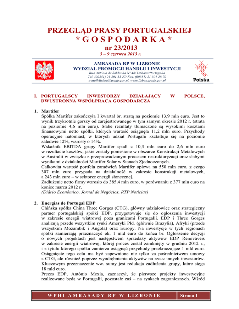PRZEGLĄD PRASY PORTUGALSKIEJ *GOSPODARKA* nr 23/2013 3 – 9 czerwca 2013 r. AMBASADA RP W LIZBONIE WYDZIAŁ PROMOCJI HANDLU I INWESTYCJI Rua António de Saldanha Nº 48/ Lizbona/Portugalia Tel. (00351) 21 301 33 27/ Fax. (00351) 21 301 28 70 e-mail:[email protected], www.lisbon.trade.gov.pl I. PORTUGALSCY INWESTORZY DZIAŁAJĄCY DWUSTRONNA WSPÓŁPRACA GOSPODARCZA W POLSCE, 1. Martifer Spółka Martifer zakończyła I kwartał br. stratą na poziomie 13,9 mln euro. Jest to wynik trzykrotnie gorszy od zarejestrowanego w tym samym okresie 2012 r. (strata na poziomie 4,6 mln euro). Słabe rezultaty tłumaczone są wysokimi kosztami finansowymi netto spółki, których wartość osiągnęła 11,2 mln euro. Przychody operacyjne natomiast, w których udział Portugalii kształtuje się na poziomie zaledwie 12%, wzrosły o 14%. Wskaźnik EBITDA grupy Martifer spadł z 10,3 mln euro do 2,6 mln euro w rezultacie kosztów, jakie zostały poniesione w obszarze Konstrukcji Metalowych w Australii w związku z przeprowadzanym procesem restrukturyzacji oraz słabymi wynikami z działalności Martifer Solar w Stanach Zjednoczonych. Całkowita wartość portfela zamówień Martifer opiewa na 550 mln euro, z czego 307 mln euro przypada na działalność w zakresie konstrukcji metalowych, a 243 mln euro – w sektorze energii słonecznej. Zadłużenie netto firmy wzrosło do 385,4 mln euro, w porównaniu z 377 mln euro na koniec marca 2012 r. (Diário Económico, Jornal de Negócios, RTP Notícias) 2. Energias de Portugal EDP Chińska spółka China Three Gorges (CTG), główny udziałowiec oraz strategiczny partner portugalskiej spółki EDP, przygotowuje się do ogłoszenia inwestycji w zakresie energii wiatrowej poza granicami Portugalii. EDP i Three Gorges analizują przede wszystkim rynki Ameryki Płd. (głównie Brazylia), Afryki (przede wszystkim Mozambik i Angola) oraz Europy. Na inwestycje w tych regionach spółki zamierzają przeznaczyć ok. 1 mld euro do końca br. Ogłoszenie decyzji o nowych projektach jest następstwem sprzedaży aktywów EDP Renováveis w zakresie energii wiatrowej, której proces został zamknięty w grudniu 2012 r., i z tytułu którego spółka zamierza osiągnąć przychody przekraczające 1 mld euro. Osiągnięcie tego celu ma być zapewnione nie tylko za pośrednictwem umowy z CTG, ale również poprzez wyodrębnienie aktywów na rzecz innych inwestorów. Kluczowym przeznaczenie ww. sumy jest redukcja zadłużenia grupy, które sięga 18 mld euro. Prezes EDP, António Mexia, zaznaczył, że pierwsze projekty inwestycyjne realizowane będą w Portugalii, pozostałe zaś – na rynkach zagranicznych. Wśród WPHI AMBASADY RP W LIZBONIE Strona 1 PRZEGLĄD PRASY PORTUGALSKIEJ “GOSPODARKA” - nr 23/2013 rynków międzynarodowych, co do których EDP miałoby plany inwestycyjne po 2015 r. wymieniane są: Turcja, Peru, RPA, Meksyk, Chile, Maroko, Ukraina i Australia. Mexia zapowiedział też udział w przetargach na energię słoneczną w Kalifornii. (Diário Económico, Diário de Notícias, Jornal de Negócios) EDP Renováveis EDP Renováveis Brasil weźmie udział w przetargu na energię realizowanym przez Narodową Agencję Energii Elektrycznej, regulujący brazylijski sektor energetyczny. Licytacje, dotyczące 2 tys. MW, rozpoczną się w lipcu br. i będą, w pierwszej kolejności, dotyczyć energii wiatrowej. Do 2020 r. EDP Brasil planuje pozyskiwać około 100 tys. klientów rocznie. Na koniec 2012 r. liczba klientów spółki wynosiła 55 tys. osób w São Paulo i 45 tys. w Espírito Santo. (Diário Económico, Oje) 3. Mota-Engil Mota-Engil zamierza ubiegać się o 9 koncesji drogowych w ramach koncepcji partnerstwa publiczno-prywatnego w Kolumbii. Grupa wchodzi w skład konsorcjum, na czele którego stoi kolumbijska spółka Odinsa – największy koncesjonariusz na rynku kolumbijskim, a jednocześnie najważniejsza w tym kraju grupa w obszarze infrastruktury. Wartość koncesji szacowana jest na 6,9 mld euro. Rynki Ameryki Łac. przede wszystkim Kolumbia, Brazylia i Meksyk są kluczowe dla działalności Mota-Engil. Obroty spółki w tym regionie wzrosły w I kwartale br. o 56% w porównaniu z analogicznym okresem roku ubiegłego i stanowią już 18% wartości wszystkich transakcji grupy. W 2015 r. współczynnik ten ma wzrosnąć do 27%. Jeśli chodzi o rynek kolumbijski, w ciągu najbliższych 18 miesięcy MotaEngil zamierza prowadzić działalność w trzech sektorach: inżynieria lądowa, infrastruktura portowa i koncesje drogowe. W Europie, Mota-Engil chce utrzymać pozycję istotnego gracza w sektorze gospodarki odpadami i gospodarki wodnej, zwłaszcza w Polsce. Działalność w Czechach, pomimo niewielkiej skali, rozwija się w sposób interesujący. Jednocześnie, podjęta została decyzja o zakończeniu działalności na Węgrzech podobnie jak to miało miejsce w Rumunii w 2009 r. (Diário Económico) II. POLSKA W MEDIACH PORTUGALSKICH 1. TAP Gérman Efromovich, posiadający brazylijsko-kolumbijsko-polskie obywatelstwo właściciel kolumbijskich linii lotniczych Avianca, jako jedyny rozważa udział we wznowionym procesie prywatyzacji portugalskich linii lotniczych TAP, który, według prezesa przedsiębiorstwa, ma zostać uruchomiony we wrześniu. WPHI AMBASADY RP W LIZBONIE Strona 2 PRZEGLĄD PRASY PORTUGALSKIEJ “GOSPODARKA” - nr 23/2013 (Diário Económico) +++ WPHI AMBASADY RP W LIZBONIE Strona 3