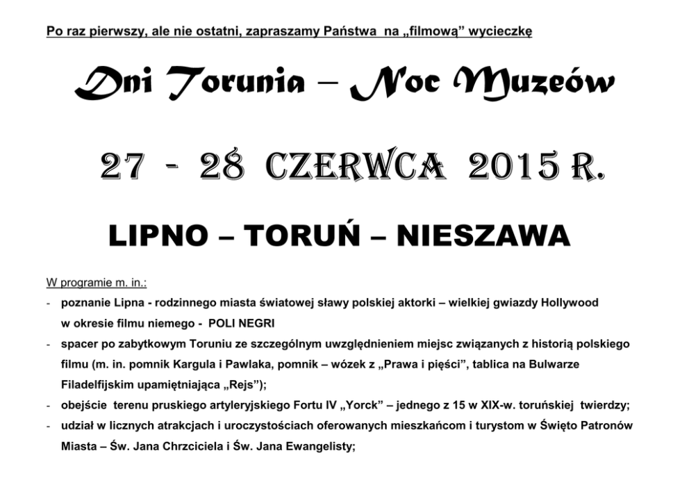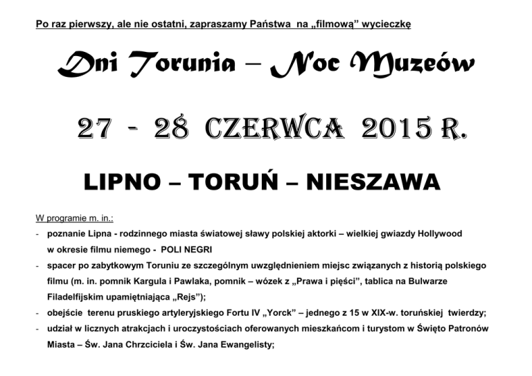 Po raz pierwszy, ale nie ostatni, zapraszamy Państwa na „filmową” wycieczkę Dni Torunia – Noc Muzeów 27 - 28 CZERWCA 2015 R. LIPNO – TORUŃ – NIESZAWA W programie m. in.: - poznanie Lipna - rodzinnego miasta światowej sławy polskiej aktorki – wielkiej gwiazdy Hollywood w okresie filmu niemego - POLI NEGRI - spacer po zabytkowym Toruniu ze szczególnym uwzględnieniem miejsc związanych z historią polskiego filmu (m. in. pomnik Kargula i Pawlaka, pomnik – wózek z „Prawa i pięści”, tablica na Bulwarze Filadelfijskim upamiętniająca „Rejs”); - obejście terenu pruskiego artyleryjskiego Fortu IV „Yorck” – jednego z 15 w XIX-w. toruńskiej twierdzy; - udział w licznych atrakcjach i uroczystościach oferowanych mieszkańcom i turystom w Święto Patronów Miasta – Św. Jana Chrzciciela i Św. Jana Ewangelisty; - nocne zwiedzanie najciekawszych zbiorów muzealnych zlokalizowanych w zabytkowych budynkach na Starówce – pięć oddziałów Muzeum Okręgowego; - bajecznie kolorowy pokaz połączonych kaskad wodnych i muzyki - multimedialna fontanna; - możliwość zjedzenia najlepszych lodów w Polsce – u Lenkiewicza na toruńskim rynku; - poznanie atrakcji turystycznych Nieszawy – Muzeum biograficzne Stanisława Noakowskiego i bogato wyposażony gotycki kościół pw. Św. Jadwigi; W ramach Nocy Muzeów polecamy: - tylko raz w roku istnieje okazja obejrzenia nocnej panoramy śródmieścia z wysokości 40 m. wieży ratuszowej; - historyczne zbiory zgromadzone we wnętrzach gotyckiego ratusza (m. in. galeria malarstwa polskiego i sztuki gotyckiej, bezcenne kolekcje polskiego złotnictwa z Kujaw – skarb ze Skrwilna i skarb z Nieszawy, średniowieczna w pełni wyposażona Sala Sądowa, Sala Królewska, Sala Mieszczańska, rzemiosło artystyczne Torunia od XIII-ego do XVIII-ego wieku); - Dom Urodzenia Mikołaja Kopernika z ekspozycją prezentującą jego życie, pracownią uczonego, makietą miasta z ok. 1500 roku (seans „Światło i dźwięk”) i połączoną z pokazami wypieków wystawą „Świat toruńskiego piernika”); - Muzeum Podróżników ze stałą wystawą „Tony Halik – urodzony dla przygody” (nagrodzoną w konkursie „Polska pięknieje”); - przebogate zbiory „Świat Orientu” umieszczone w najpiękniejszym domu mieszczańskim – „Kamienicy pod Gwiazdą”; - kolekcja archeologicznych wykopalisk - wystawa „Odkrywanie przeszłości” w Domu Eskenów. Nocleg w trzygwiazdkowym hotelu „Gromada” mieszczącym się w zabytkowych kamieniczkach na Starym Mieście tuż przy toruńskiej katedrze (pokoje 2-osobowe z pełnym węzłem sanitarnym). Wyjazd w sobotę 20 czerwca o godz. 8,00 z Pl. Bankowego w Warszawie. Powrót w niedzielę ok. godz. 21-ej. Koszt : 250.- zł. – (emeryci, dzieci, młodzież szkolna i studenci: 240.- zł.). Informacje i zapisy do wyczerpania miejsc (nie później niż do poniedz. 8 czerwca) w BP „Imperial” ul. Ogrodowa 67 (tel. 22 654-89-89) (od poniedziałku do piątku w godzinach 11 – 17) i u kierownika wycieczki - Marka Piaseckiego (tel. 603 404 213).