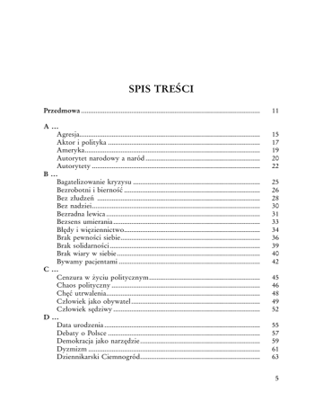SPIS TREŚCI Przedmowa..................................................................................................... 11 A … Agresja...................................................................................................... 15 Aktor i polityka...................................................................................... 17 Ameryka................................................................................................... 19 Autorytet narodowy a naród................................................................. 20 Autorytety............................................................................................... 22 B … Bagatelizowanie kryzysu........................................................................ 25 Bezrobotni i bierność............................................................................. 26 Bez złudzeń ............................................................................................ 28 Bez nadziei............................................................................................... 30 Bezradna lewica....................................................................................... 31 Bezsens umierania................................................................................... 33 Błędy i więziennictwo............................................................................. 34 Brak pewności siebie............................................................................... 36 Brak solidarności..................................................................................... 39 Brak wiary w siebie................................................................................. 40 Bywamy pacjentami................................................................................ 42 C … Cenzura w życiu politycznym............................................................... 45 Chaos polityczny.................................................................................... 46 Chęć utrwalenia....................................................................................... 48 Człowiek jako obywatel......................................................................... 49 Człowiek sędziwy................................................................................... 52 D … Data urodzenia........................................................................................ 55 Debaty o Polsce...................................................................................... 57 Demokracja jako narzędzie.................................................................... 59 Dyzmizm................................................................................................. 61 Dziennikarski Ciemnogród.................................................................... 63 Dzień 1 maja............................................................................................ Dostosowywanie naszego prawa........................................................... Dość ośmieszania PRL!.......................................................................... E … Elektorat bez partii................................................................................. Emigracja.................................................................................................. Etatowi politycy i sztuka....................................................................... Etyka a polityka...................................................................................... Ewolucjonizm i demokracja................................................................... F … Filozofia uśmiechu.................................................................................. Forum społeczne..................................................................................... G … Gdzie byli?............................................................................................... Głośniej.................................................................................................... Granice człowieczeństwa........................................................................ H … Humanizm............................................................................................... I … Idee socjalizmu ...................................................................................... Idee i charaktery..................................................................................... Intuicja..................................................................................................... J … Jedna tylko interpretacja........................................................................ K … Karanie i sztuka....................................................................................... Karierowicze............................................................................................ Kilka nowych absurdów......................................................................... Kilka paradoksów.................................................................................... Kościół – Państwo................................................................................... Kres istnienia........................................................................................... Kryzys i komizm.................................................................................... L … Lepsi i gorsi............................................................................................. Lewica bez przymiotników.................................................................... Lewica w XXI wieku.............................................................................. Lewicowość.............................................................................................. Lęk przed socjalizmem........................................................................... M … Mącenie umysłów......