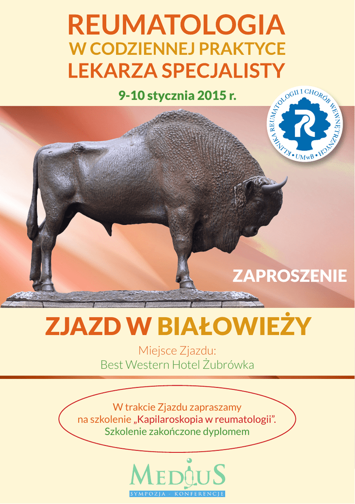 9-10 stycznia 2015 r. ZAPROSZENIE ZJAZD W BIAŁOWIEŻY Miejsce Zjazdu: Best Western Hotel Żubrówka W trakcie Zjazdu zapraszamy na szkolenie „Kapilaroskopia w reumatologii”. Szkolenie zakończone dyplomem Szanowni Państwo, Drogie Koleżanki i Koledzy, Celem Zjazdu jest pomoc we wprowadzeniu najnowszych zasad leczenia oraz postępowania diagnostycznego w codziennej praktyce specjalisty reumatologa. Wprowadzenie nowych leków oraz zasad diagnostyki poszczególnych chorób nie zawsze odbywa się w sposób jasny i w pełni zrozumiały. Zagadnienie to nabiera szczególnego znaczenia w okresie intensywnego rozwoju - jak to ma miejsce w ostatnich latach w reumatologii. W związku z tym powstaje pytanie jak radzić sobie z nowościami w codziennej praktyce lekarskiej. Duże zainteresowanie naszymi dotychczasowymi spotkaniami w Białowieży (2013 r. i 2014 r.) dowodzi, że zasadną jest rozmowa nad wprowadzaniem nowych zasad diagnostyki poszczególnych chorób oraz leków do codziennej praktyki specjalisty reumatologa. Podobnie jak podczas ostatniego zjazdu znani wykładowcy szczegółowo omówią najnowsze zasady diagnostyki i leczenia wybranych chorób reumatycznych. Również podzielą się swoimi obserwacjami i sugestiami oraz odpowiedzą na zadawane pytania i ustosunkują się do Państwa komentarzy. W trakcie Zjazdu przewidujemy również szkolenie z zakresu Kapilaroskopii Praktycznej zakończone dyplomem uczestnictwa. Prof. dr hab. med. Stanisław Sierakowski Przewodniczący Komitetu Organizacyjnego www.bialowieza2015.pl PROGRAM ZJAZDU PIĄTEK 9 stycznia 2015r. 13:00-16:30 Kapilaroskopia w reumatologii - wykłady i warsztaty zakończone dyplomem uczestnictwa 16:30-17:00 Przerwa kawowa i poczęstunek 17:00 Uroczyste Otwarcie Zjazdu 17:30-18:00 Zapalenie naczyń w chorobach reumatycznych 18:00-18:30 Aktualne zasady leczenia i postępowania terapeutycznego w reumatoidalnym zapaleniu stawów 19:30 Uroczysta kolacja SOBOTA 10 stycznia 2015r. 9:00-9:30 Spondyloartropatie nowe podziały 9:30-10:00 Dna 10:00-10:30 Osteoporoza co nowego? 10:30-11:00 Osteoporoza posteroidowa 11:00-11:20 Reumatyzm tkanek miękkich 11:20-12:00 Przerwa kawowa 12:00-12:30 Zapalenie wielomięśniowe /skórno-mięśniowe. 12:30-13:00 Nowe podejście do badania histopatologicznego, rozpoznawanie wielomięśniowego zapalenia 13:00-14:00 Sesja pediatryczna 14:00-15:30 Przerwa obiadowa 15:30-16:00 16:00-16:30 16:30-17:00 17:00-17:30 Toczeń rumieniowaty układowy Mieszana choroba tkanki łącznej Łuszczycowe Zapalenie Stawów Rehabilitacja w chorobach reumatycznych 17:30 19:00 Zakończenie Zjazdu Kolacja Serdecznie zapraszamy do udziału w Zjeździe. Rejestracja uczestnictwa: www.bialowieza2015.pl/rejestracja Organizator zapewnia udział w sesjach naukowych wstęp na stoiska sponsorów materiały zjazdowe certyfikat uczestnictwa poczęstunek w trakcie przerw kawowych i lunchów udział w uroczystej kolacji Opłata za uczestnictwo w Zjeździe: 395 zł* - wpłata do 5 grudnia 2014 r. 450 zł* - wpłata po 5 grudnia 2014 r. (w tym wpłaty bezpośrednio w recepcji Zjazdu) 350 zł* - opłata za osobę towarzyszącą 200 zł* - opłata za udział w kuligu (sobota) * podane ceny brutto Opłaty za uczestnictwo prosimy kierować na konto bankowe o numerze: 36 1240 2887 1111 0010 4733 2851 w banku PEKAO SA należące do MEDIUS Sp. z o.o. W tytule przelewu prosimy podać: imię i nazwisko Uczestnika, miejsce zamieszkania oraz dopisek „Białowieża 2015” Noclegi Koszty noclegów Uczestnicy pokrywają we własnym zakresie. Przygotowaliśmy dla Państwa ofertę noclegów w Hotelu Żubrówka. Szczegóły znajdą Państwo na stronie: www.bialowieza2015.pl Biuro Organizacyjne: Medius Sp. z o.o. ul. Powstańców Śląskich 26A, 01-381 Warszawa tel: (22) 642 09 40, e-mail: [email protected] www.medius.com.pl
