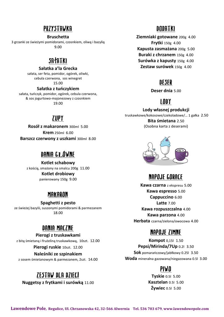 Przystawka Dodatki Bruschetta Ziemniaki gotowane 200g 4.00 Frytki 150g 4.00 Kapusta zasmażana 200g 5.00 Buraki z chrzanem 150g 4.00 Surówka z kapusty 150g 4.00 Zestaw surówek 150g 4.00 3 grzanki ze świeżymi pomidorami, czosnkiem, oliwą i bazylią 9.00 Sałatki Sałatka a’la Grecka sałata, ser feta, pomidor, ogórek, oliwki, cebula czerwona, sos winegret DESER 15.00 Sałatka z tuńczykiem Deser dnia 5.00 sałata, tuńczyk, pomidor, ogórek, cebula czerwona, & sos jogurtowo-‐majonezowy z czosnkiem LODY 19.00 Lody własnej produkcji truskawkowe/kokosowe/czekoladowe/… 1 gałka 2.50 Bita śmietana 2.50 ZUPY Rosół z makaronem 300ml 5.00 Krem 250ml 6.00 Barszcz czerwony z uszkami 300ml 8.00 (Osobna karta z deserami) DANIA GŁÓWNE Kotlet schabowy z kością, smażony na smalcu 200g 11.00 Kotlet drobiowy panierowany 150g 9.00 MAKARON Spaghetti z pesto ze świeżej bazylii, suszonymi pomidorami & parmezanem 18.00 DANIA MACZNE Pierogi z truskawkami z bitą śmietaną i frużeliną truskawkową, 10szt. 12.00 Pierogi ruskie 10szt. 12.00 Naleśniki ze szpinakiem z sosem śmietanowym & parmezanem, 2szt. 14.00 Zestaw dla dziec I Nuggetsy z frytkami i surówką 11.00 NAPOJE GORACE Kawa czarna z ekspresu 5.00 Kawa espresso 5.00 Cappuccino 6.00 Latte 7.00 Kawa rozpuszczalna 4.00 Kawa parzona 4.00 Herbata czarna/zielona/owocowa 4.00 NAPOJE ZIMNE Kompot 0,15l 1.50 Pepsi/Mirinda/7Up 0.2l 3.50 Sok pomarańczowy/jabłkowy 0.25l 3.50 Woda mineralna gazowana/niegazowana 0.5l 3.00 PIWO Tyskie 0.5l 5.00 Kasztelan 0.5l 5.00 Żywiec 0.5l 5.00 Lawendowe Pole, Regulice, Ul. Chrzanowska 42, 32-‐566 Alwernia Tel. 536 703 679, www.lawendowepole.com