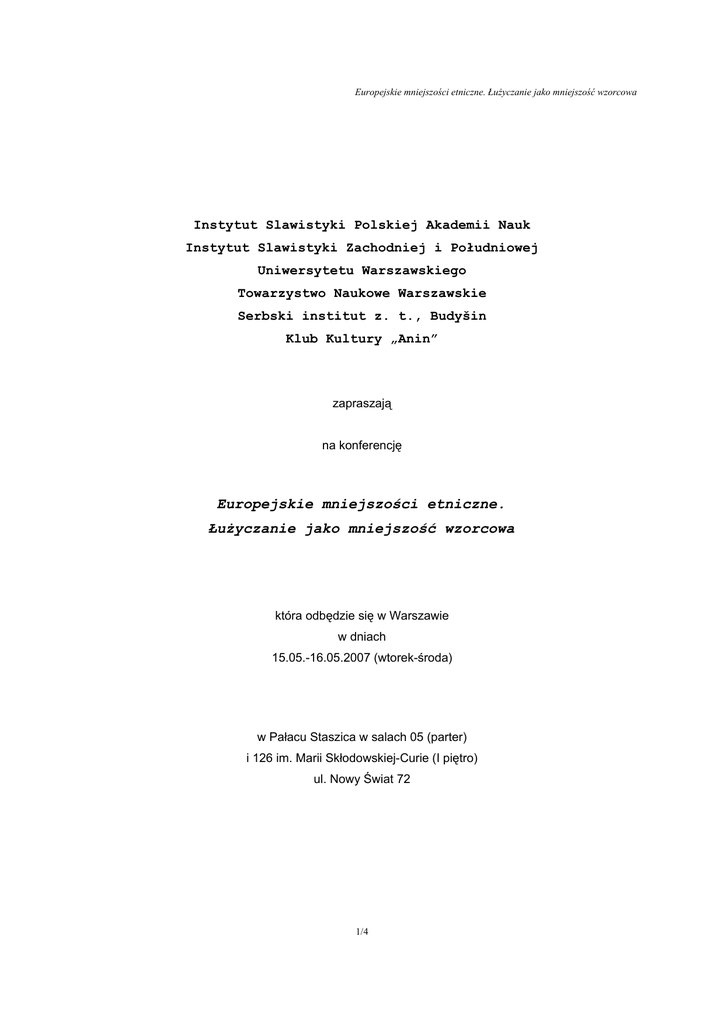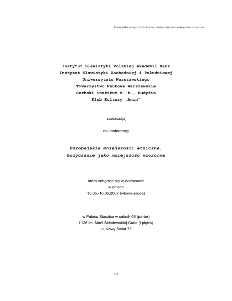 Europejskie mniejszości etniczne. Łużyczanie jako mniejszość wzorcowa Instytut Slawistyki Polskiej Akademii Nauk Instytut Slawistyki Zachodniej i Południowej Uniwersytetu Warszawskiego Towarzystwo Naukowe Warszawskie Serbski institut z. t., Budyšin Klub Kultury „Anin” zapraszają na konferencję Europejskie mniejszości etniczne. Łużyczanie jako mniejszość wzorcowa która odbędzie się w Warszawie w dniach 15.05.-16.05.2007 (wtorek-środa) w Pałacu Staszica w salach 05 (parter) i 126 im. Marii Skłodowskiej-Curie (I piętro) ul. Nowy Świat 72 1/4 Europejskie mniejszości etniczne. Łużyczanie jako mniejszość wzorcowa Program 15.05., wtorek. Sesja plenarna, sala 126 900 Powitanie 910 Tomasz Wicherkiewicz (Poznań), Mikroenklawy językowe w Europie 930 Hanna Taborska (Warszawa), Problem mniejszości etnicznych w świetle ankiety Georga Wenkera przeprowadzonej na Kaszubach w drugiej połowie XIX wieku 950 Елка Чернокожева (Budziszyn), Гибридология: тезисы и пути исследования современной культуры 1010 Natalija Ananjewa (Moskwa), Charakterystyka człowieka w polskich gwarach kresowych 1030 Dyskusja 1050 Przerwa 15.05., wtorek Sekcja A, sala 126 1120 Gerald Stone (Oxford), Pierwszy elementarz łużycki (1671) 1140 Doris Teichmann (Berlin), Rękopiśmienne śpiewniki północno-łużyckie 1200 Małgorzata Milewska (Gdańsk), Deminutiva w "De originibus linguae Sorabicae" Abrahama Frencla 1220 Dyskusja 1235 Przerwa 1300 Obiad 1500 Jadwiga Zieniukowa (Warszawa), Z badań nad językiem i funkcją kulturową dawnej prasy łużyckiej 1520 Bożena Itoya (Warszawa), "Rěčny kućik" jako model audycji popularyzującej normę skodyfikowaną języka mniejszości etnicznej 1540 Lechosław Jocz (Szczecin), Problem normy w systemie spółgłoskowym dialektu slepiańskiego 1600 Dyskusja 1615 Przerwa 1640 Anna Jakubowska (Warszawa), Wielki pan, velký pán, wulki knjez, czyli jak się mówi o pysze i pyszałkach w języku polskim, czeskim i górnołużyckim 1700 Jan Měškank (Lipsk), Wpływ fonetyki języka niemieckiego na wymowę Dolnołużyczan 1720 Franciska Šulcojc (Lipsk) Aktualne problemy pśi pśepytowanju dolnoserbskeje powědaneje rěcy 1740 Dyskusja 1800 Kolacja 2/4 Europejskie mniejszości etniczne. Łużyczanie jako mniejszość wzorcowa 15.05., wtorek Sekcja B, sala 05 1120 Adela Kulik-Kalinowska (Słupsk), Polskie kresy zachodnie wobec przejawów mitu kulturowego 1140 Kinga Kijo (Praga, Warszawa), Ludowość jako podstawowe źródło inspiracji w kulturze mniejszości narodowych na przykładzie twórczości M. Nowaka-Njechorńskiego 1200 Małgorzata Mieczkowska (Szczecin), Polityczne aspiracje Łużyczan 1220 Dyskusja 1235 Przerwa 1300 Obiad 1500 Rafał Leszczyński (Łódź), Listek lauru do wieńca chwały Serbów Łużyckich 1520 Magdalena Ruszczyk (Lipsk, Warszawa), Młodzi Serbołużyczanie w poszukiwaniu własnej tożsamości (konfrontacja świadectwa literackiego i badania empirycznego) 1540 Ewa Teodorowicz-Hellman (Sztokholm), Problematyka tożsamościowa w twórczości Jurija Brězana 1600 Dyskusja 1615 Przerwa 1640 Ewa Szperlik (Poznań), Łużycka powieść socrealistyczna - próba określenia modelu 1700 Marka Maćijowa (Budziszyn), Serbske ćišćane słowo w Ludowym nakładnistwje Domowina. K prašenjam mjenšinoweho nakładnistwa w Němskej 1720 Měto Pernak (Berlin), Maśica Serbska něga a źinsa 1740 Dyskusja 1800 Kolacja ******************************************************************************************************************* 16.05., środa Sesja plenarna, sala 126 900 Elżbieta Wrocławska (Warszawa), Łużyczanie – laboratorium spraw mniejszościowych 910 Nicole Dołowy (Warszawa), Czy Łużyczanie są mniejszością wzorcową? 930 Ewa Siatkowska (Warszawa), Co przemawia za wzorcowością Łużyczan 950 Tomasz Derlatka (Lipsk), Wo někotrych teoretiskich aspektach serbskeje literarneje kritiki 1010 Tadeusz Lewaszkiewicz (Poznań), Czynniki decydujące o istnieniu / rewitalizacji języków (w związku z łużycką sytuacją językową) 1030 Dyskusja 1050 Przerwa 3/4 Europejskie mniejszości etniczne. Łużyczanie jako mniejszość wzorcowa 16.05., środa Sekcja A, sala 126 1120 Ludmiła Budarjowa (Budziszyn), Serbšćinu wuknyć a wučić - Ewaluacija Witaj a 2 plus. Přiswojenje serbšćiny w serbskich pěstowarnjach 1140 Jana Šołćina (Budziszyn), Serbšćinu wuknyć a wučić - Ewaluacija Witaj a 2 plus. Přiswojenje serbšćiny we Witaj-pěstowarnjach 1200 Madlena Norbergowa (Chociebuż), Szkolnictwo łużyckie na Dolnych Łużycach 1220 Dyskusja 1235 Przerwa 1300 Obiad 1530 Odjazd autokarem do Anina 16.05., środa Sekcja B, sala 05 1120 Werner Měškank (Chociebuż), Historia dolnołużyckiego muzealnictwa w skrócie 1140 Tomasz Jaworski (Zielona Góra), Kształtowanie się świadomości etnicznej Łużyczan 1200 Piotr Pałys (Opole), Badania nad dziejami najnowszymi Serbołużyczan po 1989 roku 1220 Dyskusja 1235 Przerwa 1300 Obiad 1530 Odjazd autokarem do Anina 16.05., środa Sesja plenarna, spotkanie panelowe, Klub Kultury „Anin”, ul. Poprzeczna V nr 33 Moderator: Rafał Leszczyński 1600 Rafał Leszczyński (Łódź), Wprowadzenie 1620 Mirosław Perzyński (Warszawa), Europa wielokulturowa. Mniejszości etniczne w programie spotkań organizowanych w Klubie Kultury "Anin" 1640 Przerwa 1650Alfred Měškank (Chociebuż), Recepcja literatury polskiej na Łużycach 1710 Grzegorz Pisarski (Wrocław), "Stara korona (Die alte Krone)" Pawła Kellera. Górne Łużyce 2. połowy XIX wieku widziane przez wrocławskiego pisarza 1730 Marta Swoboda (Opole), Komunikat: Współczesne towarzystwa polsko-łużyckie w Polsce 1740 Dyskusja 1830 Kolacja 1930 Odjazd autokarem do centrum 4/4