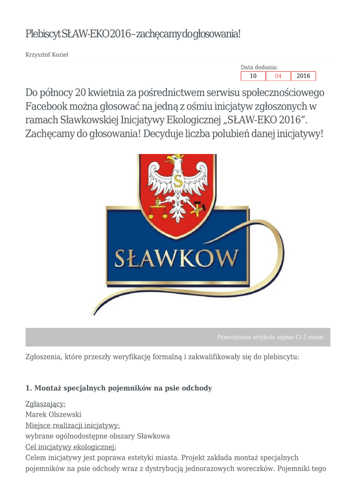 PlebiscytSŁAW-EKO2016–zachęcamydogłosowania! Krzysztof Kozieł Data dodania: 10 04 2016 Do północy 20 kwietnia za pośrednictwem serwisu społecznościowego Facebook można głosować na jedną z ośmiu inicjatyw zgłoszonych w ramach Sławkowskiej Inicjatywy Ekologicznej „SŁAW-EKO 2016”. Zachęcamy do głosowania! Decyduje liczba polubień danej inicjatywy! Przeczytanie artykułu zajmie Ci 5 minut Zgłoszenia, które przeszły weryfikację formalną i zakwalifikowały się do plebiscytu: 1. Montaż specjalnych pojemników na psie odchody Zgłaszający: Marek Olszewski Miejsce realizacji inicjatywy: wybrane ogólnodostępne obszary Sławkowa Cel inicjatywy ekologicznej: Celem inicjatywy jest poprawa estetyki miasta. Projekt zakłada montaż specjalnych pojemników na psie odchody wraz z dystrybucją jednorazowych woreczków. Pojemniki tego typu to duże udogodnienie dla wszystkich właścicieli czworonogów. Ułatwiają one właścicielom zwierząt sprzątanie po swoich pupilach. Kosze mogą zostać wyposażone dodatkowo w podajniki na zestawy higieniczne. Woreczki mogą być dostępne dla mieszkańców w siedzibie urzędu miasta i wybranych punktach na jego terenie (np. w lecznicach weterynaryjnych). Woreczki na psie odchody i kosze zmniejszą uciążliwości związane z zanieczyszczeniem miejskich chodników, parku czy ścieżki rowerowej. W ramach inicjatywy można także rozważyć wyznaczenie specjalnego miejsca na terenie miasta, które będzie służyło jako wolny wybieg dla psów. GŁOSUJ! ----------------------------------------------------------------------------2. Śladami przyrody – ścieżka edukacyjno-przyrodnicza Zgłaszający: Miejskie Przedszkole w Sławkowie Miejsce realizacji inicjatywy: ogólnodostępny plac przedszkolny Cel inicjatywy ekologicznej: Głównym celem inicjatywy będzie edukacja ekologiczna dzieci. Ścieżka będzie stanowiła bazę do prowadzenia atrakcyjnych, systematycznych i zaplanowanych zajęć dydaktyczno-wychowawczych w ogrodzie, gdzie dzieci w bezpośrednim kontakcie z przyrodą nauczą się, jak żyć z nią w zgodzie. Zagospodarowanie ogrodu przedszkolnego uczyni go piękniejszym, stanie się on przyjaznym dla dzieci i zielonym miejscem, gdzie będą się mogły one zrelaksować i wyciszyć. W wyniku realizacji projektu powstanie 6 przystanków tematycznych połączonych ze sobą ciągiem komunikacyjnym, przy których umieszczone będą kolorowe tablice informacyjno-dydaktyczne, przedstawiające i opisujące drzewa, krzewy i rośliny rosnące przy ścieżce, a także owady i ptaki. Na ścieżce znajdą się następujące przystanki: ● ● ● ● ● „Przystanek informacyjny” – będzie to miejsce z tablicą, na której umieszczone zostaną zasady obowiązujące na ścieżce edukacyjnej oraz Kodeks Ekologa; „Królestwo zmysłów” – dzięki posadzonym drzewom, krzewom i kwiatom o intensywnym zapachu pobudzony będzie zmysł węchu dzieci, które dodatkowo będą mogły obserwować jak rośliny zmieniają się z roku na rok; „Ptasie osiedle” – umieszczone przy tym przystanku budki lęgowe i karmniki dla ptaków pozwoli dzieciom obserwować i rozpoznawać ptaki z najbliższego otoczenia, a w okresie zimy je dokarmiać; Ogród ziołowo-warzywny” – w ogródku dzieci same będą mogły sadzić rośliny, dbać o nie i przyglądać się, jak z dnia na dzień rosną zioła i warzywa; „Łąka rekreacyjna” – miejsce to umożliwi dzieciom obserwację żyjących tam roślin i zwierząt, które będą dodatkowo zobrazowane na kolorowej tablicy; będzie to miejsce do wypoczynku, zabaw rekreacyjnych i zespołowych; ● ● „Leśna szkoła” – przy tym przystanku zostanie umieszczona wiata, do której będą prowadziły wszystkie dotychczasowe przystanki, i gdzie będzie można przeprowadzać ciekawe zajęcia dydaktyczne. Poprzez prowadzenie na ścieżkach obserwacji przyrodniczych oraz praktycznego działania dzieci będą miały możliwość uświadomienia sobie, że istnieje ścisła zależność między działaniem człowieka, środowiskiem a zdrowiem. Dzięki ścieżce dzieci będą mogły wzbogacić swoją wiedzę przyrodniczą i wykształcić postawy proekologiczne, a także poznawać przyrodę za pomocą wszystkich zmysłów: dotyku, węchu, wzroku, słuchu i smaku. Realizacja projektu pozwoli rozwinąć u dzieci wrażliwość ekologiczną i odpowiedzialność za przyrodę w ich najbliższym otoczeniu. GŁOSUJ! ----------------------------------------------------------------------------3. Zagospodarowanie skweru Zgłaszający: Sebastian Janda Miejsce realizacji inicjatywy: ogólnodostępny obszar miasta u zbiegu ulic Borowej, Brzozowej i Gajowych Cel inicjatywy ekologicznej: zagospodarowanie zielenią zdegradowanego i nieużytkowanego skweru. W ramach realizacji inicjatywy teren zostanie wyrównany i posprzątany, zasadzona zostanie trawa, zamontowana ekologiczna drewniana huśtawka i zespół dwóch drewnianych ławek. Cały skwer docelowo zostanie także obsadzony drzewami i krzewami, stwarzając w efekcie ciche i przyjazne miejsce wypoczynku i rekreacji na łonie przyrody dla całych rodzin, w tym dla małych dzieci. Będzie to miejsce spotkań sąsiedzkich, rozmów, a zarazem integracji, którego tak bardzo brakuje obecnie w rejonie ulicy Borowej, Brzozowej i Gajowych, ale również ulicy Hrubieszowskiej. GŁOSUJ! ----------------------------------------------------------------------------4. Objęcie ochroną pomnikową drzewa o wybitnych walorach przyrodniczych Zgłaszający: nieformalna grupa społeczna (Zbigniew Zych, Jerzy Wilczak, Andrzej Szota) Miejsce realizacji inicjatywy: ogólnodostępny obszar miasta – ulica Jodłowa Cel inicjatywy ekologicznej: ochrona cennych przyrodniczo drzew, posiadających wybitne walory przyrodnicze, krajobrazowe i kulturowe. Pośrednio celem inicjatywy będzie także zwrócenie uwagi na rolę drzew i zadrzewień śródpolnych i przydrożnych na kształtowanie prz
