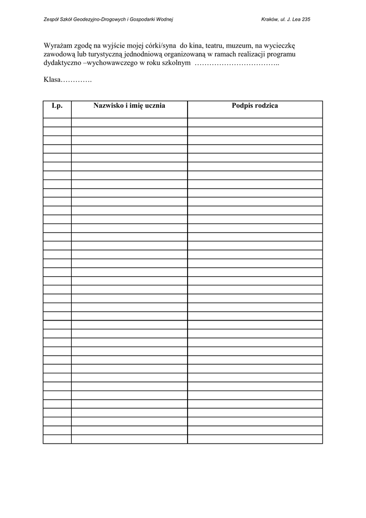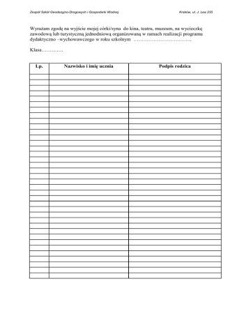 Zespół Szkół Geodezyjno-Drogowych i Gospodarki Wodnej Kraków, ul. J. Lea 235 Wyrażam zgodę na wyjście mojej córki/syna do kina, teatru, muzeum, na wycieczkę zawodową lub turystyczną jednodniową organizowaną w ramach realizacji programu dydaktyczno –wychowawczego w roku szkolnym …………………………….. Klasa…………. Lp. Nazwisko i imię ucznia Podpis rodzica Zespół Szkół Geodezyjno-Drogowych i Gospodarki Wodnej Kraków, ul. J. Lea 235 Wyrażam zgodę na wyjazd mojej córki / syna ………………………………………………. na wycieczkę szkolną do …………………………………………..w dniach………………… Przewidywany koszt……………………/koszt dojazdu, noclegu, posiłków, powrotu/.Wpłata : Pierwsza rata…………………do dnia………………………….. Druga rata……………………do dnia…………………………... ………………………………………….. Podpis Rodzica Wyrażam zgodę na wyjazd mojej córki / syna ………………………………………………. na wycieczkę szkolną do …………………………………………..w dniach………………… Przewidywany koszt……………………/koszt dojazdu, noclegu, posiłków, powrotu/.Wpłata : Pierwsza rata………………do dnia………………………………………. Druga rata………………….do dnia………………………………………. ………………………………………….. Podpis Rodzica Wyrażam zgodę na wyjazd mojej córki / syna ………………………………………………. na wycieczkę szkolną do …………………………………………..w dniach………………… Przewidywany koszt……………………/koszt dojazdu, noclegu, posiłków, powrotu/.Wpłata : Pierwsza rata………………do dnia………………………………….. Druga rata………………….do dnia………………………………….. ………………………………………….. Podpis Rodzica