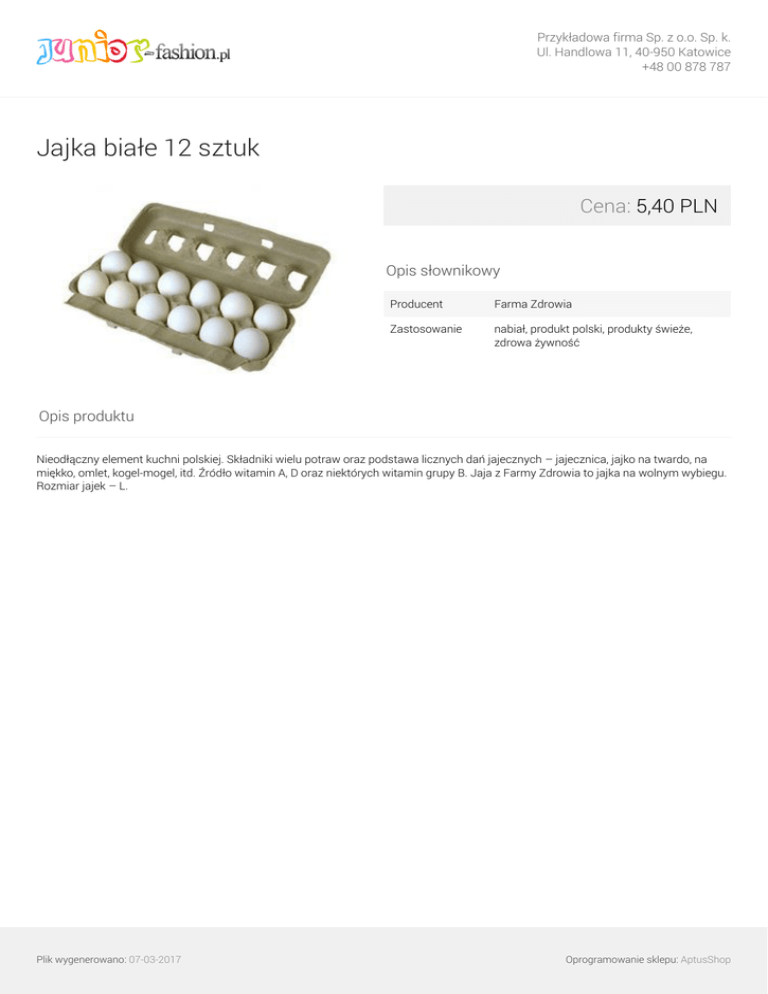 Przykładowa firma Sp. z o.o. Sp. k. Ul. Handlowa 11, 40-950 Katowice +48 00 878 787 Jajka białe 12 sztuk Cena: 5,40 PLN Opis słownikowy Producent Farma Zdrowia Zastosowanie nabiał, produkt polski, produkty świeże, zdrowa żywność Opis produktu Nieodłączny element kuchni polskiej. Składniki wielu potraw oraz podstawa licznych dań jajecznych – jajecznica, jajko na twardo, na miękko, omlet, kogel-mogel, itd. Źródło witamin A, D oraz niektórych witamin grupy B. Jaja z Farmy Zdrowia to jajka na wolnym wybiegu. Rozmiar jajek – L. Plik wygenerowano: 07-03-2017 Powered by TCPDF (www.tcpdf.org) Oprogramowanie sklepu: AptusShop