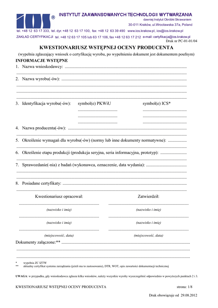 dawniej Instytut Obróbki Skrawaniem 30-011 Kraków, ul.Wrocławska 37a, Poland tel. +48 12 63 17 333, tel. dyr. +48 12 63 17 100, fax +48 12 63 39 490 www.ios.krakow.pl, [email protected] ZAKŁAD CERTYFIKACJI tel. +48 12 63 17 105 lub 63 17 106, fax +48 12 63 17 212 e-mail: [email protected] Druk nr PC-01-01/04 KWESTIONARIUSZ WSTĘPNEJ OCENY PRODUCENTA (wypełnia zgłaszający wniosek o certyfikację wyrobu, po wypełnieniu dokument jest dokumentem poufnym) INFORMACJE WSTĘPNE 1. Nazwa wnioskodawcy: ............................................................................................................... ........................................................................................................................................................... 2. Nazwa wyrobu(-ów): .................................................................................................................. ........................................................................................................................................................... ........................................................................................................................................................... ........................................................................................................................................................... 3. Identyfikacja wyrobu(-ów): symbol(e) PKWiU symbol(e) ICS* .................................... ........................................ .................................... ........................................ .................................... ........................................ 4. Nazwa producenta(-ów): ............................................................................................................ ........................................................................................................................................................... 5. Określenie wymagań dla wyrobu(-ów) (normy lub inne dokumenty normatywne): ................. ........................................................................................................................................................... 6. Określenie etapu produkcji (produkcja seryjna, seria informacyjna, prototyp): ........................ ........................................................................................................................................................... 7. Sprawozdanie(-nia) z badań (wykonawca, oznaczenie, data wydania): ..................................... ........................................................................................................................................................... ........................................................................................................................................................... 8. Posiadane certyfikaty: ................................................................................................................. ........................................................................................................................................................... Kwestionariusz opracował: Zatwierdził: ......................................................................... ......................................................................... (nazwisko i imię) (nazwisko i imię) ......................................................................... ......................................................................... (nazwisko i imię) (nazwisko i imię) ......................................................................... ......................................................................... (miejscowość, data) (miejscowość, data) Dokumenty załączone:** ..................................................................................................................... .............................................................................................................................................................. .............................................................................................................................................................. * ** wypełnia ZC IZTW aktualny certyfikat systemu zarządzania (jeżeli ma to zastosowanie), DTR, WOT, opis zawartości dokumentacji technicznej UWAGA: w przypadku, gdy wnioskodawca zgłasza kilka wniosków, należy wszystkie wyroby wyszczególnić odpowiednio w powyższych punktach 2 i 3. KWESTIONARIUSZ WSTĘPNEJ OCENY PRODUCENTA strona: 1/8 Druk obowiązuje od 29.08.2012 dawniej Instytut Obróbki Skrawaniem 30-011 Kraków, ul.Wrocławska 37a, Poland tel. +48 12 63 17 333, tel. dyr. +48 12 63 17 100, fax +48 12 63 39 490 www.ios.krakow.pl, [email protected] ZAKŁAD CERTYFIKACJI tel. +48 12 63 17 105 lub 63 17 106, fax +48 12 63 17 212 e-mail: [email protected] Druk nr PC-01-01/04 OBJAŚNIENIA Kwestionariusz ten powinien być wypełniony przez wnioskującego o certyfikat, i zwrócony razem z formularzem wniosku o certyfikację. Ma to na celu uzyskanie wstępnej informacji dotyczącej wnioskującego i jego możliwości dotyczących zapewnienia jakości. Dokument ten jest używany przez personel jednostki certyfikującej w czasie kontroli u dostawcy, tj. importera. Do kwestionariusza mogą być dołączone na oddzielnych stronach wszelkie inne dodatkowe informacje i ustalenia (w postaci załączników). Stwierdzenia powinny dotyczyć producenta w dniu wypełnienia formularza. Informacje podane w tym dokumencie są poufne. KWESTIONARIUSZ WSTĘPNEJ OCENY PRODUCENTA strona: 2/8 Druk obowiązuje od 29.08.2012 dawniej Instytut Obróbki Skrawaniem 30-011 Kraków, ul.Wrocławska 37a, Poland tel. +48 12 63 17 333, tel. dyr. +48 12 63 17 100, fax +48 12 63 39 490 www.ios.krakow.pl, [email protected] ZAKŁAD CERTYFIKACJI tel. +48 12 63 17 105 lub 63 17 106, fax +48 12 63 17 212 e-mail: [email protected] Druk nr PC-