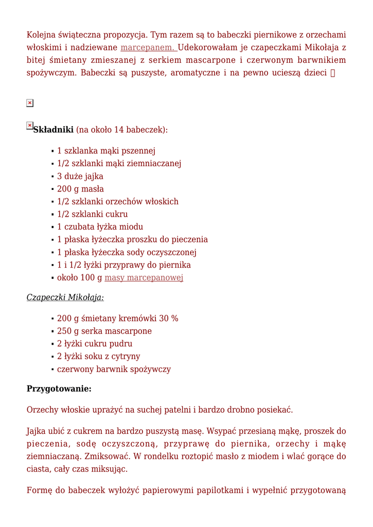 Kolejna świąteczna propozycja. Tym razem są to babeczki piernikowe z orzechami włoskimi i nadziewane marcepanem. Udekorowałam je czapeczkami Mikołaja z bitej śmietany zmieszanej z serkiem mascarpone i czerwonym barwnikiem spożywczym. Babeczki są puszyste, aromatyczne i na pewno ucieszą dzieci Składniki (na około 14 babeczek): 1 szklanka mąki pszennej 1/2 szklanki mąki ziemniaczanej 3 duże jajka 200 g masła 1/2 szklanki orzechów włoskich 1/2 szklanki cukru 1 czubata łyżka miodu 1 płaska łyżeczka proszku do pieczenia 1 płaska łyżeczka sody oczyszczonej 1 i 1/2 łyżki przyprawy do piernika około 100 g masy marcepanowej Czapeczki Mikołaja: 200 g śmietany kremówki 30 % 250 g serka mascarpone 2 łyżki cukru pudru 2 łyżki soku z cytryny czerwony barwnik spożywczy Przygotowanie: Orzechy włoskie uprażyć na suchej patelni i bardzo drobno posiekać. Jajka ubić z cukrem na bardzo puszystą masę. Wsypać przesianą mąkę, proszek do pieczenia, sodę oczyszczoną, przyprawę do piernika, orzechy i mąkę ziemniaczaną. Zmiksować. W rondelku roztopić masło z miodem i wlać gorące do ciasta, cały czas miksując. Formę do babeczek wyłożyć papierowymi papilotkami i wypełnić przygotowaną masą, do 3/4 wysokości. Z masy marcepanowej uformować kulki i po jednej wcisnąć do każdej babeczki. Piec w piekarniku nagrzanym do 175°C przez około 15 minut. Czapeczki Mikołaja: Kremówkę ubić z cukrem pudrem, dodać mascarpone, sok z cytryny i wymieszać, aż składniki się połączą. Następnie odłożyć około 1/4 kremu. Do większej ilości kremu dodać czerwony barwnik spożywczy i dokładnie wymieszać. Przełożyć do rękawa cukierniczego z okrągłą tylką i wyciskać na babeczki. Pozostałym kremem dokończyć czapeczki. Schłodzić. Smacznego Amica Dziś przedstawiam prosty przepis na pierniczki w kształcie serduszek nadziewane domową masą marcepanową i posypane czekoladowymi kamyczkami. Są naprawdę pyszne… A w zasadzie to już ich nie ma Składniki (na około 25 serduszek): 2 szklanki mąki 1 jajko 150 g margaryny (w temperaturze pokojowej) 1/2 szklanki cukru pudru 2 łyżki płynnego miodu 1,5 łyżki przyprawy do piernika 2 płaskie łyżeczki proszku do pieczenia „Delecta” około 150 g domowej masy marcepanowej Dodatkowo: kamyczki czekoladowe „Delecta” 1 białko Przygotowanie: Do miski wsypać przesianą mąkę, proszek do pieczenia, przyprawę do piernika, cukier puder i wymieszać. Dodać jajko, miód i lekko posiekaną margarynę. Wyrobić elastyczne ciasto, owinąć folią i włożyć do lodówki na 30 minut. Wyjąć i rozwałkować na około 3-4 mm (podsypując jak najmniejszą ilością mąki). Wykrawać serduszka (mają być do pary). Marcepan rozwałkować i wykrawać serduszka mniejsze od pierniczków. Na środek pierniczka położyć serduszko z marcepanu i przykryć drugim pierniczkiem do pary. Boki serduszek delikatnie docisnąć, tak aby się skleiły. Jeżeli przez sklejanie straciły swój kształt, należy ponownie przyłożyć foremkę w kształcie serca żeby je wyrównać. Gotowe pierniczki układać na blaszce wyłożonej papierem do pieczenia. Każde serduszko posmarować białkiem i posypać czekoladowymi kamyczkami. Piec w piekarniku nagrzanym do 170°c przez około 10-13 minut. Smacznego Mięciutki, lekko wilgotny i aromatyczny piernik z suszonymi śliwkami. Posypałam go tylko cukrem pudrem, ale jeśli chcecie polejcie go roztopioną czekoladą lub udekorujcie według uznania. Nie należy do tradycyjnych pierników „długo dojrzewających”, dlatego można go przygotować przed samymi Świętami i cieszyć się jego smakiem zaraz po upieczeniu Polecam Składniki: 2 czubate szklanki mąki 1 szklanka mleka 1/2 szklanki oleju rzepakowego 2 jajka 3 łyżki płynnego miodu 3/4 szklanki cukru 1 łyżka ciemnego kakao 1,5 łyżeczki sody oczyszczonej 2 łyżki przyprawy do piernika 200 g suszonych śliwek Przygotowanie: Jajka ubić z cukrem na bardzo puszystą masę. Dodać olej, mleko, miód, przyprawę do piernika, kakao, wsypać przesianą mąkę i sodę oczyszczoną. Zmiksować. Następnie dodać pokrojone suszone śliwki (każdą pokroić na około 5-6 kawałków) i wymieszać. Gotową masę wlać do keksówki (mierzona u góry, około 28 x 12 cm) wyłożonej papierem do pieczenia. Piec w piekarniku nagrzanym do 170°C przez około 50 minut (do tzw. suchego patyczka). Smacznego Amica Święta Bożego Narodzenia zbliżają się wielkimi krokami… To już ostatni dzwonek by upiec pierniczki. Pyszne i pachnące, które będą dekorowały Świąteczny stół. Po upieczeniu są miękkie, później troszkę twardnieją. Warto więc zrobić je wcześniej i przechowywać w szczelnie zamkniętym pojemniku, aby znowu były miękkie Składniki: 2 szklanki mąki pszennej 2 duże jajka 3 łyżeczki przyprawy do piernika 1/2 szklanki cukru pudru 100 g masła 1/3 szklanki miodu 1,5 łyżeczki sody oczyszczonej Przygotowanie: Masło roztopić i ostudzić. Pozostałe składniki przełożyć do miski, dodać roztopione masło i wyrobić elastyczne ciasto (ma być lekko klejące). Następnie rozwałkować na nie mniej niż 4 mm (podsypując jak najmniejszą ilością mąki) i wykrawać pierniczki. Piec w piekarniku nagrzanym do 170°C przez około 10 minut. Do ozdobienia: Pierniczki dekorować roztopioną czekoladą lub lukrem (cukier puder utarty z odrobiną wody lub soku z cytryny) i posypać np. cukrowymi koralikami, płatkami migdałowymi lub wiórkami kokosowymi. Smacznego