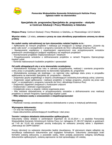 Pomorska Wojewódzka Komenda Ochotniczych Hufców Pracy ogłasza nabór na stanowisko: Specjalista ds. programów/Specjalista ds. programów – stażysta w Centrum Edukacji i Pracy Młodzieży w Gdańsku Miejsce Pracy: Centrum Edukacji i Pracy Młodzieży w Gdańsku, ul. Miszewskiego 12/13 Gdańsk Wymiar etatu: 1,0 etatu, umowa o pracę na czas określony poprzedzona umową na okres próbny Do zadań osoby zatrudnionej na tym stanowisku należeć będzie m.in.: – Aplikowanie do nowych projektów i realizacja już trwających (z byłego programu „Uczenie się przez całe życie”, w szczególności z programu Leonardo da Vinci i aktualnego Erasmus Plus) – Nawiązywanie współpracy z organizacjami zagranicznymi oraz przygotowywanie wniosków grantowych umożliwiających podjęcie współpracy we wspólnych projektach – Koordynowanie projektów międzynarodowych i lokalnych – Przygotowywanie wniosków o dofinansowanie projektów w ramach Programu Operacyjnego Kapitał Ludzki – Kontrola realizowanych budżetów projektów i sprawozdań Od osób ubiegających się o w/w stanowisko oczekujemy: – Wykształcenia wyższego oraz roku w zakresie przygotowania, realizacji i oceniania programów rynku pracy w przypadku aplikowania na stanowisko Specjalisty ds. programów – Wykształcenia wyższego lub średniego i co najmniej roku ogólnego stażu pracy w przypadku aplikowania na stanowisko Specjalisty ds. programów – stażysty – Znajomości języka angielskiego w stopniu umożliwiającym swobodną komunikację ustną i pisemną – Znajomości zasad aplikowania i realizacji projektów (z byłego programu „Uczenie się przez całe życie”, w szczególności z programu Leonardo da Vinci i aktualnego Erasmus Plus) – Znajomości zagadnień związanych z funduszami unijnymi – Kreatywności i zdolności organizacyjnych – Umiejętności pracy w zespole i dobrej organizacja pracy – Mile widziane doświadczenie w przygotowywaniu wniosków o dofinansowanie oraz realizacji projektów w ramach Programu Operacyjnego Kapitał Ludzki – Mile widziane osoby z orzeczeniem o niepełnosprawności Oferujemy: – Możliwość rozwoju zawodowego i zdobycia doświadczenia w pracy w instytucji państwowej Wymagane dokumenty: – CV oraz list motywacyjny – Kopia dokumentów potwierdzających kwalifikacje i staż pracy Termin i miejsce składania dokumentów aplikacyjnych: Dokumenty należy składać w zamkniętych kopertach do 22.10.2014 r. w siedzibie Pomorskiej Wojewódzkiej Komendy Ochotniczych Hufców Pracy (ul. Uphagena 27, 80-237 Gdańsk) w godzinach od 7.45 do 15.45 lub przesyłać pocztą tradycyjną na wskazany powyżej adres z dopiskiem: „Rekrutacja do CEiPM Gdańsk”. Proces rekrutacji na wskazane stanowisko będzie dwuetapowy. W pierwszym etapie odbędzie się weryfikacja nadesłanych dokumentów pod względem formalnym. Dokumenty zawierające braki formalne zostaną odrzucone, a pozostałe osoby, które przejdą pozytywnie wstępną weryfikację dokumentów aplikacyjnych, zostaną zaproszone na test sprawdzający ich wiedzę. W drugim etapie z kandydatami, których wynik testu będzie pozytywny, zostanie przeprowadzona ostateczna rozmowa kwalifikacyjna z udziałem Wojewódzkiego Komendanta oraz komisji doradczej. Złożonych dokumentów nie zwracamy. Prosimy o dopisanie w aplikacji następującej klauzuli: Zgodnie z ustawą z dn. 29.08.97 r. o Ochronie danych Osobowych Dz. Ust. z 2002 poz. 101, nr 926 wyrażam zgodę na przetwarzanie moich danych osobowych zawartych w ofercie pracy dla potrzeb niezbędnych do realizacji procesu rekrutacji i selekcji na stanowisko Specjalisty ds. programów przez Pomorską Wojewódzką Komendę Ochotniczych Hufców Pracy. Administratorem Państwa danych osobowych jest Komendant Pomorskiej Wojewódzkiej Komendy Ochotniczych Hufców Pracy, ul. Uphagena 27. Państwa dane osobowe zbierane są na potrzeby rekrutacji na stanowisko Specjalista ds. programów. Zebrane dane mogą być udostępniane wyłącznie podmiotom wskazanym w przepisach prawa. Przysługuje Państwu prawo dostępu do treści swoich danych oraz ich poprawiania na warunkach określonych w ustawie z dnia 29 sierpnia 1997 r. o Ochronie Danych Osobowych. Podanie przez Państwa danych osobowych jest dobrowolne i niezbędne dla potrzeb rekrutacji. Oferty odrzucone zostaną protokolarnie zniszczone po zakończonej rekrutacji.