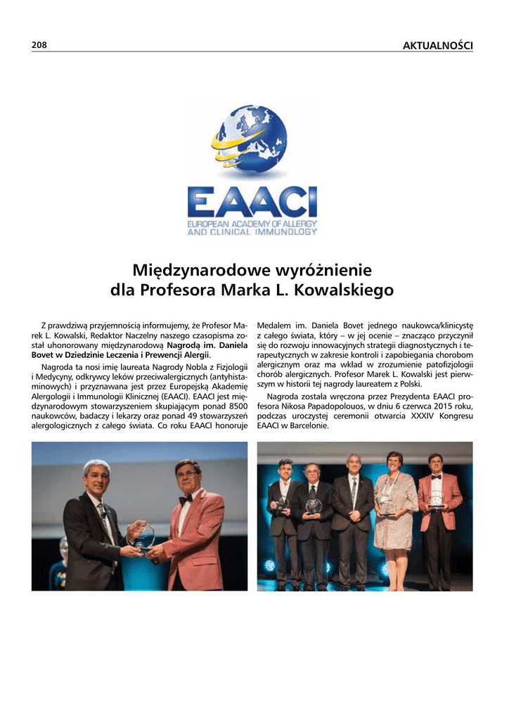 AKTUALNOŚCI 208 Międzynarodowe wyróżnienie dla Profesora Marka L. Kowalskiego Z prawdziwą przyjemnością informujemy, że Profesor Marek L. Kowalski, Redaktor Naczelny naszego czasopisma został uhonorowany międzynarodową Nagrodą im. Daniela Bovet w Dziedzinie Leczenia i Prewencji Alergii. Nagroda ta nosi imię laureata Nagrody Nobla z Fizjologii i Medycyny, odkrywcy leków przeciwalergicznych (antyhistaminowych) i przyznawana jest przez Europejską Akademię Alergologii i Immunologii Klinicznej (EAACI). EAACI jest międzynarodowym stowarzyszeniem skupiającym ponad 8500 naukowców, badaczy i lekarzy oraz ponad 49 stowarzyszeń alergologicznych z całego świata. Co roku EAACI honoruje Medalem im. Daniela Bovet jednego naukowca/klinicystę z całego świata, który – w jej ocenie – znacząco przyczynił się do rozwoju innowacyjnych strategii diagnostycznych i terapeutycznych w zakresie kontroli i zapobiegania chorobom alergicznym oraz ma wkład w zrozumienie patofizjologii chorób alergicznych. Profesor Marek L. Kowalski jest pierwszym w historii tej nagrody laureatem z Polski. Nagroda została wręczona przez Prezydenta EAACI profesora Nikosa Papadopolouos, w dniu 6 czerwca 2015 roku, podczas uroczystej ceremonii otwarcia XXXIV Kongresu EAACI w Barcelonie. 209 II Międzynarodowy Kongres „Dermatologia i Alergologia bez Granic” II Międzynarodowy Kongres „Dermatologia i Alergologia bez Granic” „Dermatologia i Alergologia bez Granic” – pod tym hasłem miało miejsce tegoroczne spotkanie naukowców zainteresowanych problematyką i aktualnymi zagadnieniami polskiej i białoruskiej dermatologii, wenerologii i alergologii. To drugi Kongres, który odbył się tym razem w Państwowym Uniwersytecie Medycznym w Grodnie w dniach 7-9 maja 2015 roku. Kongres został zorganizowany przez Katedrę Dermatowenerologii Państwowego Uniwersytetu Medycznego w Grodnie oraz Katedrę i Klinikę Dermatologii, Wenerologii i Alergologii Gdańskiego Uniwersytetu Medycznego. Patronat nad Kongresem objęło Białoruskie Towarzystwo Dermatologów i Kosmetologów. Sympozjum składało się z 5 sekcji naukowych i na każdej z nich można było wysłuchać kilku tematycznie ukierunkowanych wykładów. Wykłady prowadzone były naprzemiennie przez naukowców ze strony białoruskiej i polskiej. Stronę polską reprezentowali m.in.: prof. B. Samoliński z Warszawy z wykładem na temat projektów europejskich w dziedzinie dermatologii oraz wykładem dotyczącym anafilaksji, prof. J. Szepietowski z Wrocławia z wykładem o świądzie w atopowym zapaleniu skóry, prof. K. Buczyłko z Łodzi omawiający intrygujące zagadnienie nosa atopowego oraz prof. R. Nowicki z Gdańska z wykładem na temat skóry atopowej. W konferencji uczestniczyło szereg przedstawicieli nauk medycznych, ale także biologiczno-chemicznych, a nawet fizycznych. Oprócz przedstawicieli świata nauki nie zabrakło także czynnych zawodowo lekarzy i przedstawicieli przemysłu farmaceutycznego, przedstawicieli sprzętu laboratoryjnego i oferujących nowoczesne oprogramowania komputerowe, oraz wydawnictw specjalistycznych czasopism naukowych i branżowych. II Międzynarodowy Kongres „Dermatologia i Alergologia bez Granic” stał się wspaniałą platformą dyskusyjną nie tylko dla badaczy zajmujących się ściśle naukami dermatologicznymi i alergologicznymi, lecz również dla tych wszystkich, którzy w powiązaniu z dermatologią widzą szansę rozwoju innych gałęzi nauki. Z punktu widzenia Gdańskiego Uniwersytetu Medycznego to właśnie obecność Pana Profesora Romana Nowickiego podczas II Międzynarodowego Kongresu „Dermatologia i Alergologia bez Granic” była najbardziej kluczowa. Mianowicie, w obecności Rektora Państwowego Uniwersytetu Medycznego w Grodnie Prof. Victora Sniezyckiego, zaproszonych, licznych gości oraz zebranych uczestników konferencji, podczas I sesji inauguracyjnej Kongresu miała miejsce oficjalna ceremonia wręczenia doktoratu honoris causa prof. dr. hab. Romanowi Nowickiemu. Ze strony naszej Uczelni, podczas tej wspaniałej uroczystości udział wzięli: prorektor ds. Nauki prof. dr hab. Tomasz Bączek i były rektor prof. dr hab. Roman Kaliszan. Formalne wizyty i spotkania z przedstawicielami władz Państwowego Uniwersytetu Medycznego w Grodnie umożliwiły następnie nawiązanie i zacieśnienie współpracy międzyuczelnianej. Dopełnieniem oficjalnego programu Kongresu było dwugodzinne zwiedzanie Grodna z przewodnikiem oraz uroczysta kolacja w zjawiskowej restauracji „Zamek Zevany” zlokalizowanej w pobliskim miasteczku Korobczyce. Przemów i toastów nie było końca! Prof. dr hab. Tomasz Bączek Prof. dr hab. Roman Kaliszan