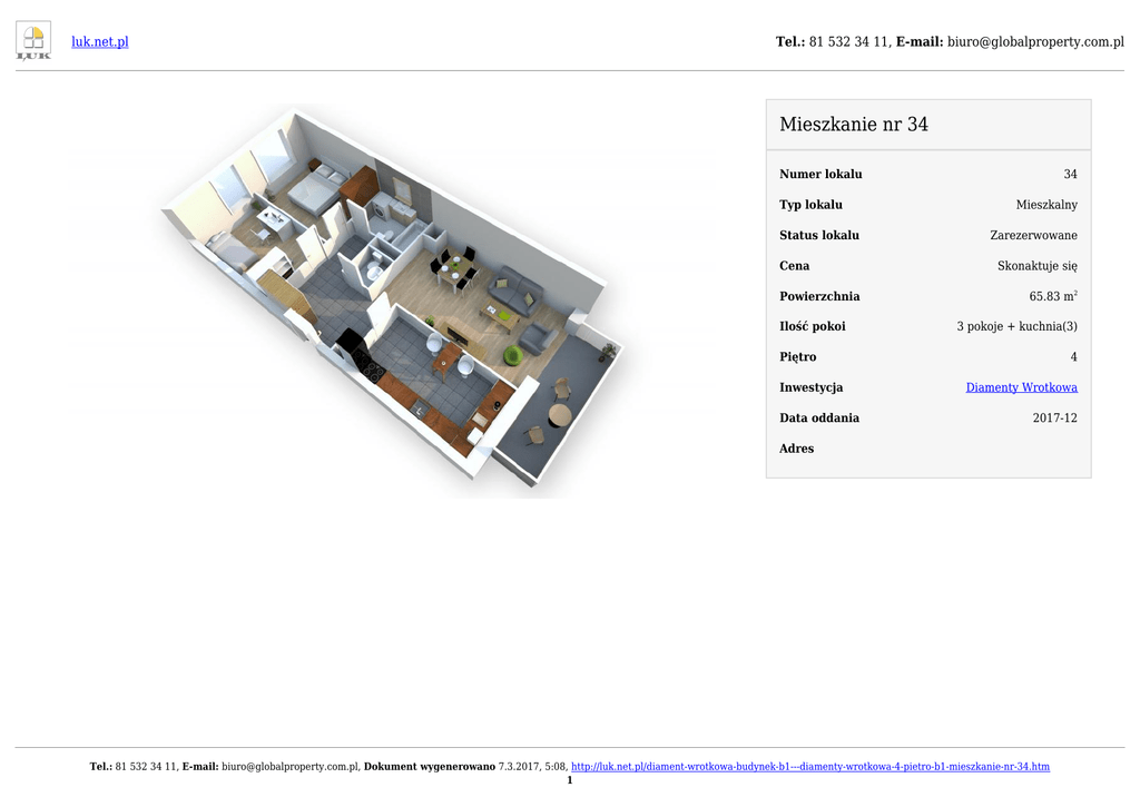 luk.net.pl Tel.: 81 532 34 11, E-mail: [email protected] Mieszkanie nr 34 Numer lokalu Typ lokalu Status lokalu Cena Powierzchnia Ilość pokoi 34 Mieszkalny Zarezerwowane Skonaktuje się 65.83 m2 3 pokoje + kuchnia(3) Piętro Inwestycja Data oddania 4 Diamenty Wrotkowa 2017-12 Adres Tel.: 81 532 34 11, E-mail: [email protected], Dokument wygenerowano 7.3.2017, 5:08, http://luk.net.pl/diament-wrotkowa-budynek-b1---diamenty-wrotkowa-4-pietro-b1-mieszkanie-nr-34.htm 1 Tel.: 81 532 34 11, E-mail: luk.net.pl [email protected] RZUT TECHNICZNY LOKALU Tel.: 81 532 34 11, E-mail: [email protected], Dokument wygenerowano 7.3.2017, 5:08, http://luk.net.pl/diament-wrotkowa-budynek-b1---diamenty-wrotkowa-4-pietro-b1-mieszkanie-nr-34.htm 2 luk.net.pl Tel.: 81 532 34 11, E-mail: [email protected] RZUT TECHNICZNY KONDYGNACJI Tel.: 81 532 34 11, E-mail: [email protected], Dokument wygenerowano 7.3.2017, 5:08, http://luk.net.pl/diament-wrotkowa-budynek-b1---diamenty-wrotkowa-4-pietro-b1-mieszkanie-nr-34.htm 3 luk.net.pl Tel.: 81 532 34 11, E-mail: [email protected] OPIS INWESTYCJI IDEALNE MIEJSCE DLA TWOJEJ RODZINY. Miło nam zaprezentować Państwu naszą nową inwestycję „ DIAMENTY WROTKOWA”, która zlokalizowana będzie przy ul. Diamentowej 27 w Lublinie. I etap inwestycji to kompleks dwóch 5-kondygnacyjnych budynków mieszkaniowych wielorodzinnych z usługami na parterze. Inwestycja będzie wyposażona w nowoczesne cichobieżne windy z bezpośrednim dostępem do garażu podziemnego. Budynki będą przystosowane do potrzeb osób niepełnosprawnych. Mieszkania będą posiadały balkony lub ogródki z możliwością indywidualnego zagospodarowania. W budynku B1 znajdować się będzie 41 lokali mieszkalnych, 1 lokal usługowy oraz 8 miejsc postojowych w garażu podziemnym. W budynku B2 znajdować się będzie 100 lokali mieszkalnych, 2 lokale usługowe oraz 22 miejsce postojowe w garażu podziemnym. Dodatkowo do dyspozycji właścicieli lokali mieszkalnych będą dostępne miejsca postojowe na parkingach zewnetrznych, z których część będzie przeznaczona na sprzedaż. Do Państwa dyspozycji będą mieszkania o wielkości od 30 do 76 m2 oraz lokale usługowe o wielkości od 43 do 90 m2. Ceny mieszkań już od 3 900,00 zł/m2 Inwestycja posiada bardzo atrakcyjną lokalizację, w niedalekiej odległości znajdują się sklepy wielobranżowe Biedronka i Lidl, szkoła podstawowa, kościół, Zalew Zembrzycki, przystanek komunikacji miejskiej. Można z niej w szybki i łatwy sposób dojechać do centrum oraz do głównych tras wylotowych Lublina. W celu uzyskania szczegółowych informacji zapraszamy do BIURA SPRZEDAŻY. SZCZEGÓŁY Tel.: 81 532 34 11, E-mail: [email protected], Dokument wygenerowano 7.3.2017, 5:08, http://luk.net.pl/diament-wrotkowa-budynek-b1---diamenty-wrotkowa-4-pietro-b1-mieszkanie-nr-34.htm 4 luk.net.pl Tel.: 81 532 34 11, E-mail: [email protected] LOKALIZACJA Tel.: 81 532 34 11, E-mail: [email protected], Dokument wygenerowano 7.3.2017, 5:08, http://luk.net.pl/diament-wrotkowa-budynek-b1---diamenty-wrotkowa-4-pietro-b1-mieszkanie-nr-34.htm 5