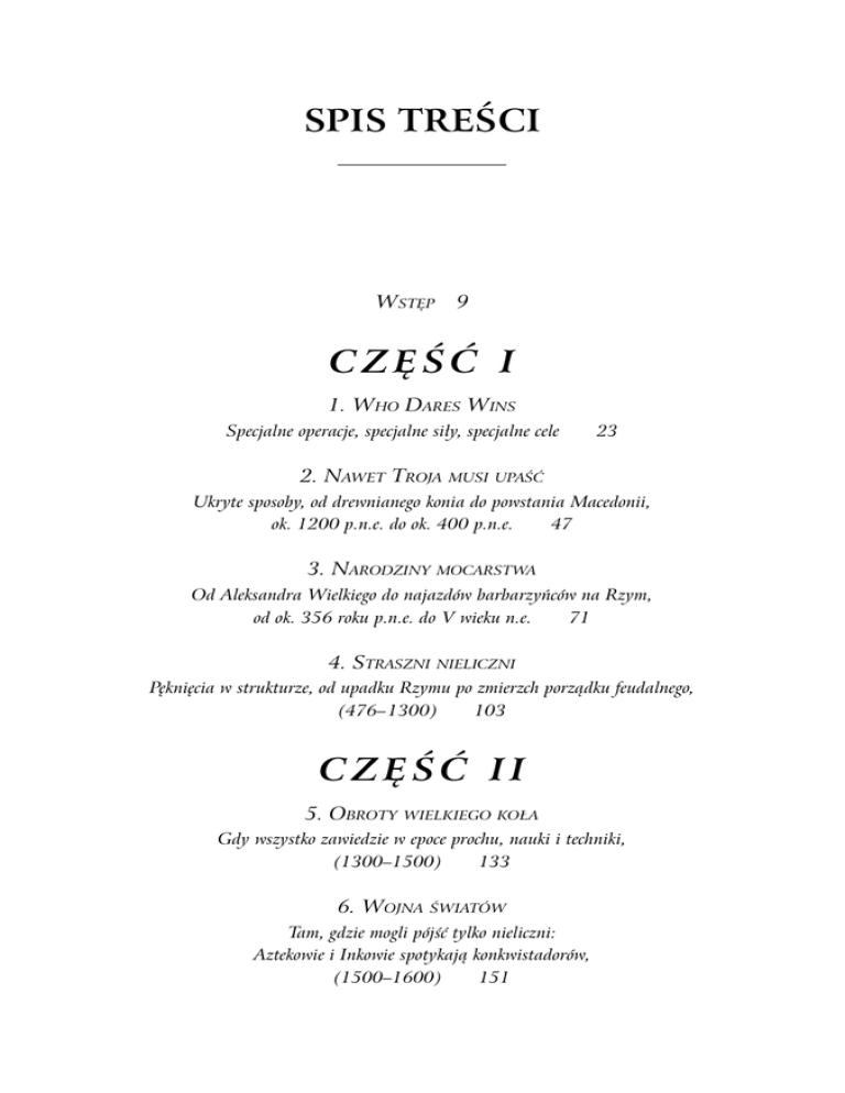 Spis treści Wstęp 9 Część I 1. Who Dares Wins Specjalne operacje, specjalne siły, specjalne cele 23 2. Nawet Troja musi upaść Ukryte sposoby, od drewnianego konia do powstania Macedonii, ok. 1200 p.n.e. do ok. 400 p.n.e. 47 3. Narodziny mocarstwa Od Aleksandra Wielkiego do najazdów barbarzyńców na Rzym, od ok. 356 roku p.n.e. do V wieku n.e. 71 4. Straszni nieliczni Pęknięcia w strukturze, od upadku Rzymu po zmierzch porządku feudalnego, (476– 1300) 103 Część II 5. Obroty wielkiego koła Gdy wszystko zawiedzie w epoce prochu, nauki i techniki, (1300–1500) 133 6. Wojna światów Tam, gdzie mogli pójść tylko nieliczni: Aztekowie i Inkowie spotykają konkwistadorów, (1500–1600) 151 6 | Zuchwali zdobywcy 7. Starcia na morzach Morskie działania specjalne: piraci, bukanierzy i imperia, z których żyli, (1522–1689) 187 8. Ryzyko nowych fortun Specjalizacja i przedsiębiorczość: Europa od zachodnich odkryć po apogeum rządów Króla Słońce, (1492–1701) 215 9. Stary i nowy świat Awangarda w Europie, Indiach i Ameryce Północnej, (1700–1775) 237 Część III 10. By sprawdzić dusze ludzkie Kontynent do zdobycia przez nieliczne siły. Zmagania Amerykanów o niepodległość i ich wrogowie, (1775–1807) 275 11. Los chwały Operacje specjalne w największej z dotychczasowych wojen: rewolucja francuska i jej skutki, (1789–1830) 311 12. Nowe granice Tam, gdzie potrzebne są specjalne talenty: powstania narodowe i ambicje globalne, (1830–1861) 343 13. Dziwaczne wypełnienia Nowe cele dla garstki śmiałków w epoce zmienionej przez parę i mechanikę, (1861–1902) 363 14. Od iskry do płomienia Alternatywne środki: od Kitty Hawk do końca wszystkich wojen, (1903–1918) 391 Spis treści | 7 Część IV 15. Złowieszczy mrok Niebezpieczni młodzi ludzie: Pozorny pokój, (1919–1939) 425 16. Jak dotąd, główne wydarzenie Wszystkie chwyty dozwolone: Stawki totalitarnych podbojów, (1939–1945) 449 17. Grzmiący świt Rozwój: nowe atuty, nowe zagrożenia, (1945–1961) 507 18. Inwazje z przyszłości Po obydwu stronach, (1961–2010) 543 Zakończenie 591 Podziękowania 599 Przypisy 601 Wybrana bibliografia 645 Indeks nazwisk 659